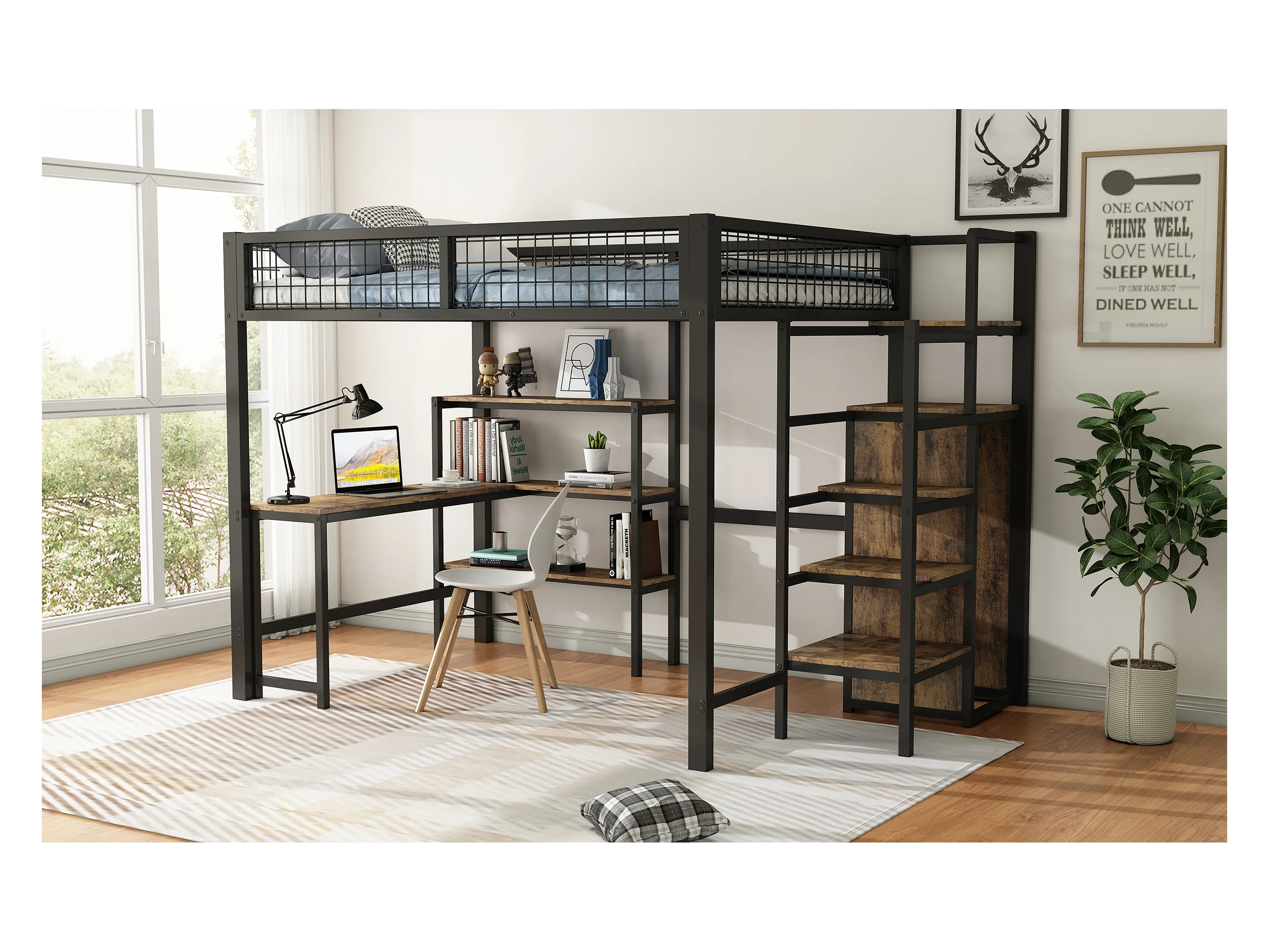 Lit mezzanine 140x200 cm, cadre en métal, échelle et étagères, sans matelas, armoire intégrée, bureau, Noir