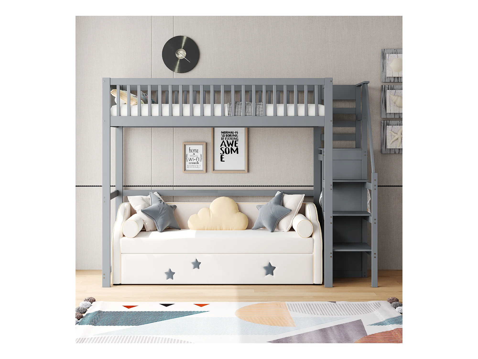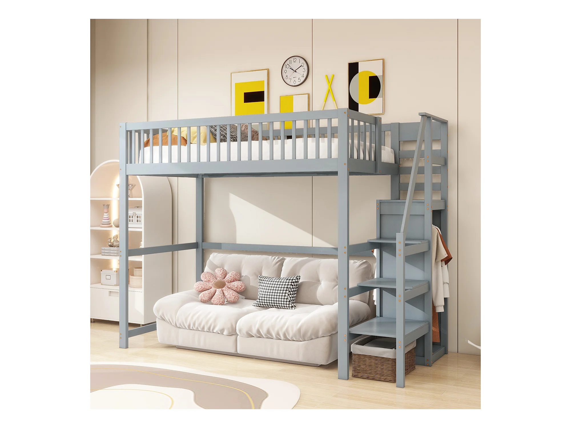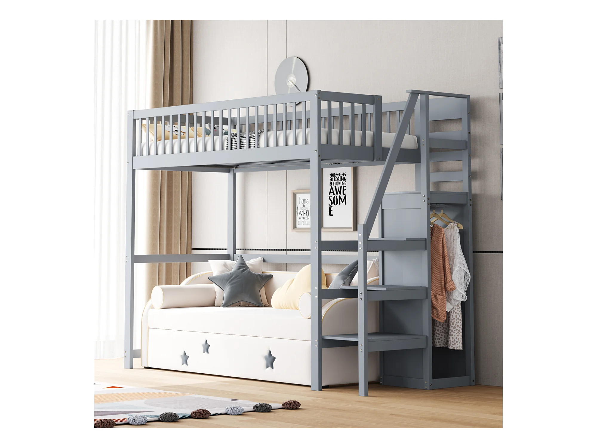 Lit mezzanine 90 x 200 cm avec armoire et escalier - Bois massif + contreplaqué + MDF - Gris (Sans matelas)