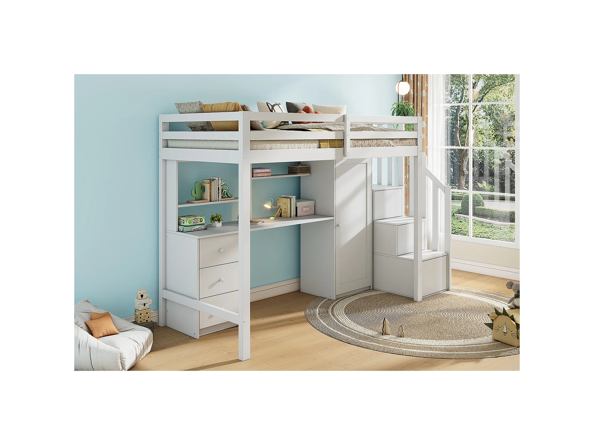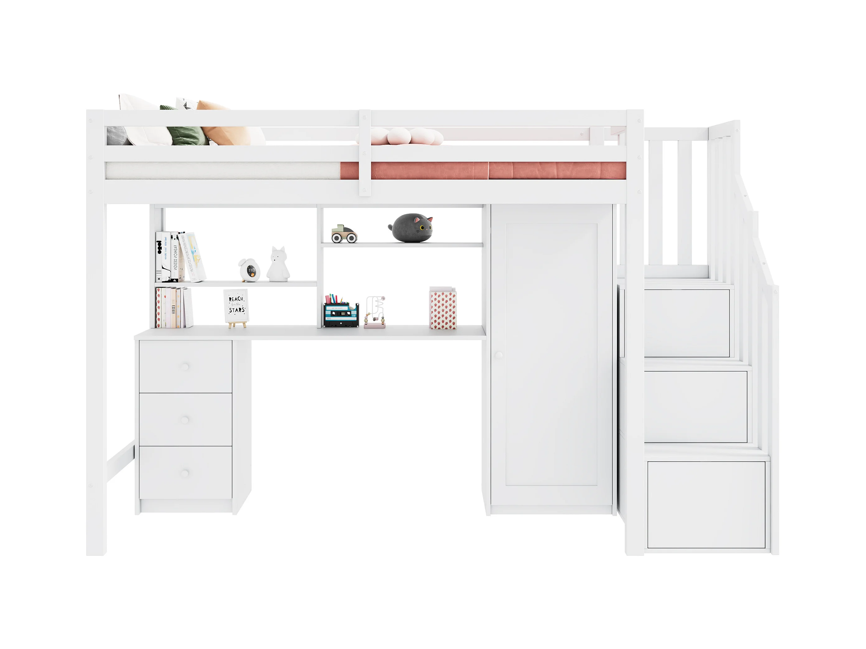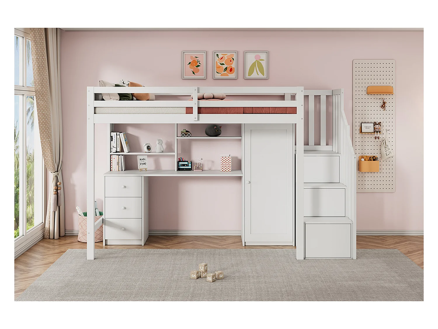 Lit mezzanine 90 x 200 cm avec bureau + 3 tiroirs et armoire + escalier de rangement - Bois - Blanc