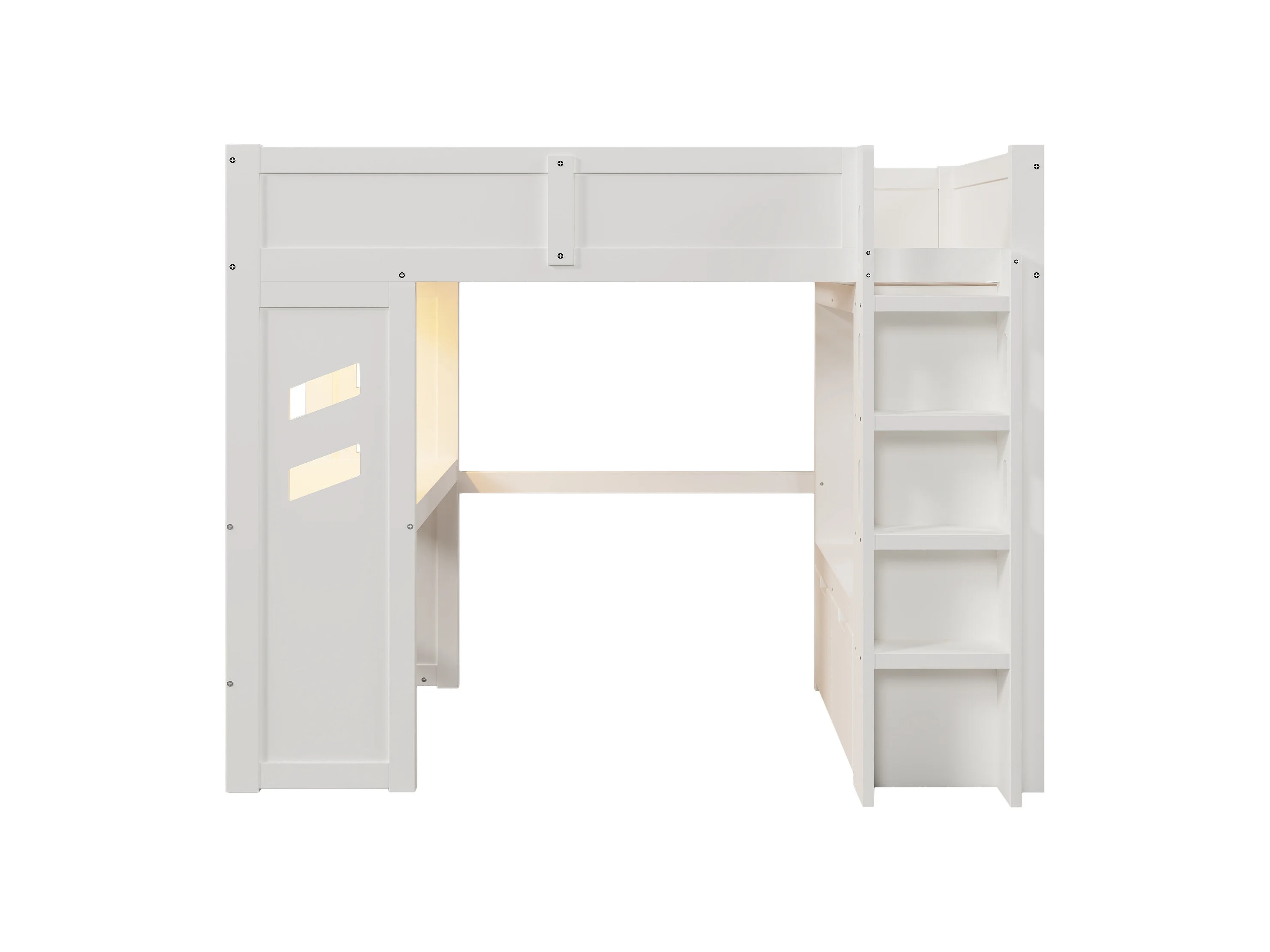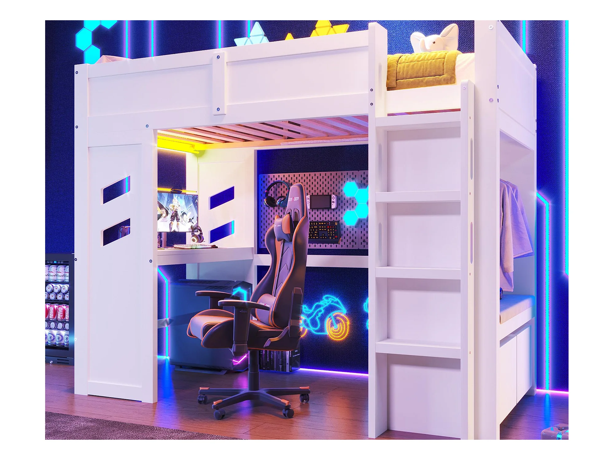 Lit mezzanine 90x200 cm - avec bureau - avec éclairage LED - avec 1 port USB - avec échelle + tiroir + étendoir - Blanc
