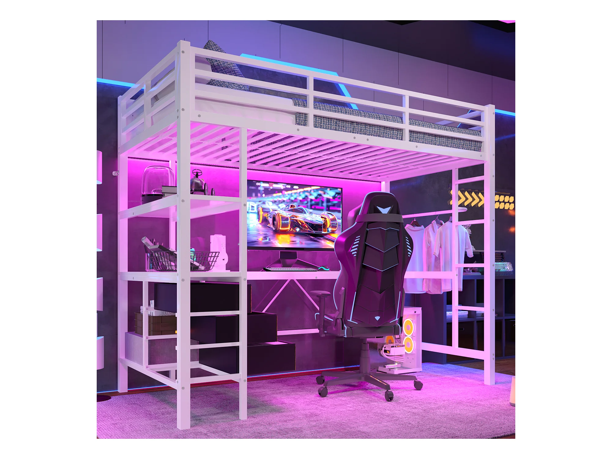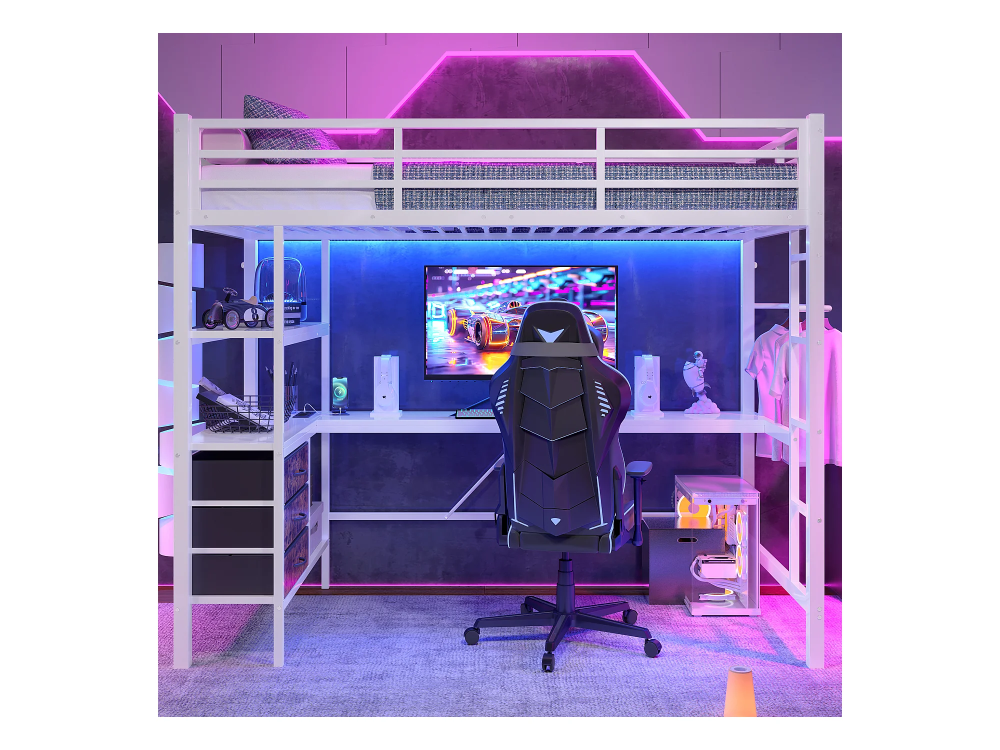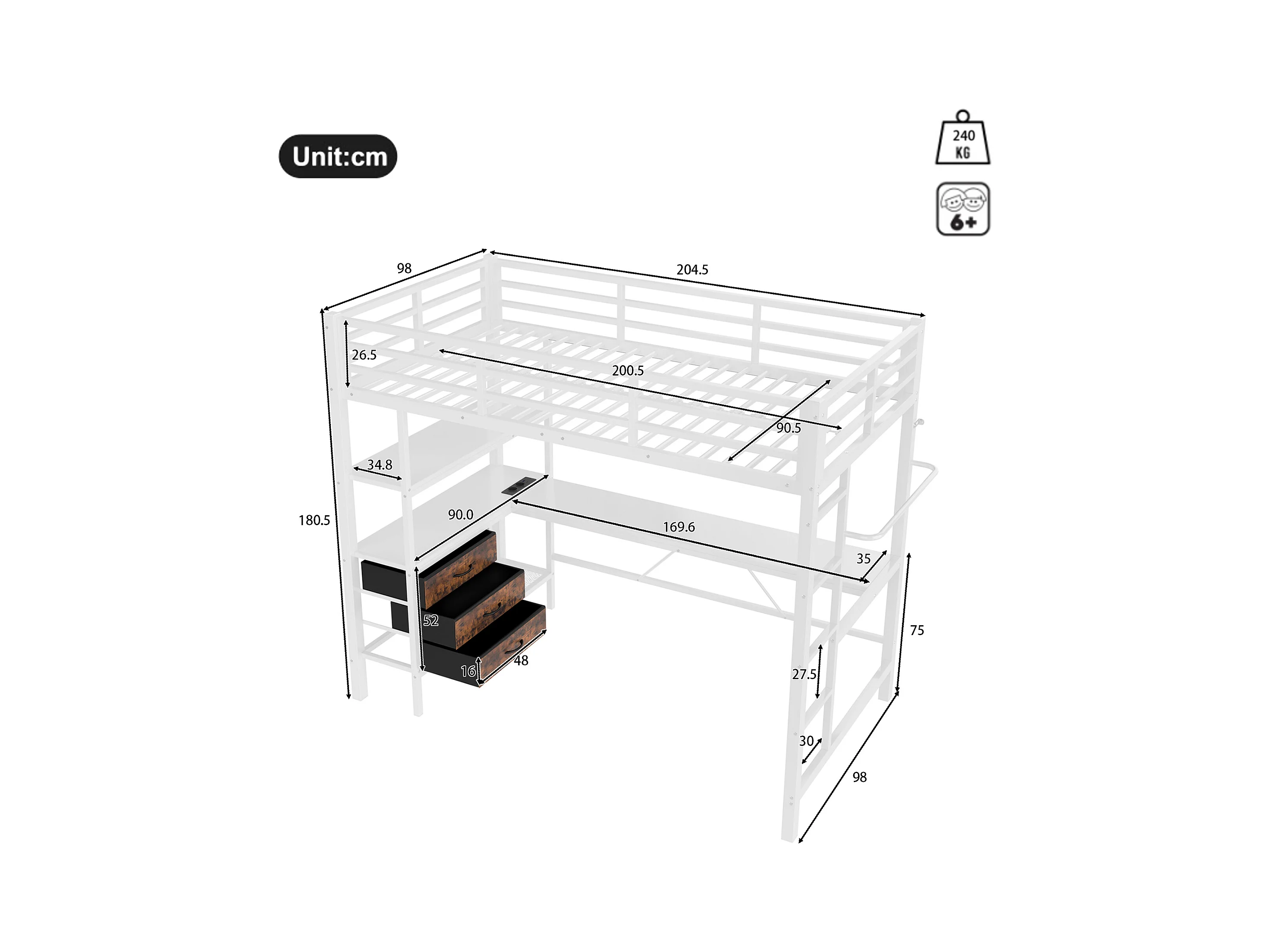 Lit mezzanine 90x200 cm - avec éclairage LED - avec bureau - avec 3 tiroirs - blanc (sans matelas)