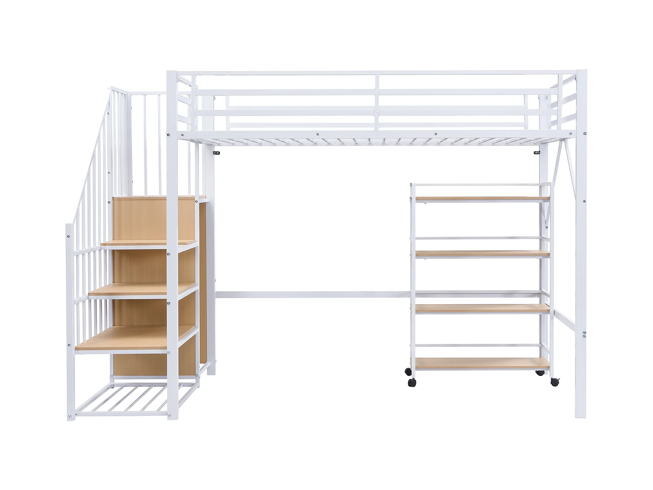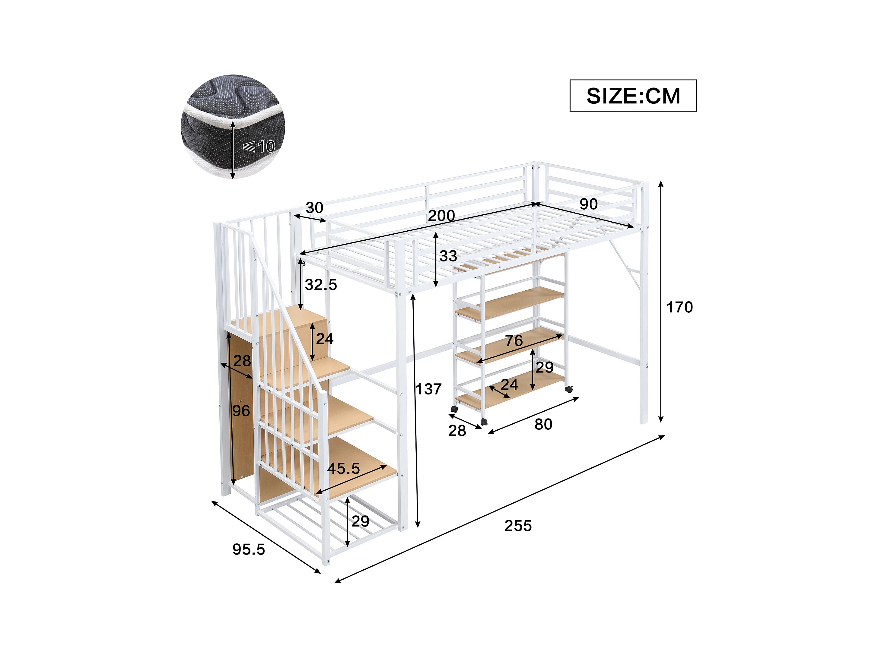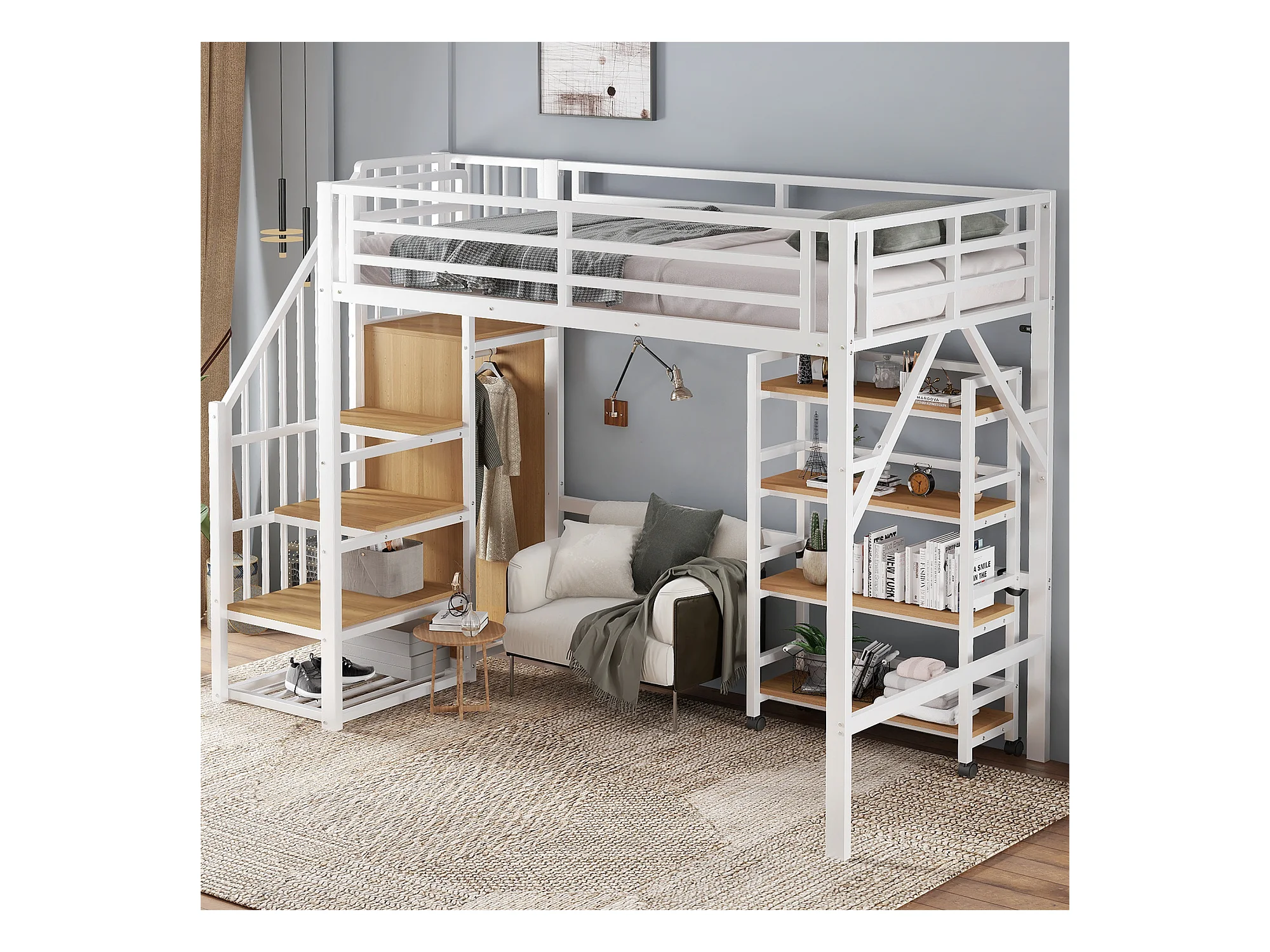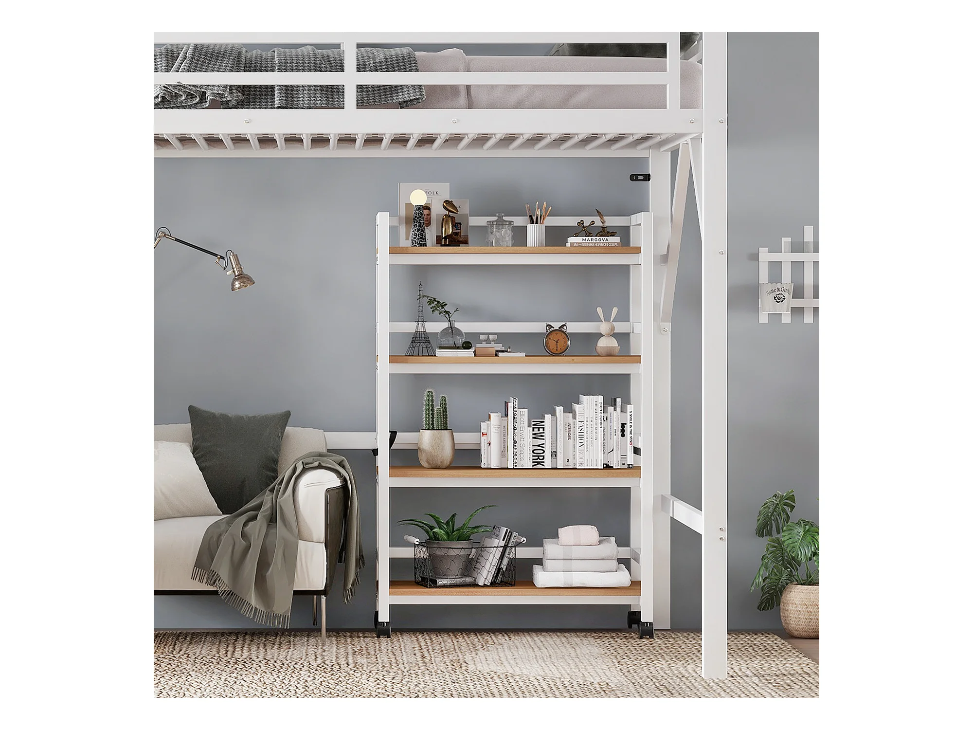 Lit mezzanine 90x200 cm - avec étagère de rangement et roulettes - avec cintre et échelle - Métal + MDF - Blanc + Naturel