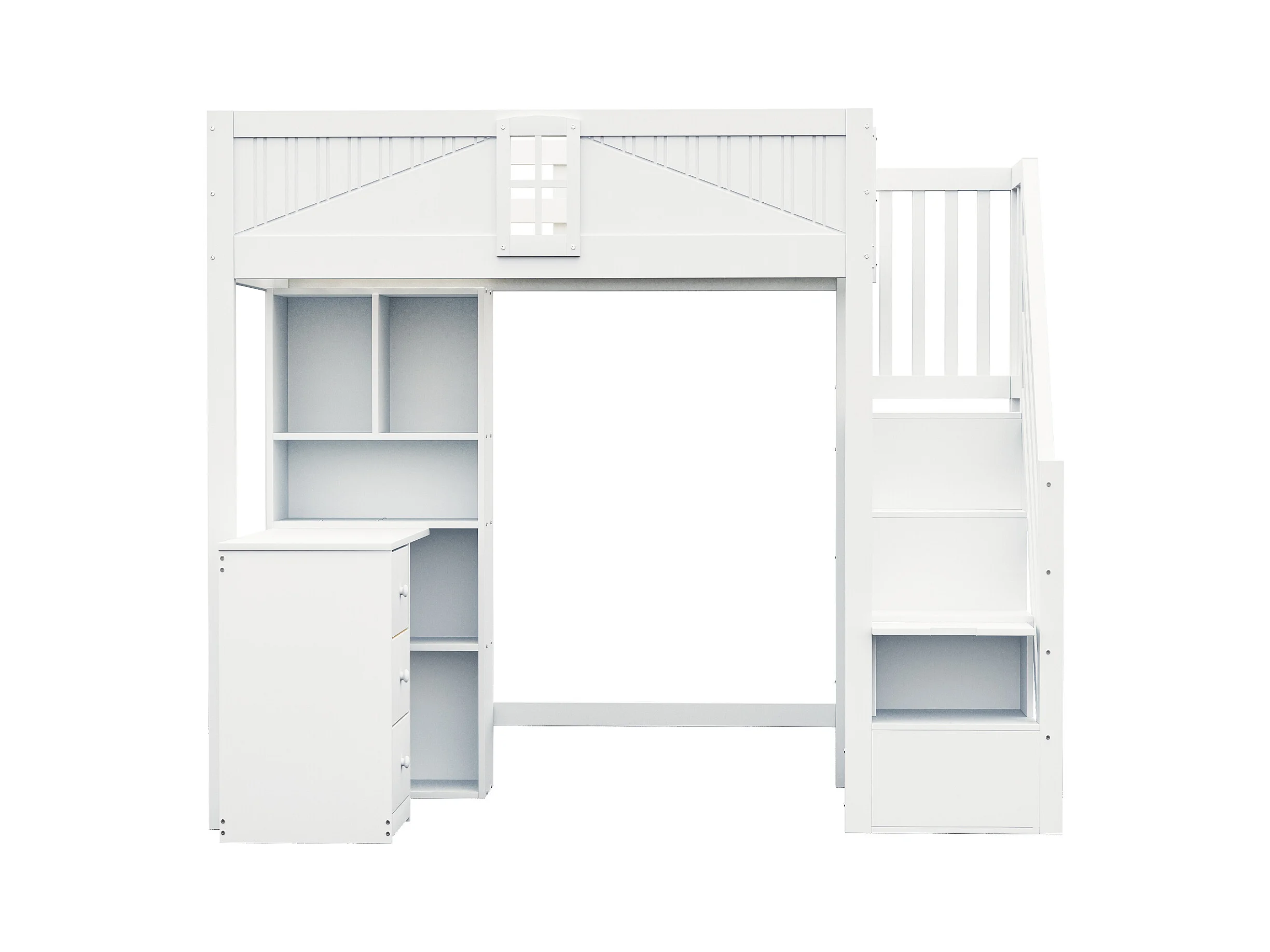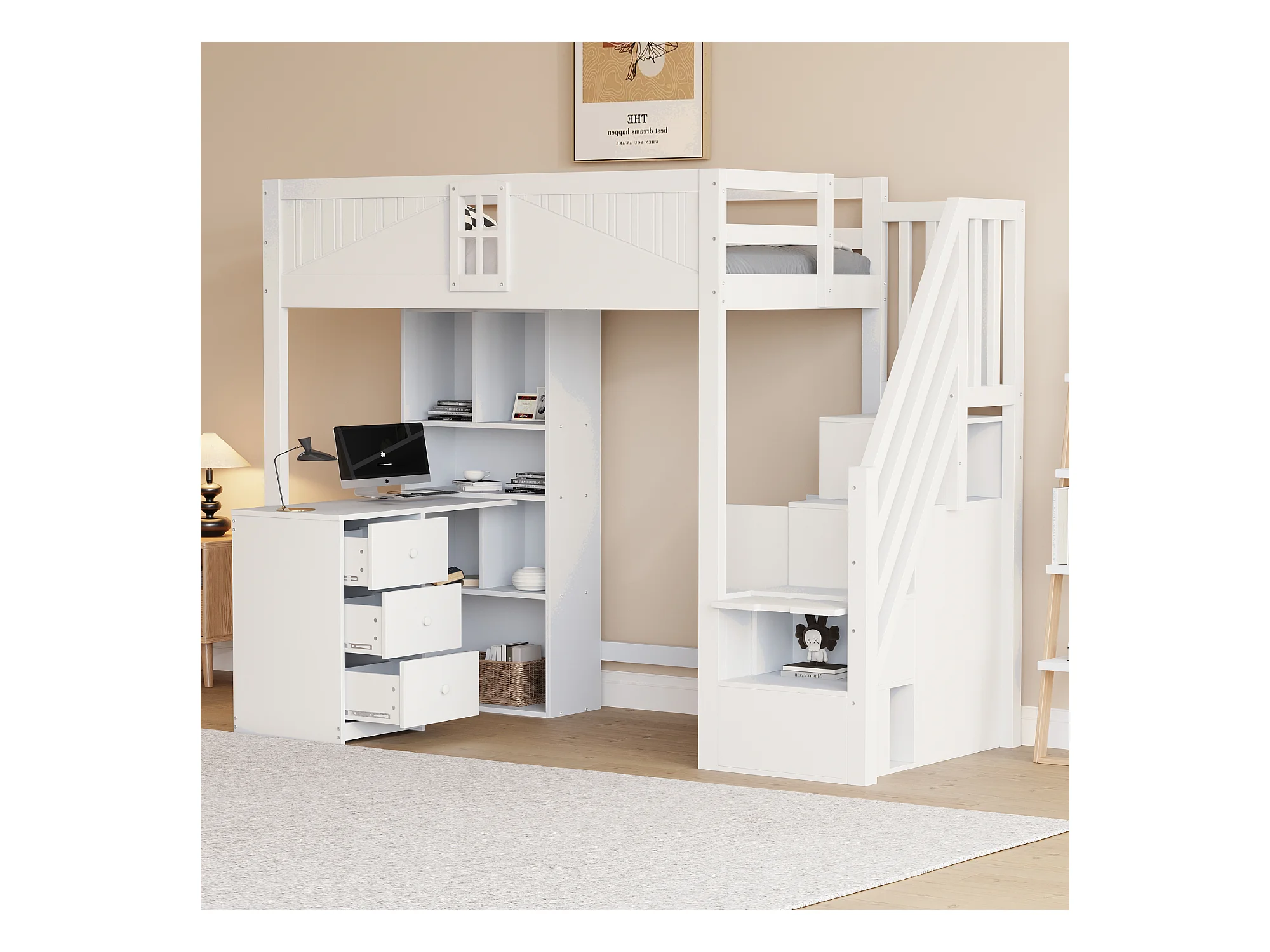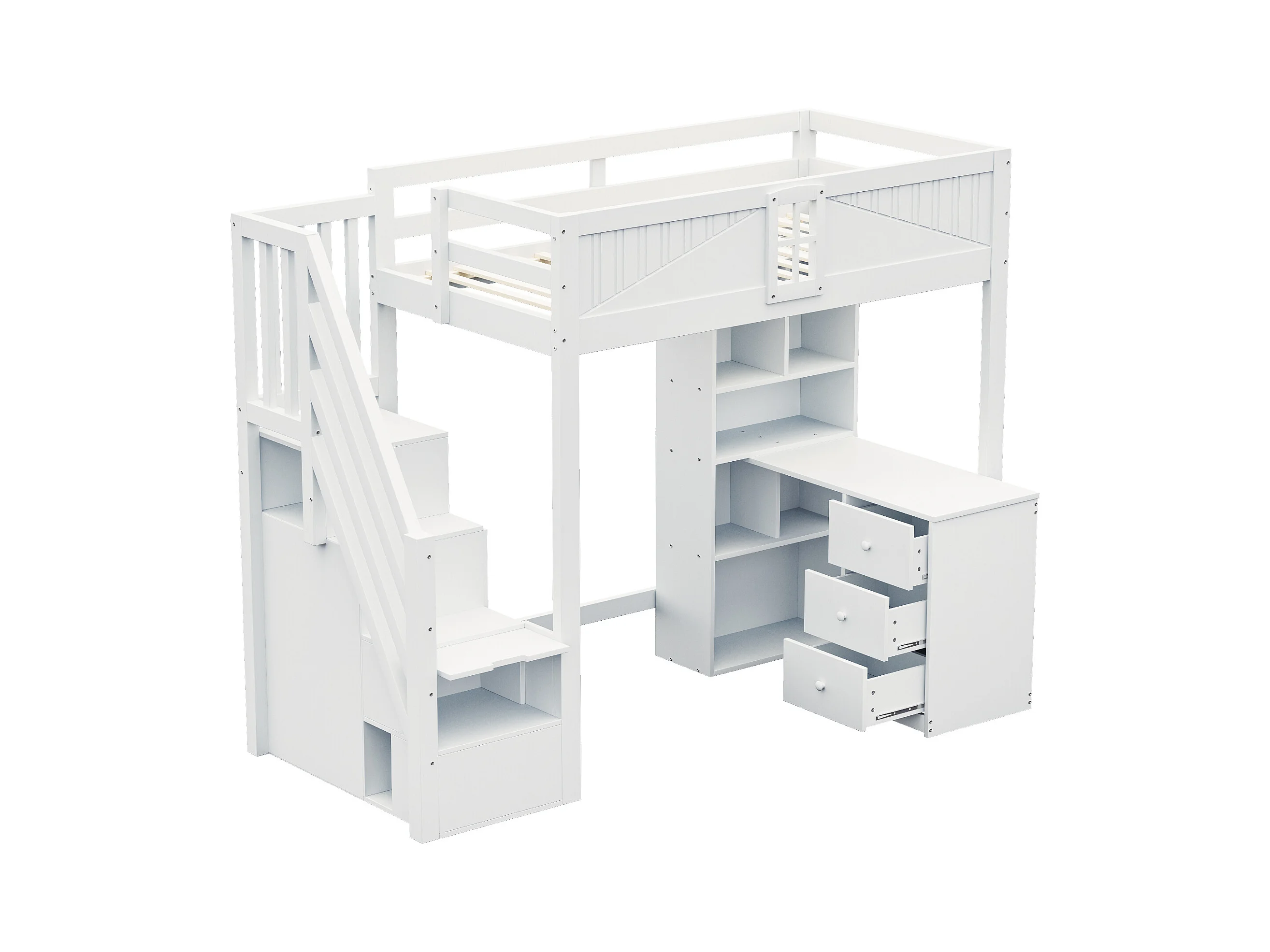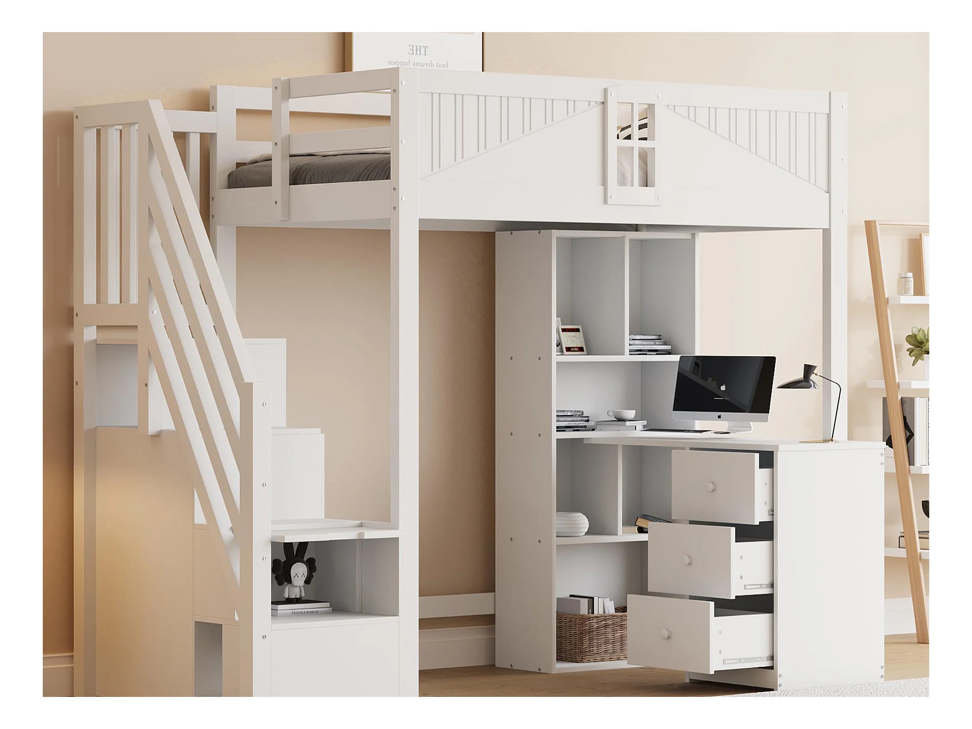 Lit mezzanine 90x200 cm - avec meuble de rangement - avec bureau + 3 tiroirs - avec poignée de sécurité - blanc (sans matelas)