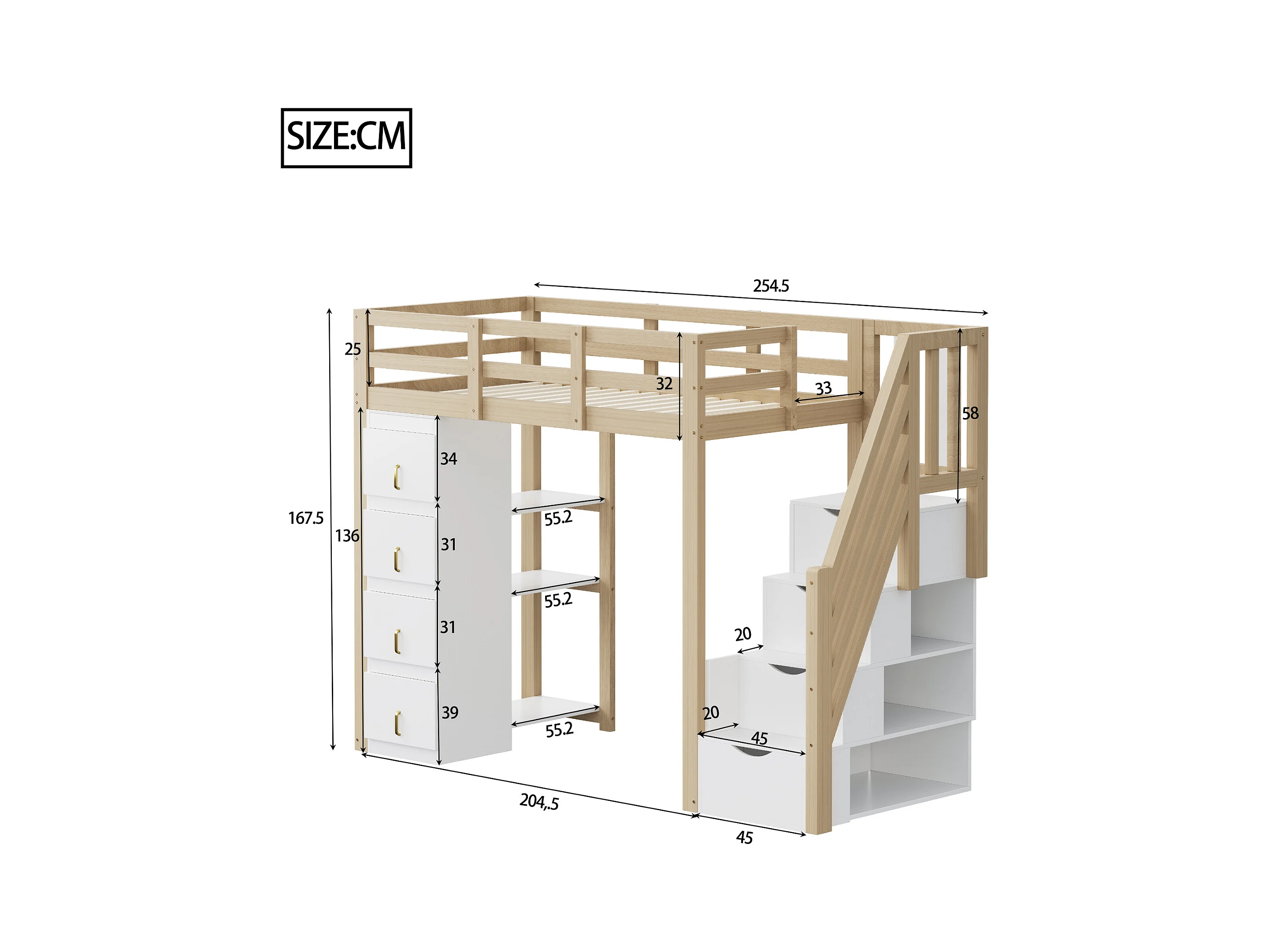 Lit mezzanine 90x200 cm avec tiroirs de rangement, étagères multiples, échelle sécurisée avec tiroirs, lit multifonction en bois massif