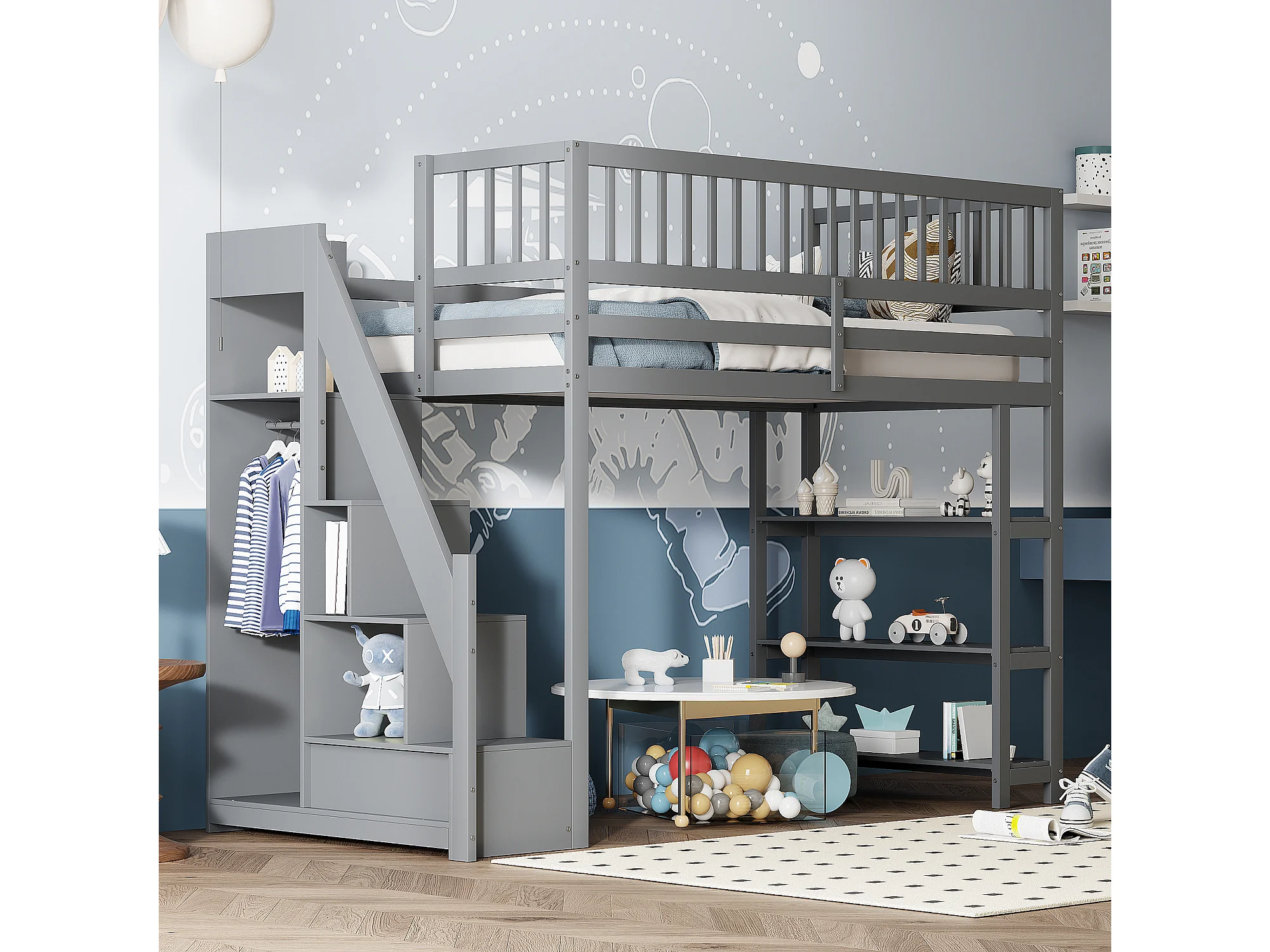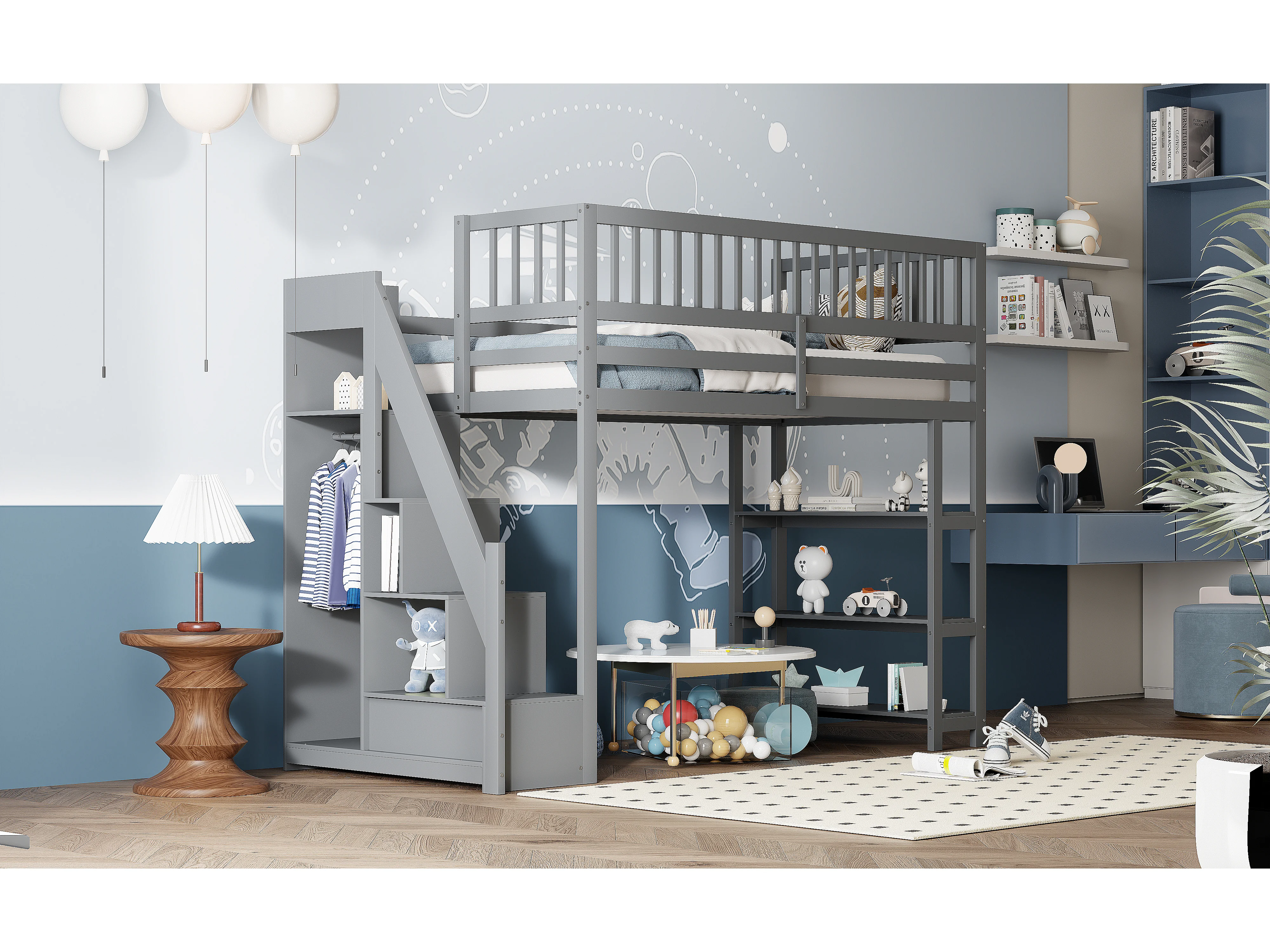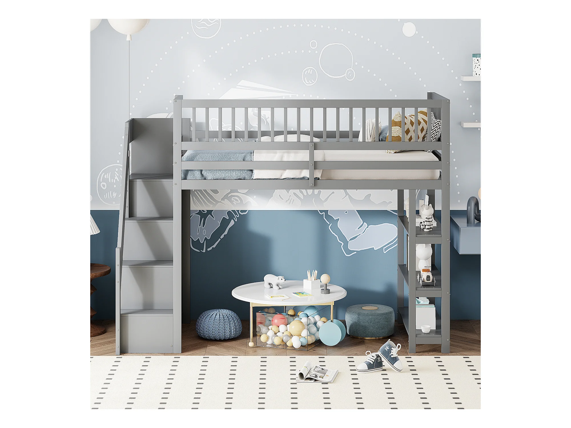 Lit mezzanine 90x200 cm, échelle de sécurité verticale, étagères et tiroirs, design à haute clôture, cadre en bois, blanc (245.5x101x159.5 cm)