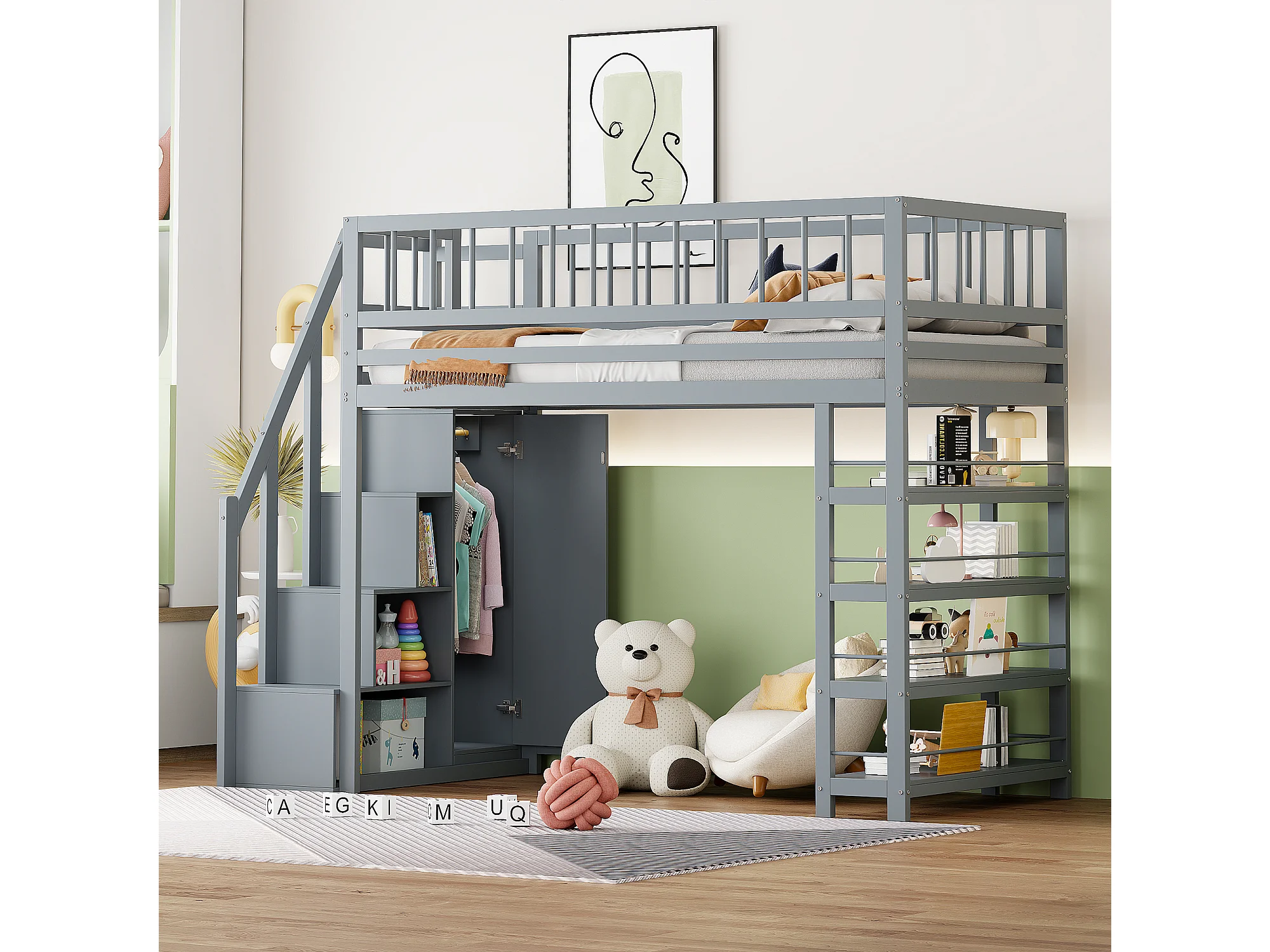 Lit mezzanine 90x200 cm gris avec échelle de sécurité, armoire et étagères, lit multifonction bois massif