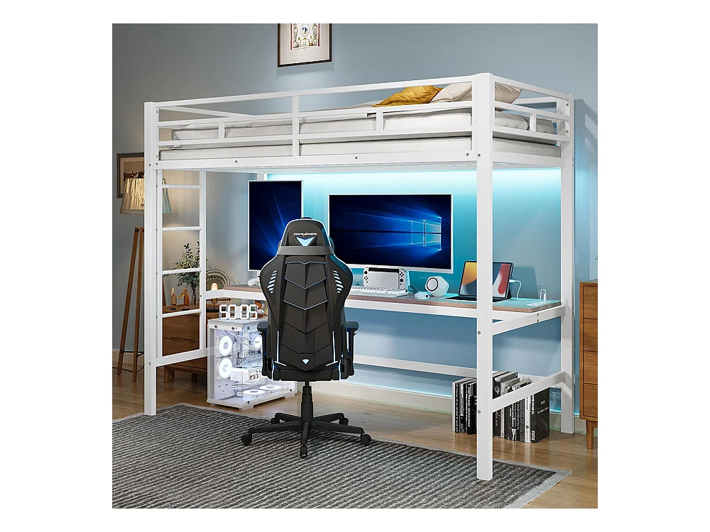 Lit mezzanine 90×200 cm rampe escabeau table avec USB et prise bande lumineuse Wire Control éclairage d'ambiance métal Blanc