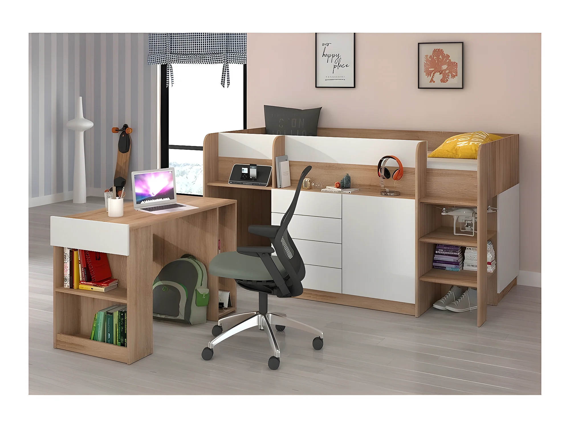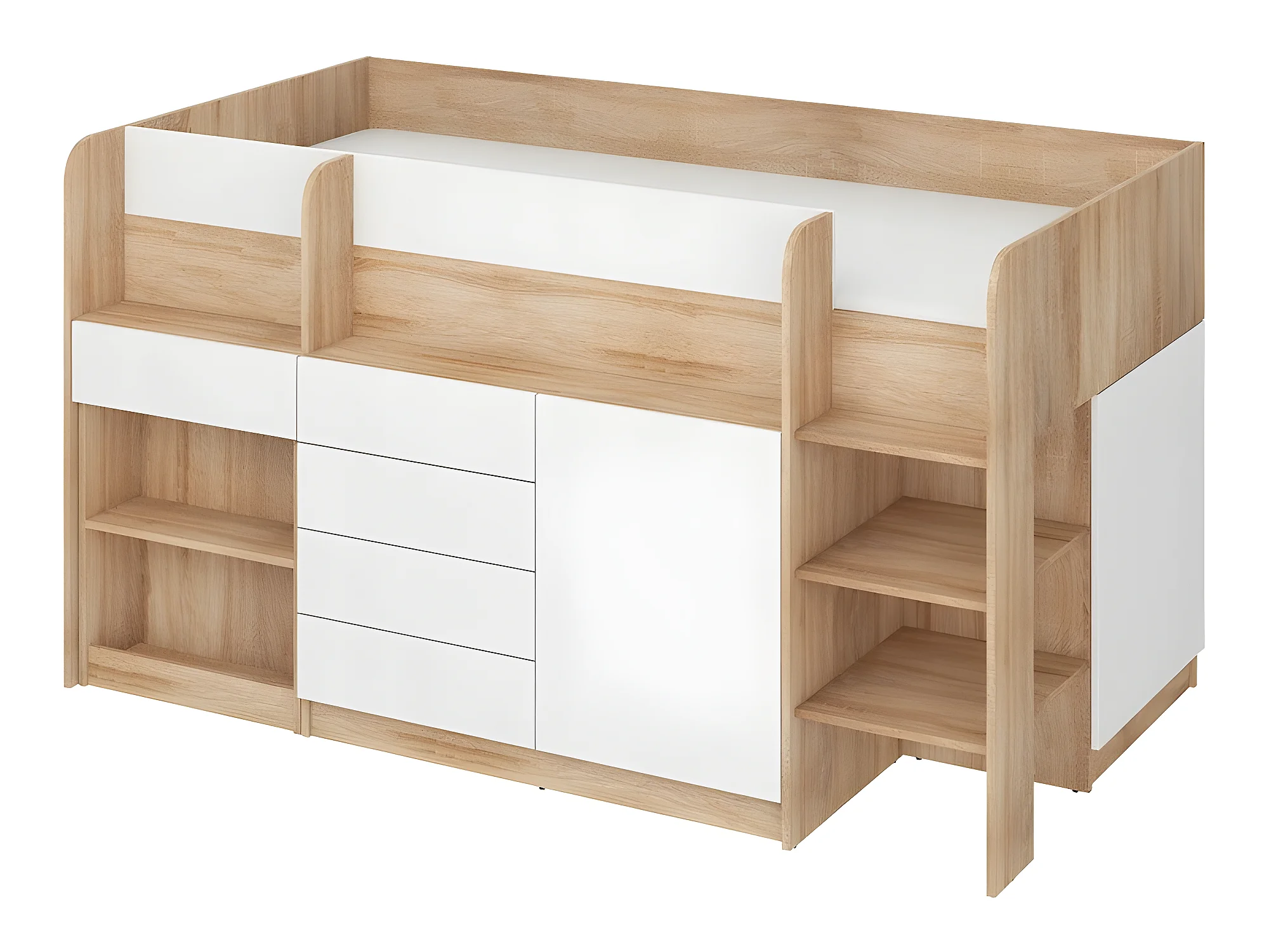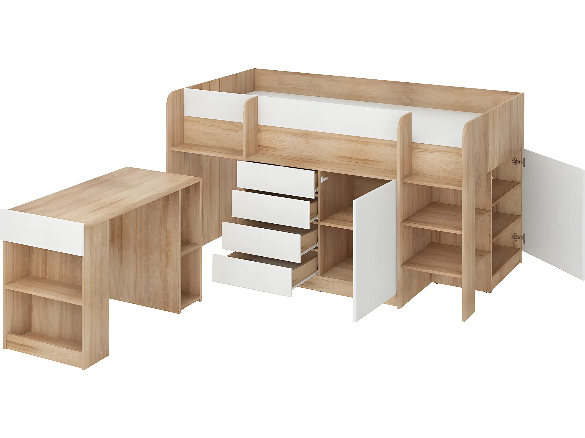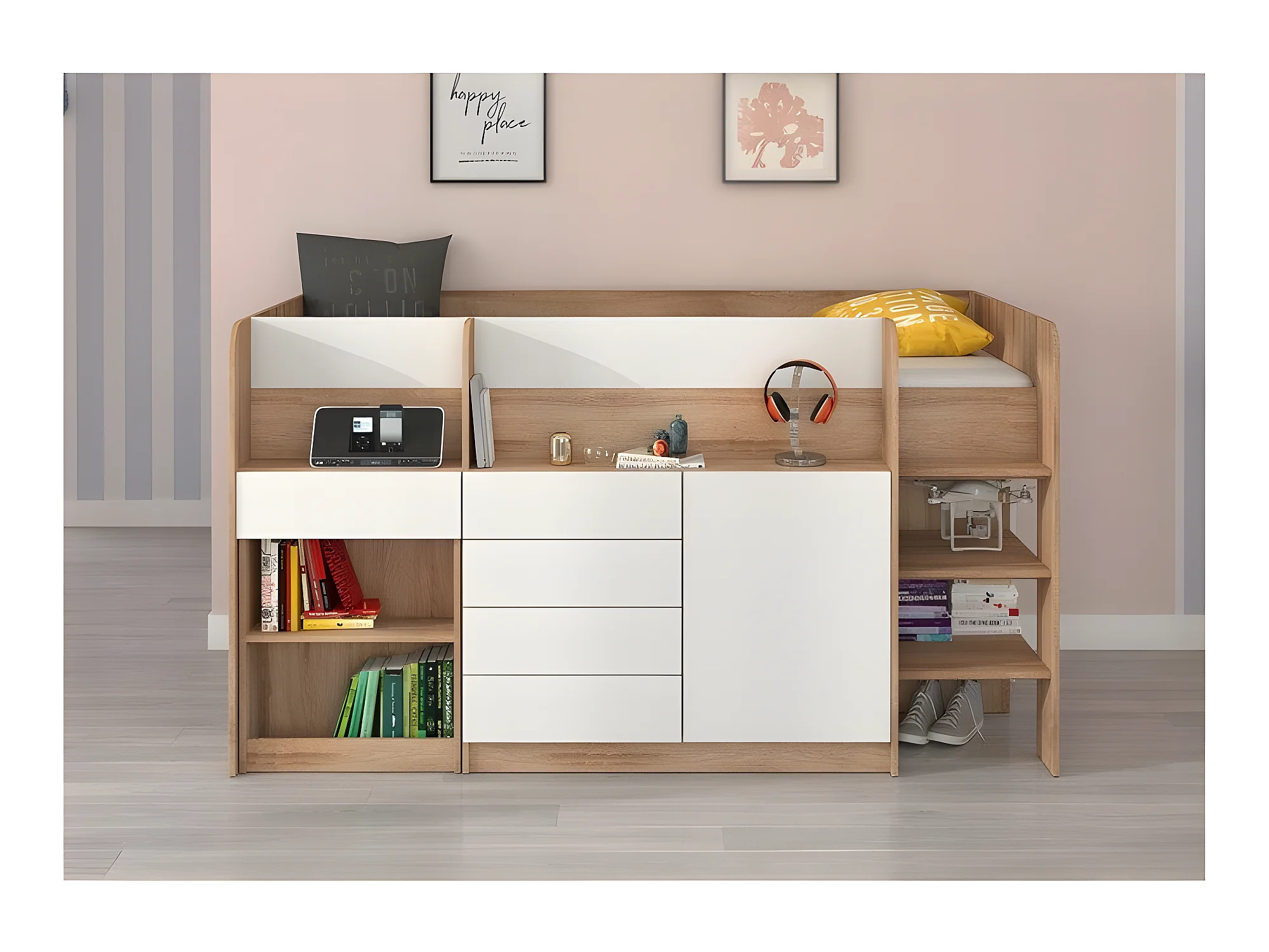 Lit Mezzanine 90x200cm avec échelle Placard, Bureau amovible, bibliothèque et des étagéres SMIDA P Chêne sonoma/Blanc