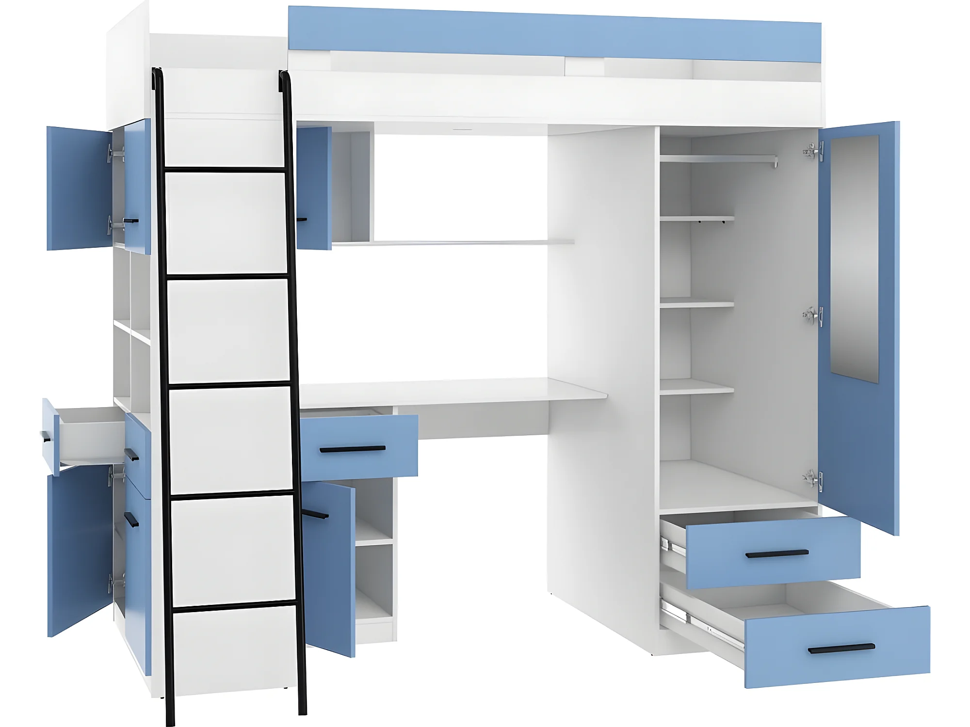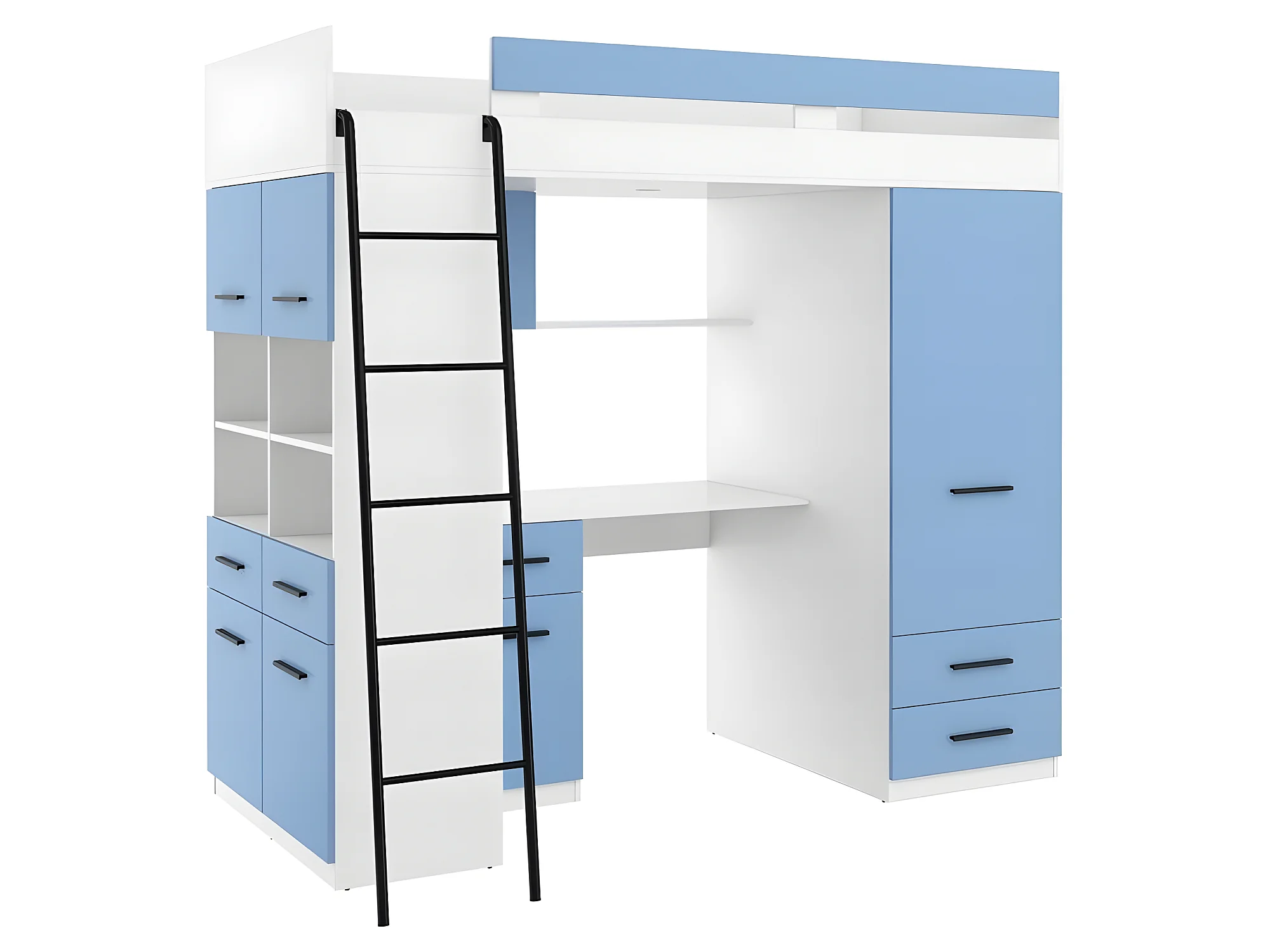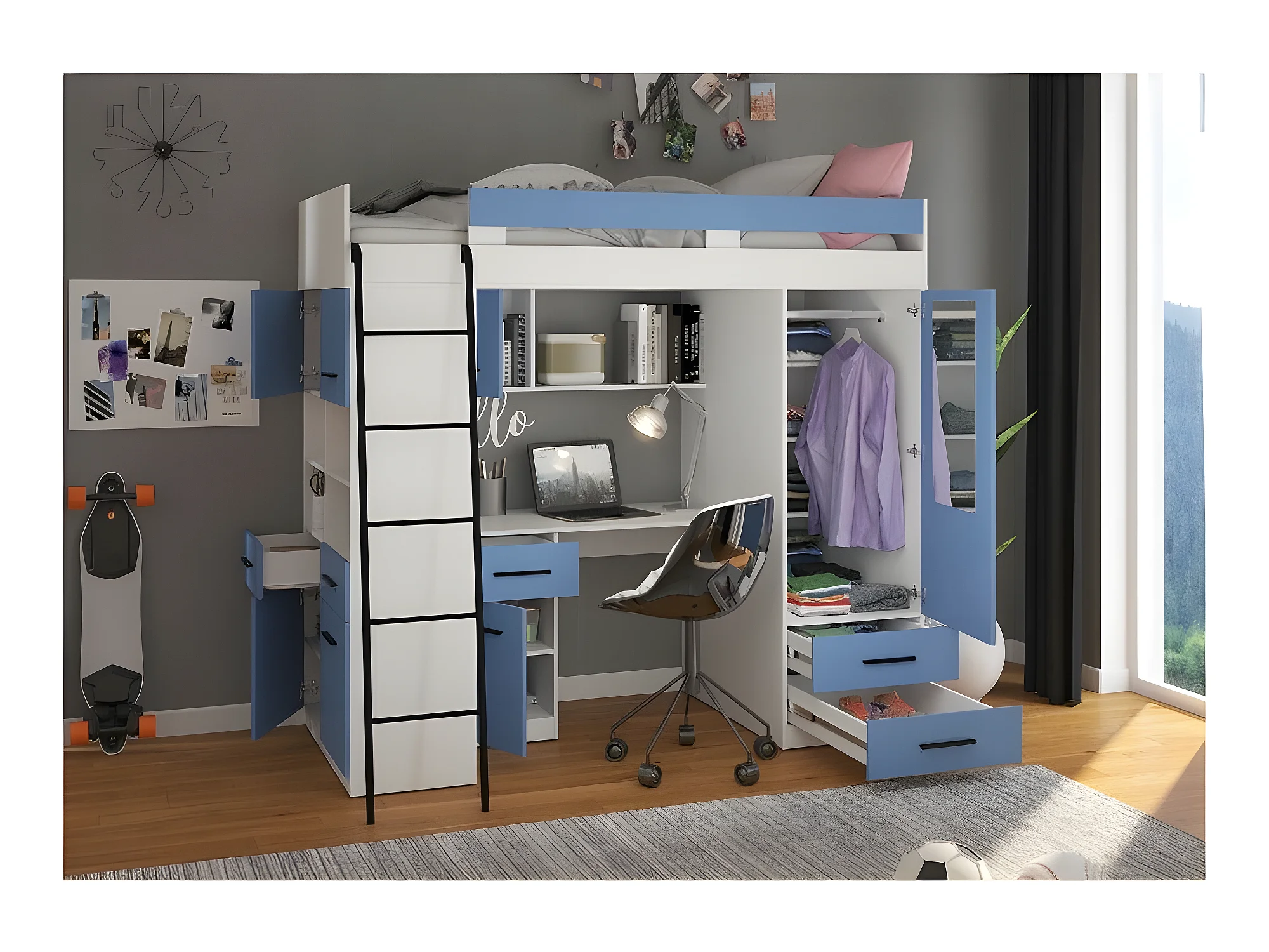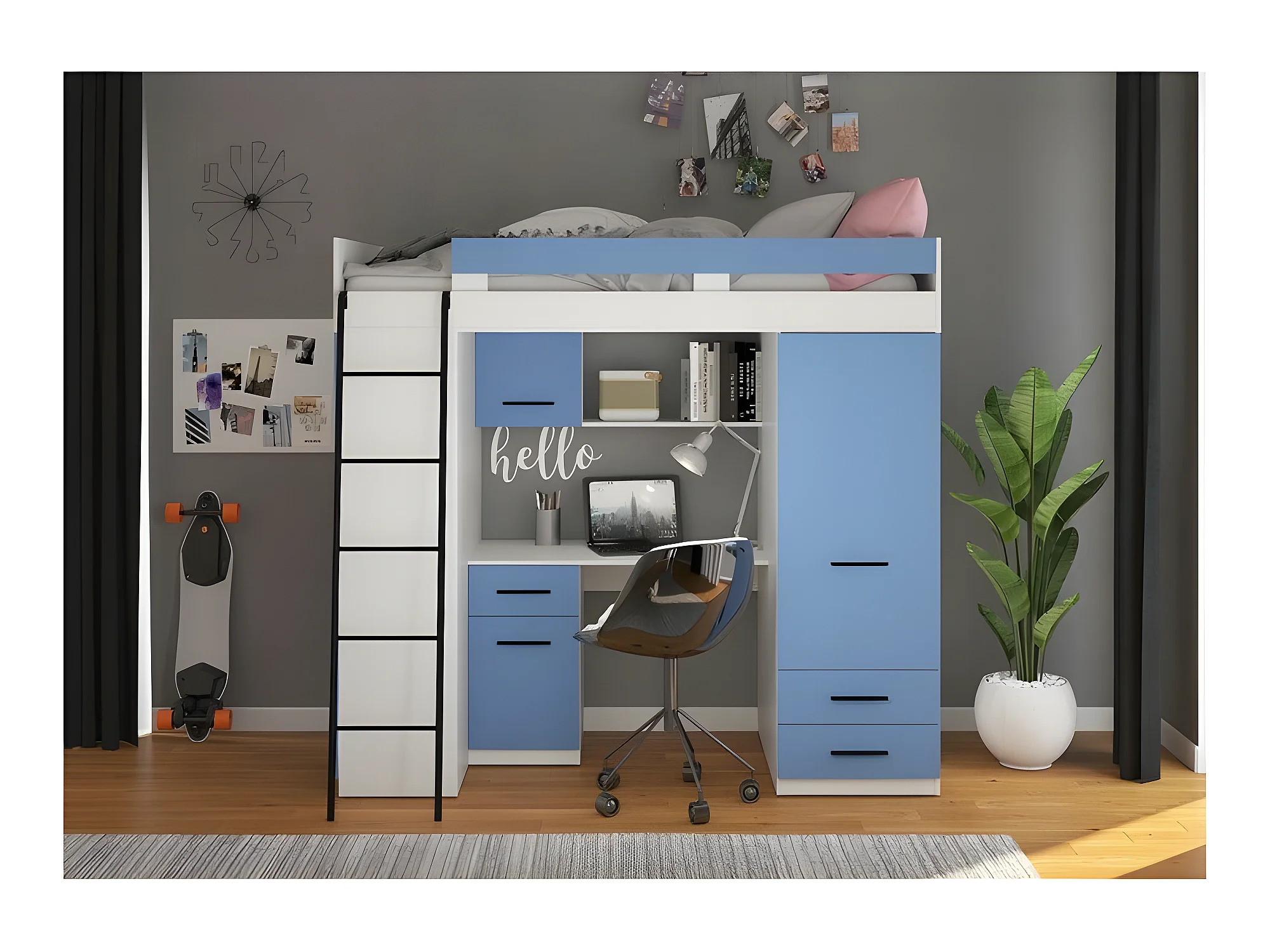 Lit Mezzanine 90x200cm avec échelle Placard, Bureau, bibliothèque et beaucoup d'étagéres LEVI L Blanc/Bleu