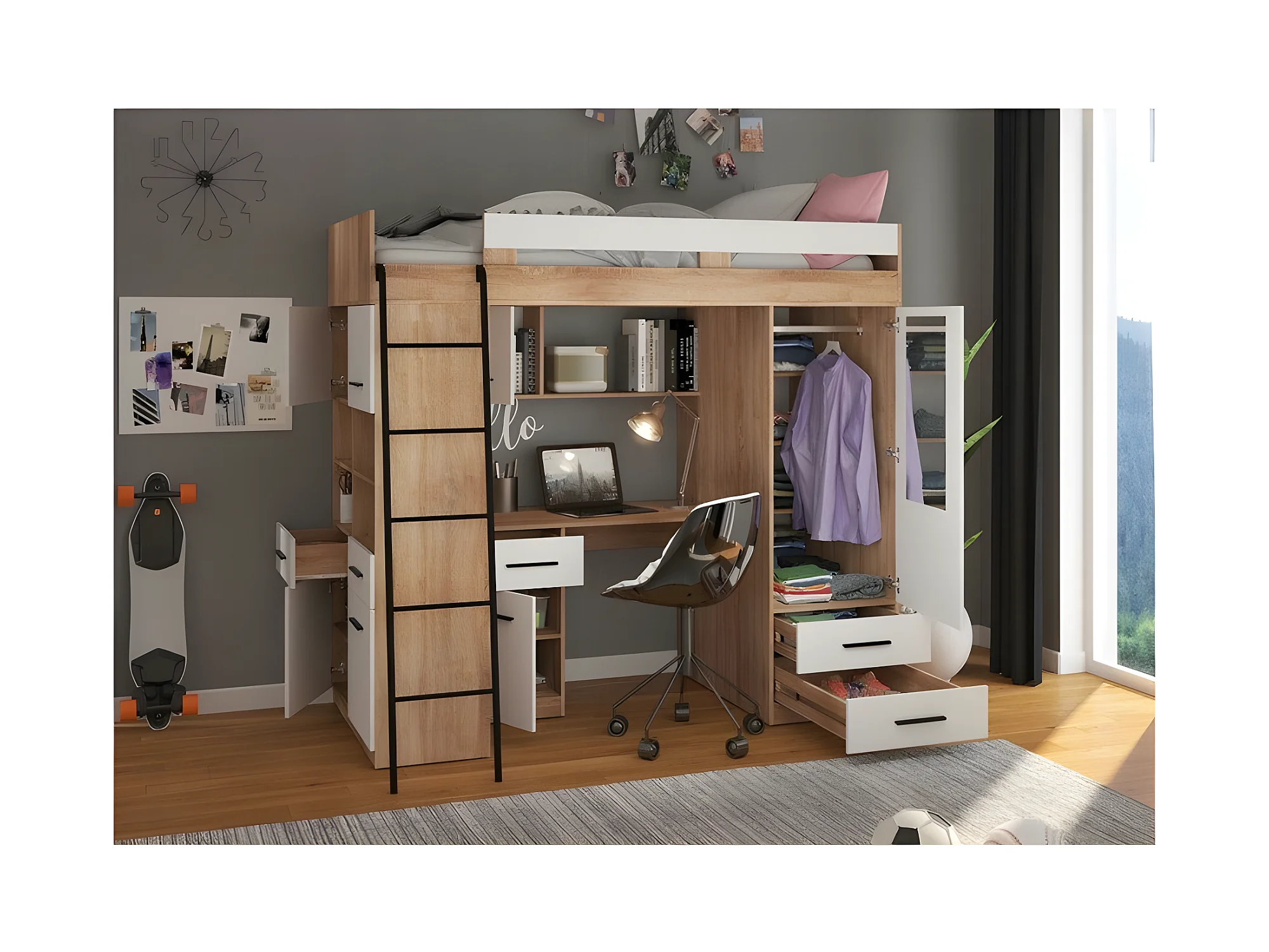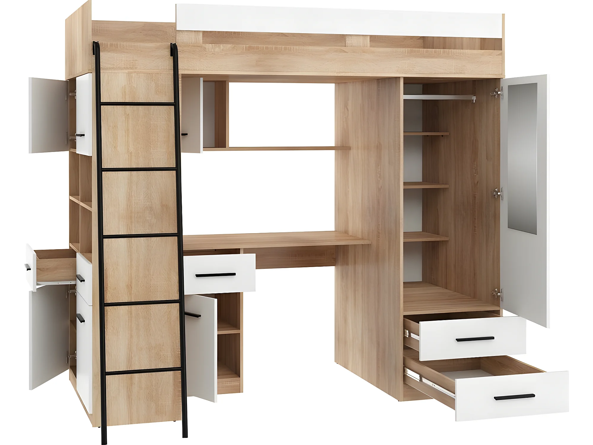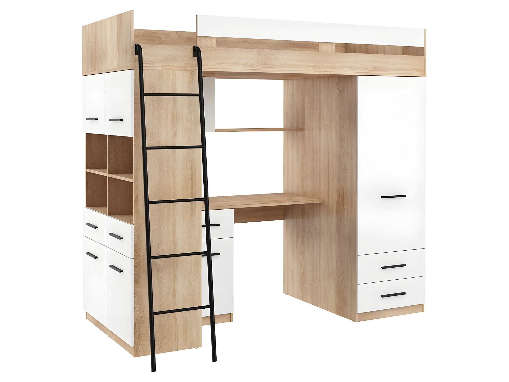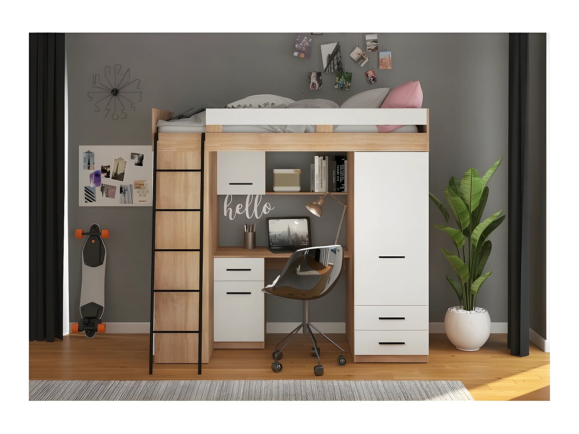 Lit Mezzanine 90x200cm avec échelle Placard, Bureau, bibliothèque et beaucoup d'étagéres LEVI L Chêne sonoma/Blanc