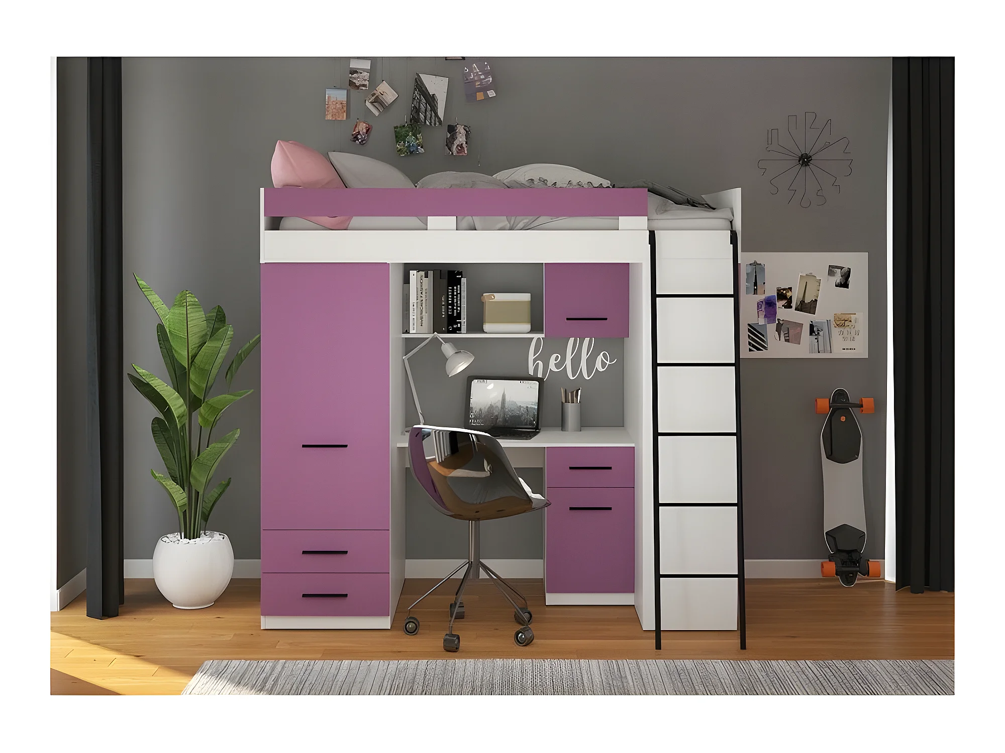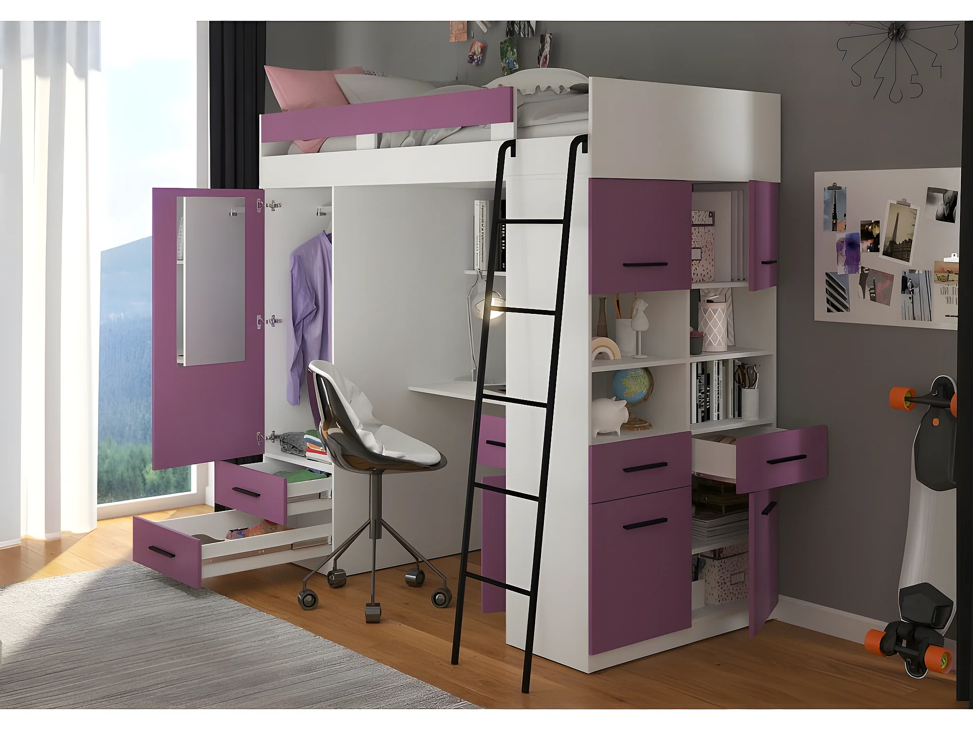 Lit Mezzanine 90x200cm avec échelle Placard, Bureau, bibliothèque et beaucoup d'étagéres LEVI P Blanc/Lavande