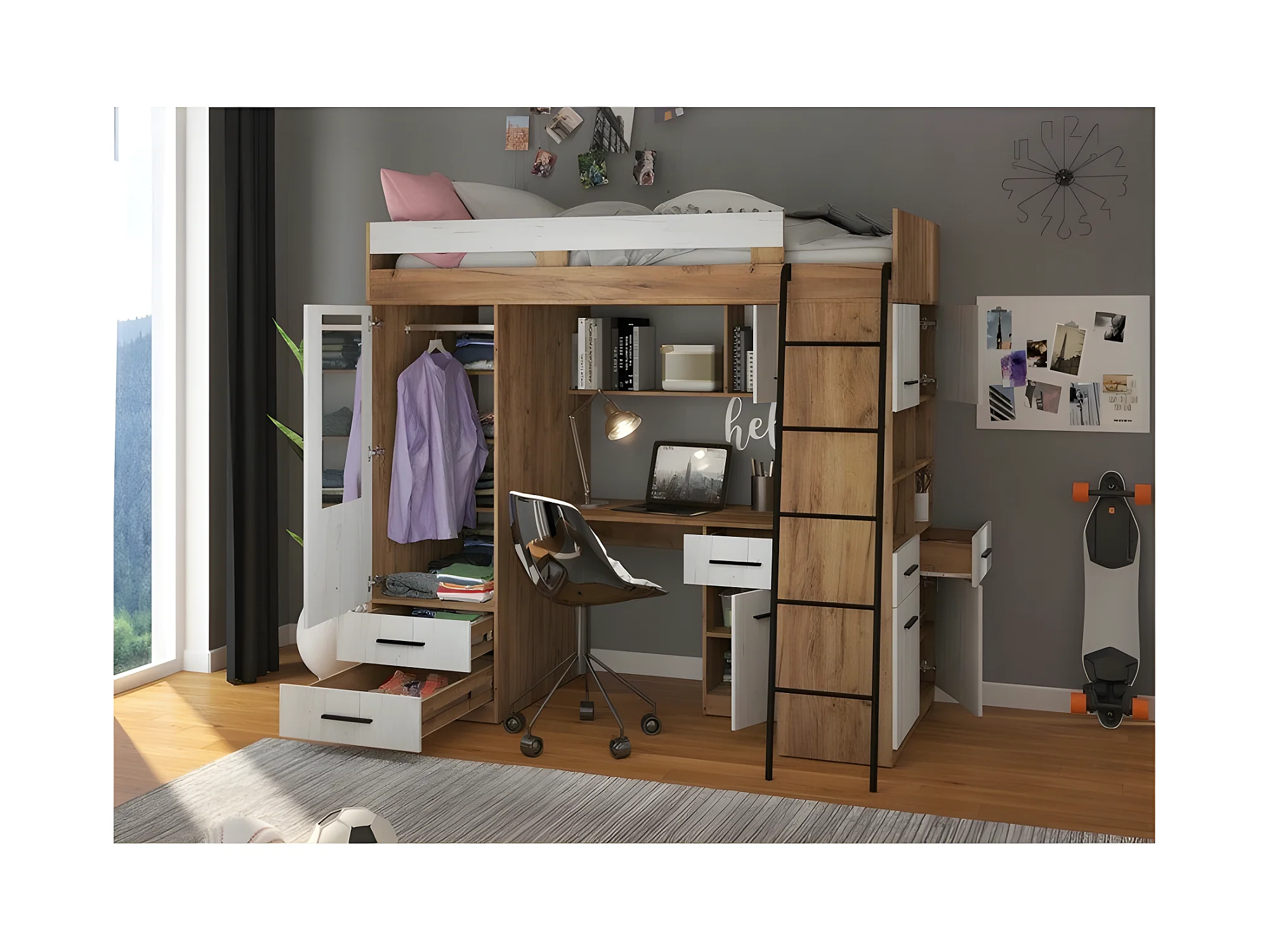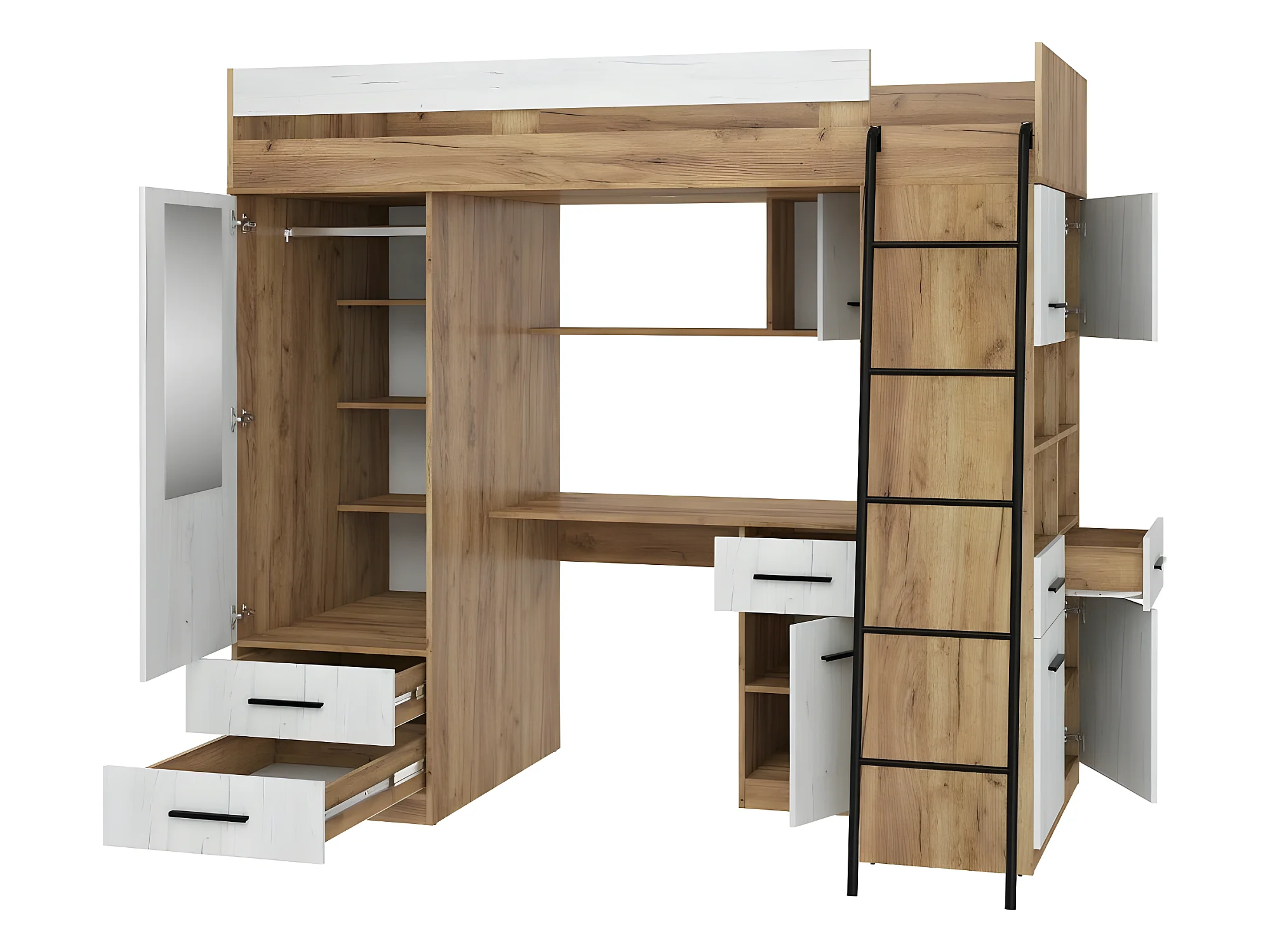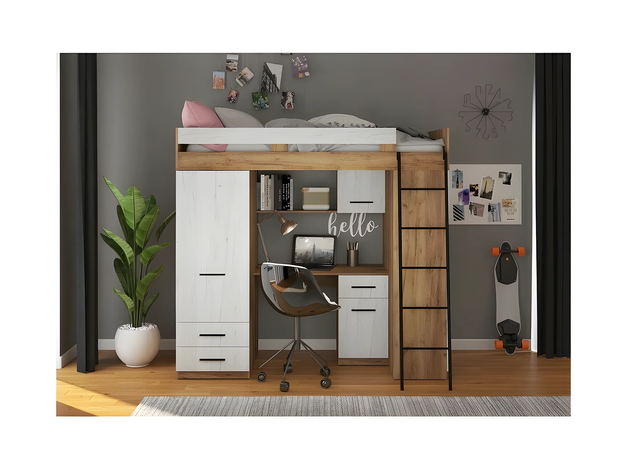 Lit Mezzanine 90x200cm avec échelle Placard, Bureau, bibliothèque et beaucoup d'étagéres LEVI P Chêne artisan/Blanc artisan