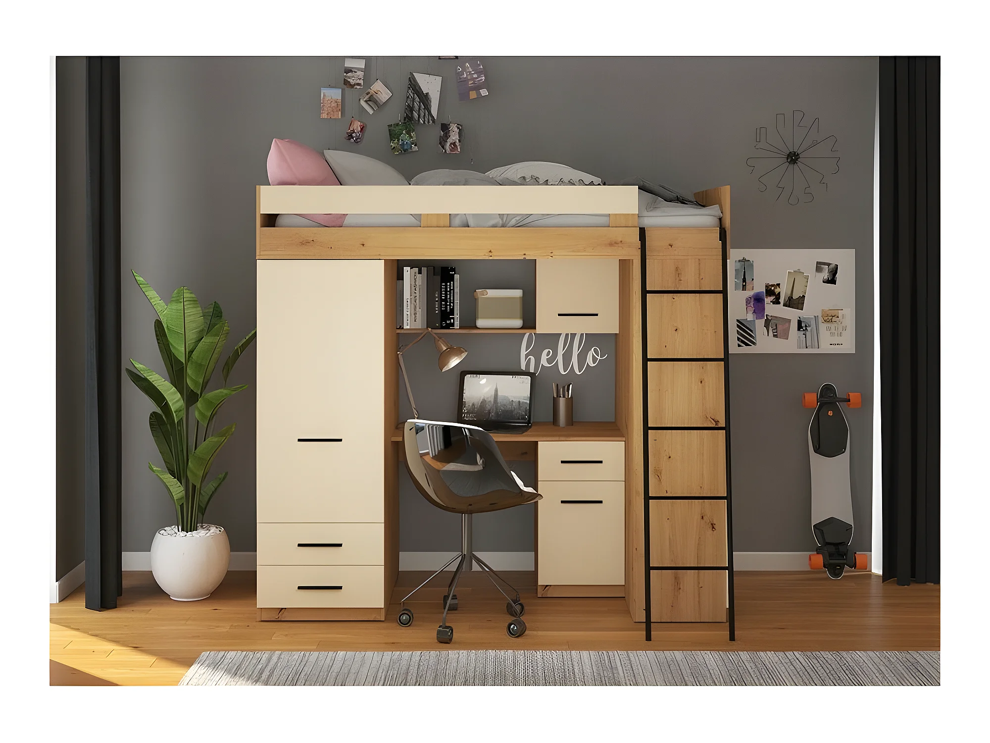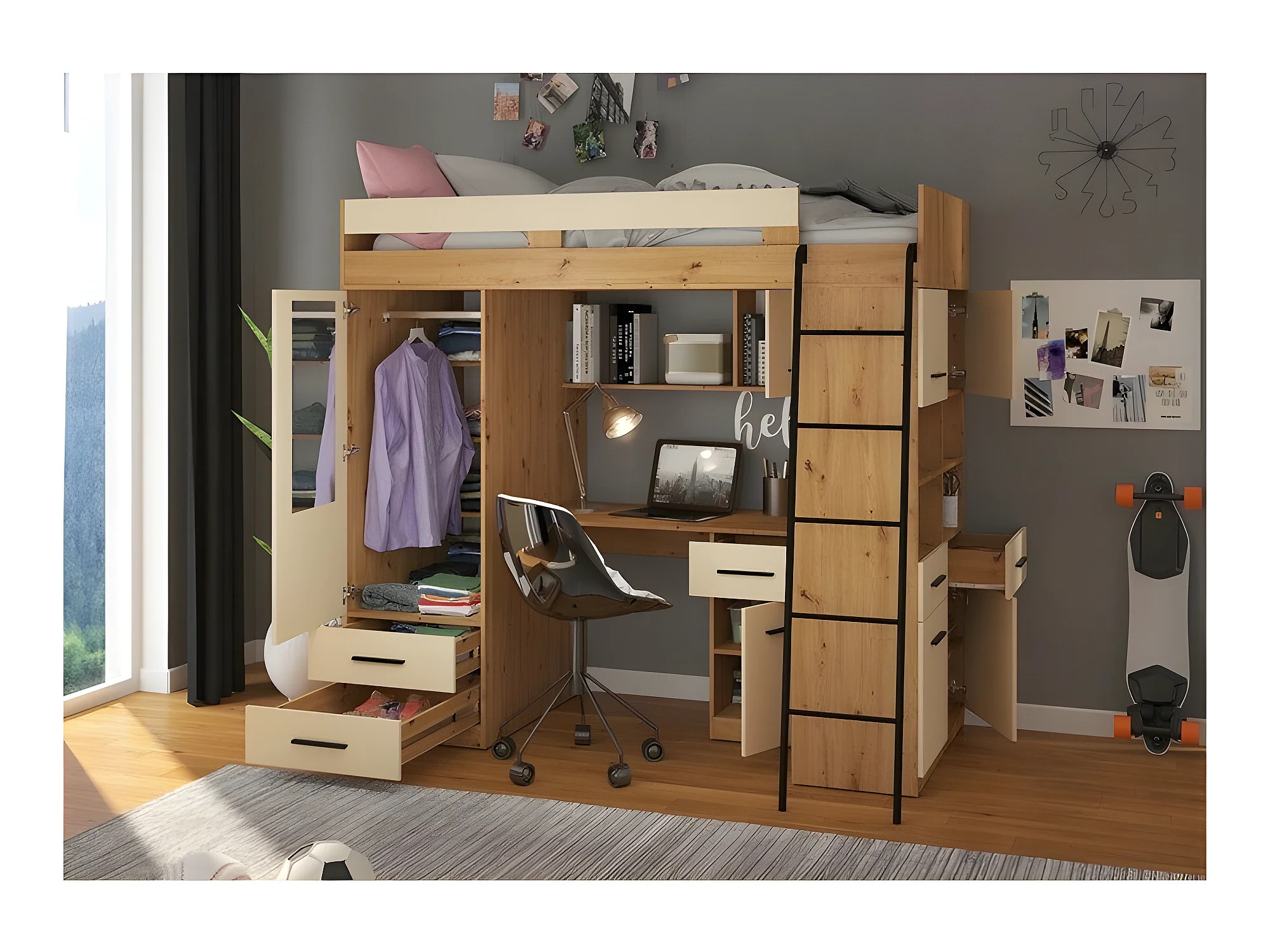 Lit Mezzanine 90x200cm avec échelle Placard, Bureau, bibliothèque et beaucoup d'étagéres LEVI P Chêne artisan/Crème