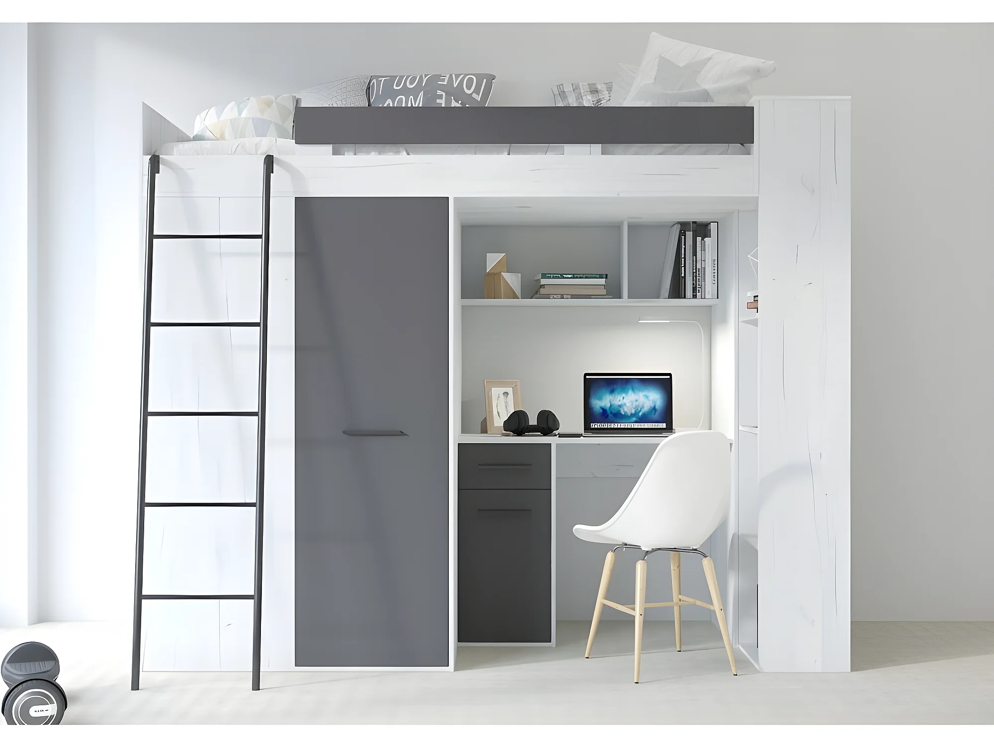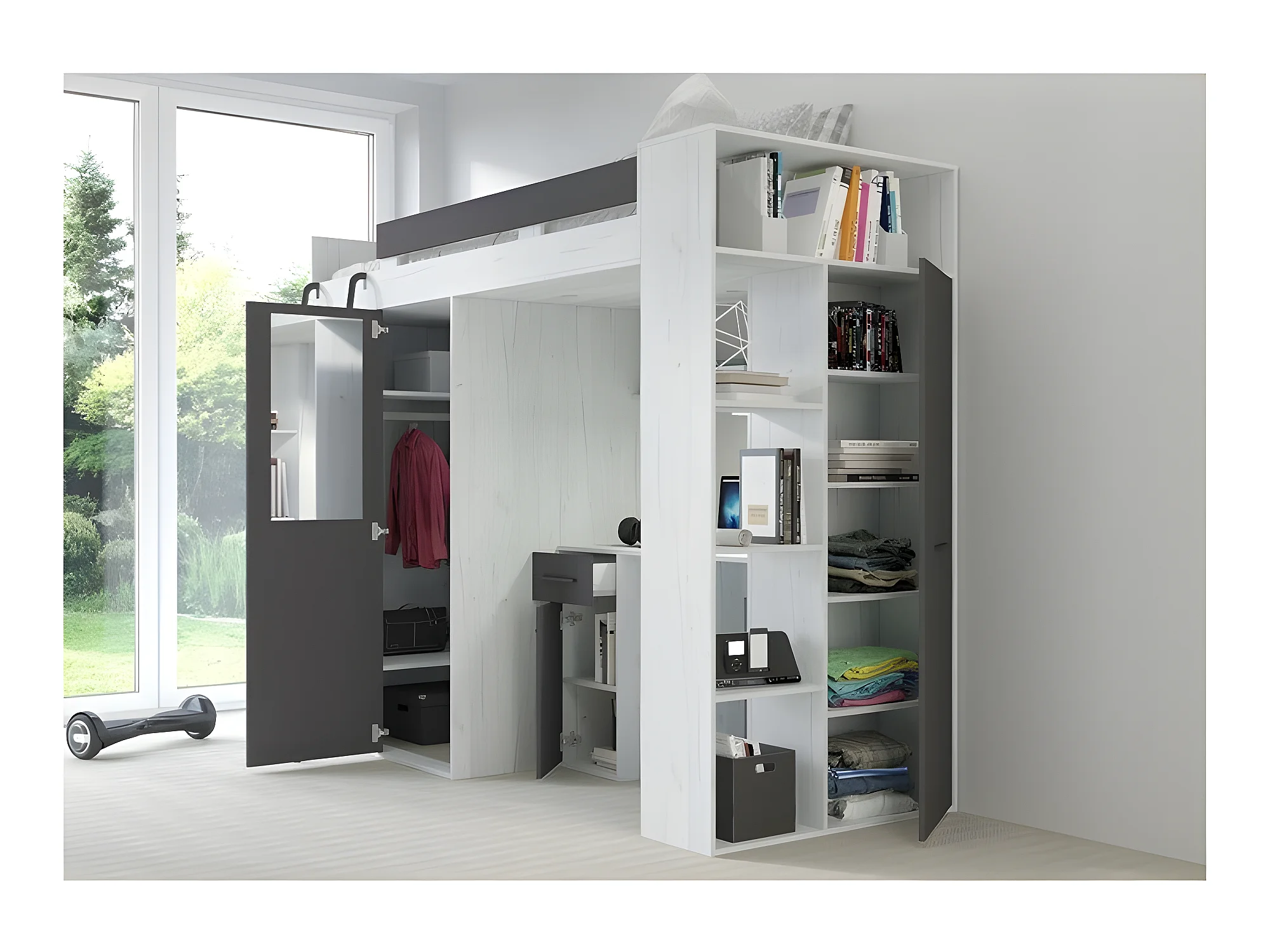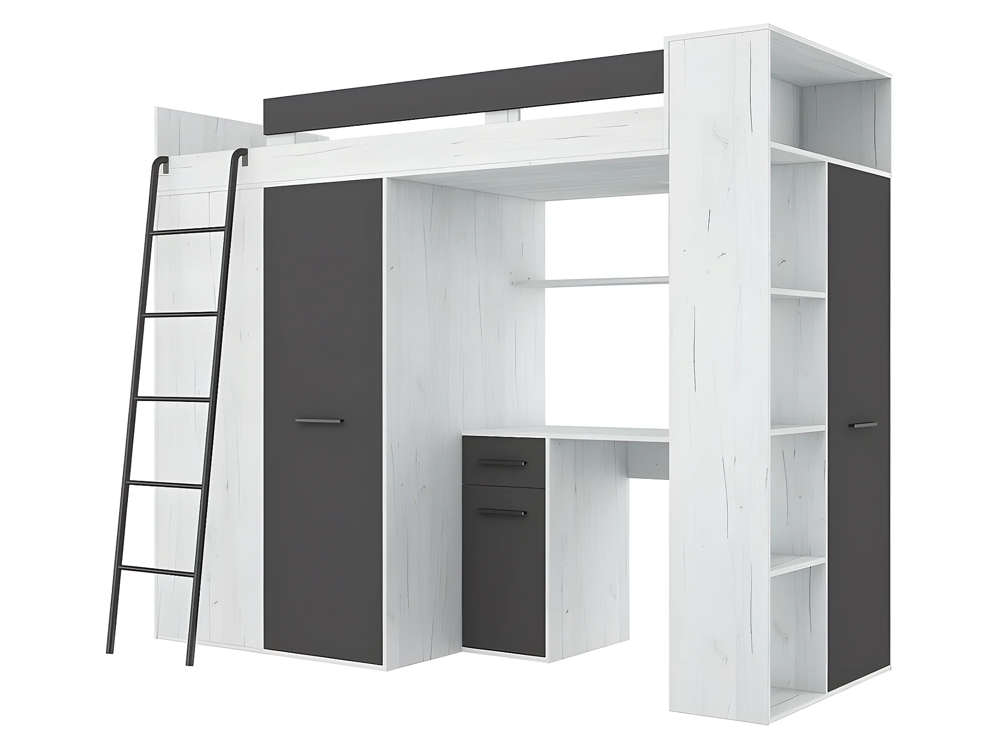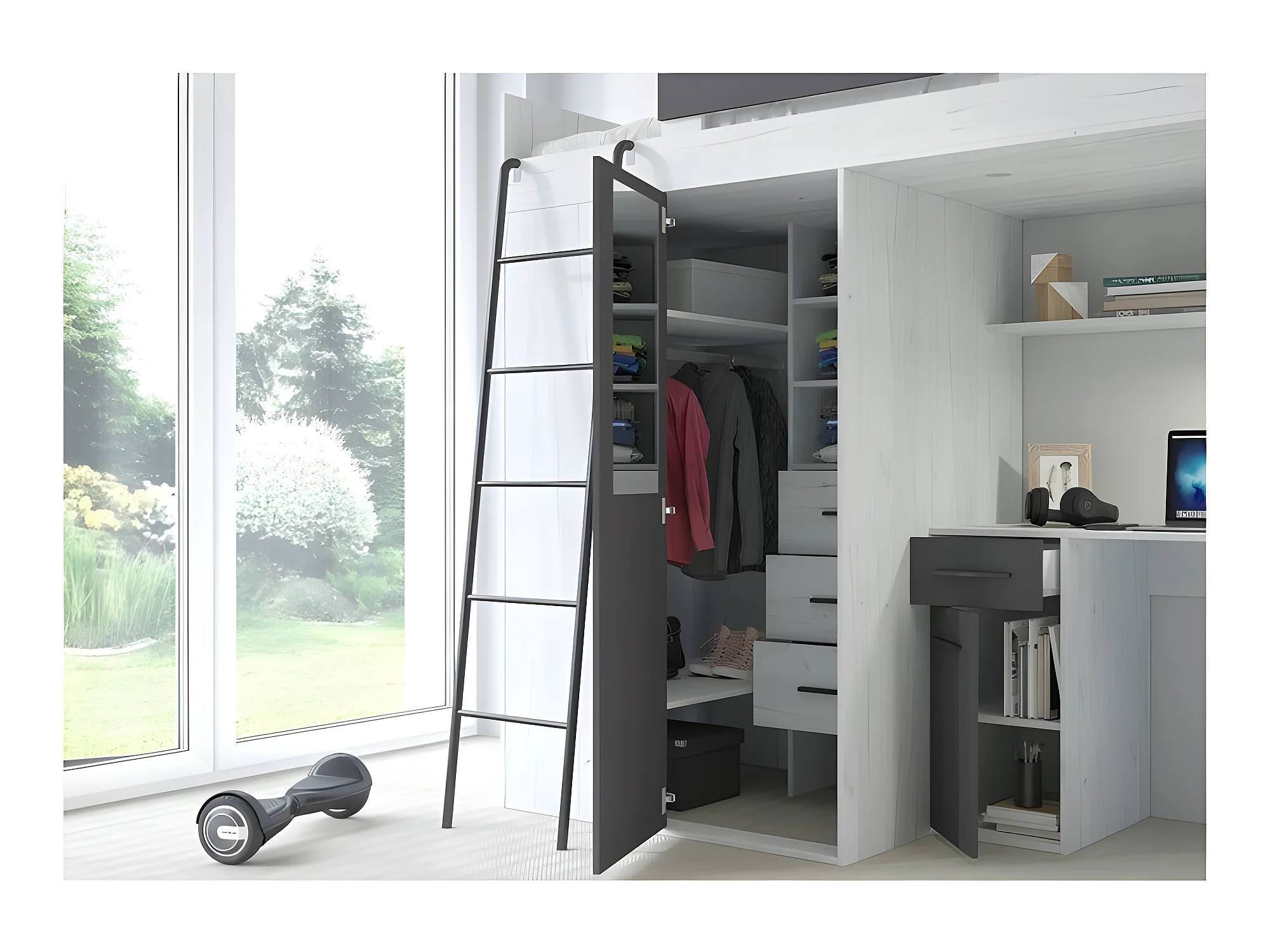 Lit Mezzanine 90x200cm avec échelle Placard, Bureau, bibliothèque et beaucoup d'étagéres VENA L Blanc artisan /Graphite