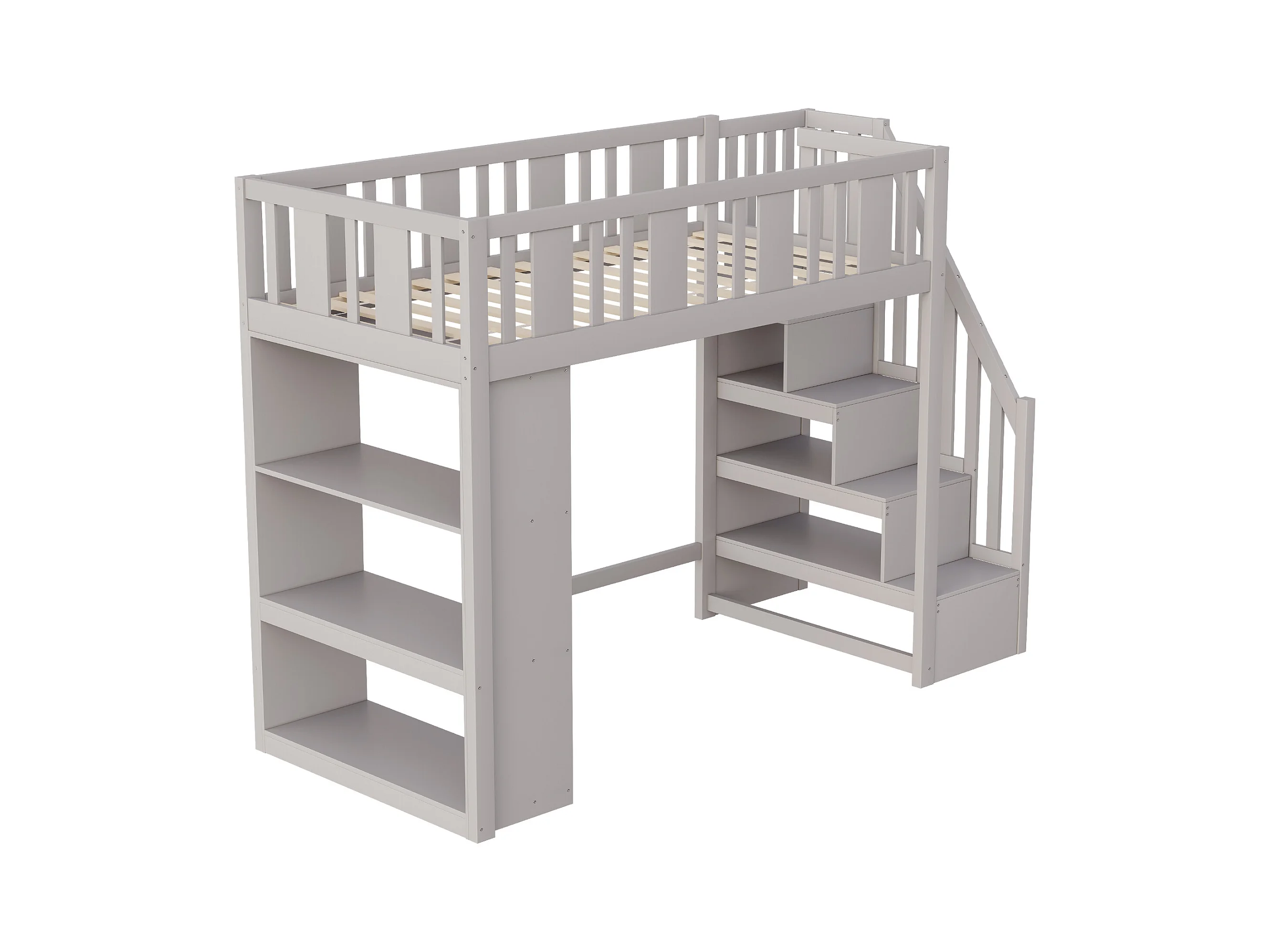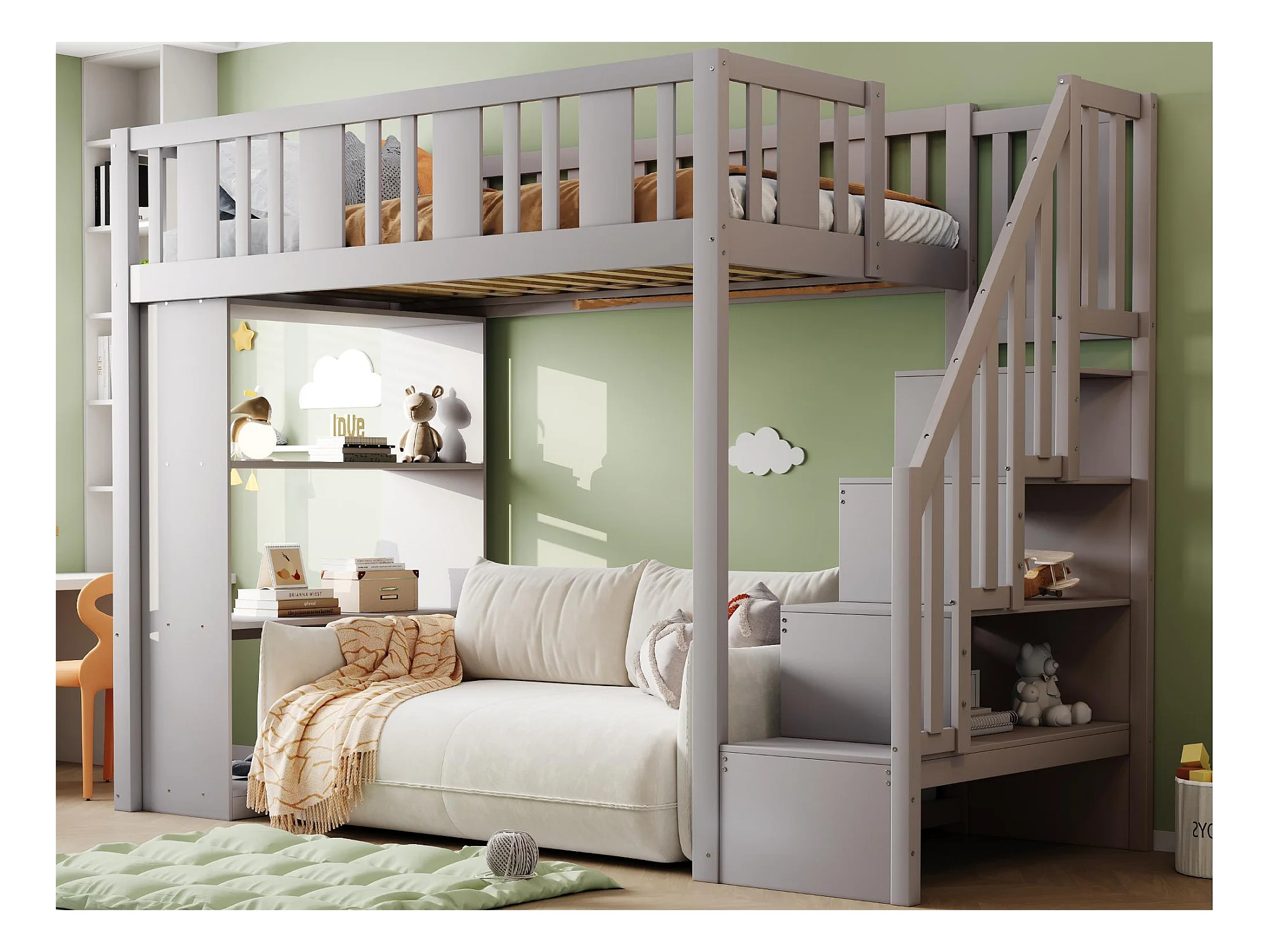 Lit mezzanine 90x200cm - avec escalier de rangement - avec compartiments de rangement - gris (matelas non inclus)