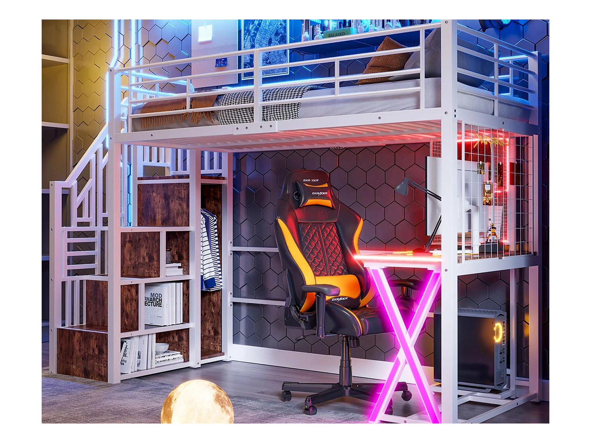 Lit mezzanine 90x200cm avec LED - bureau + penderie + échelle de rangement - Blanc