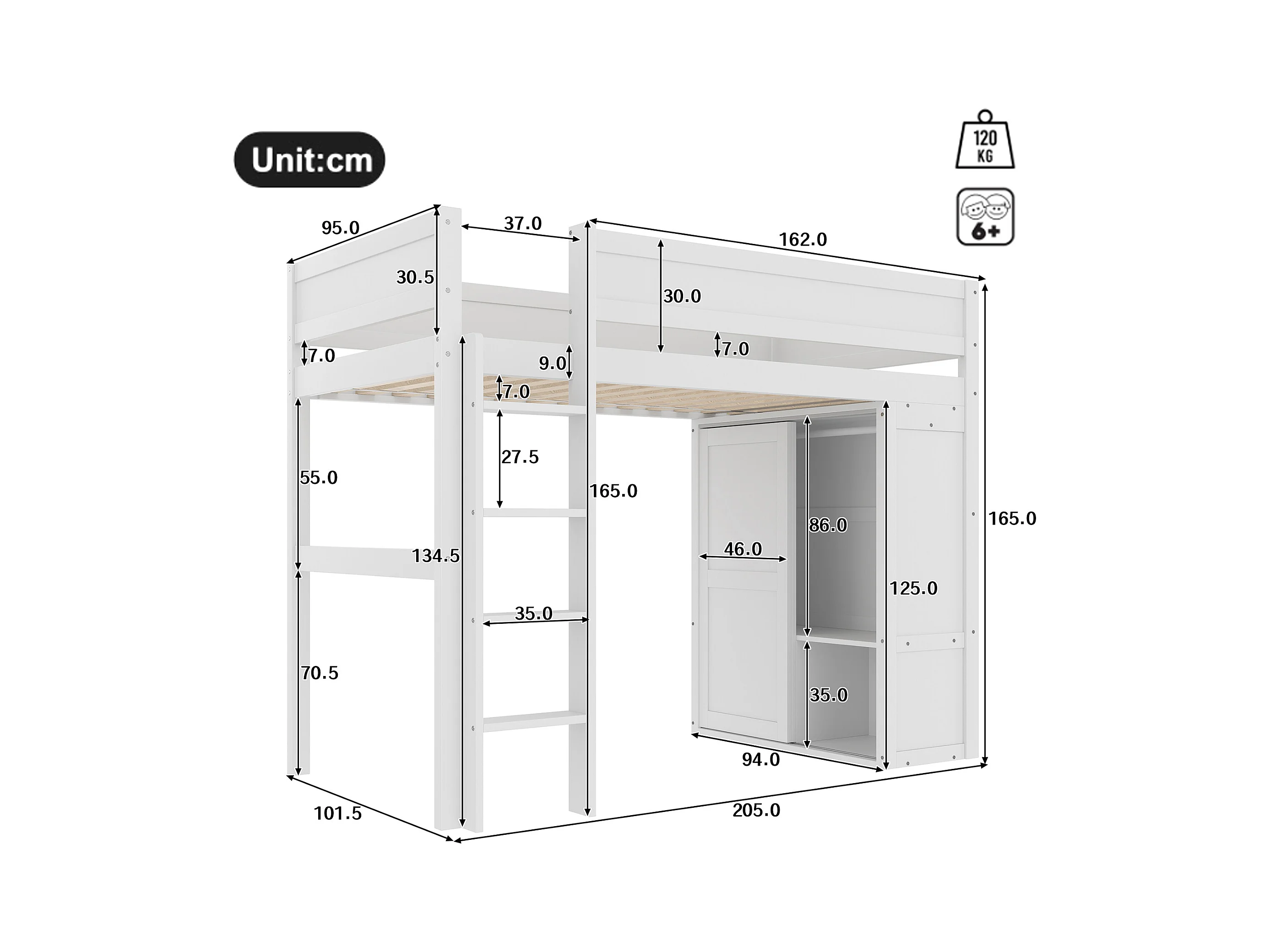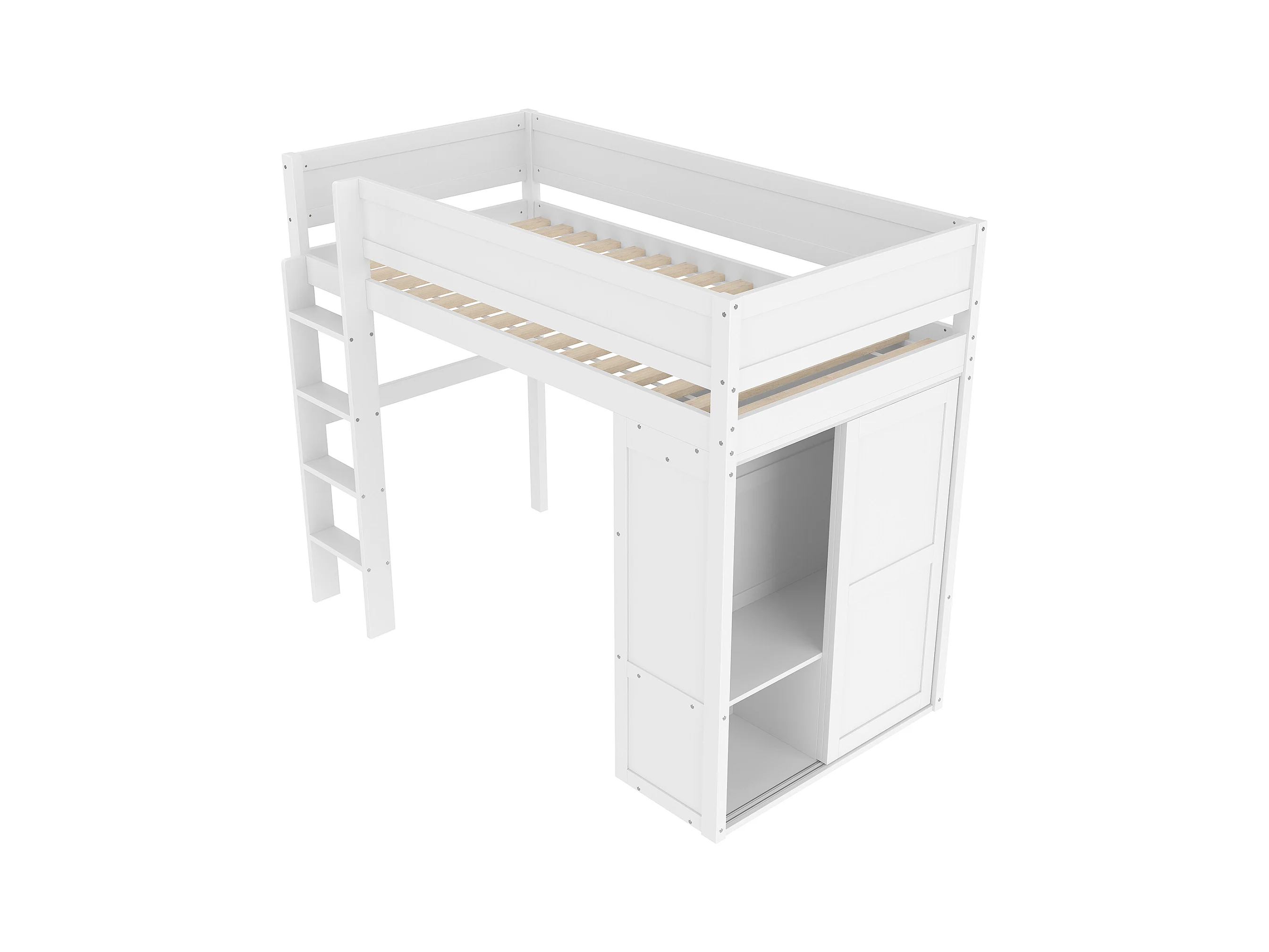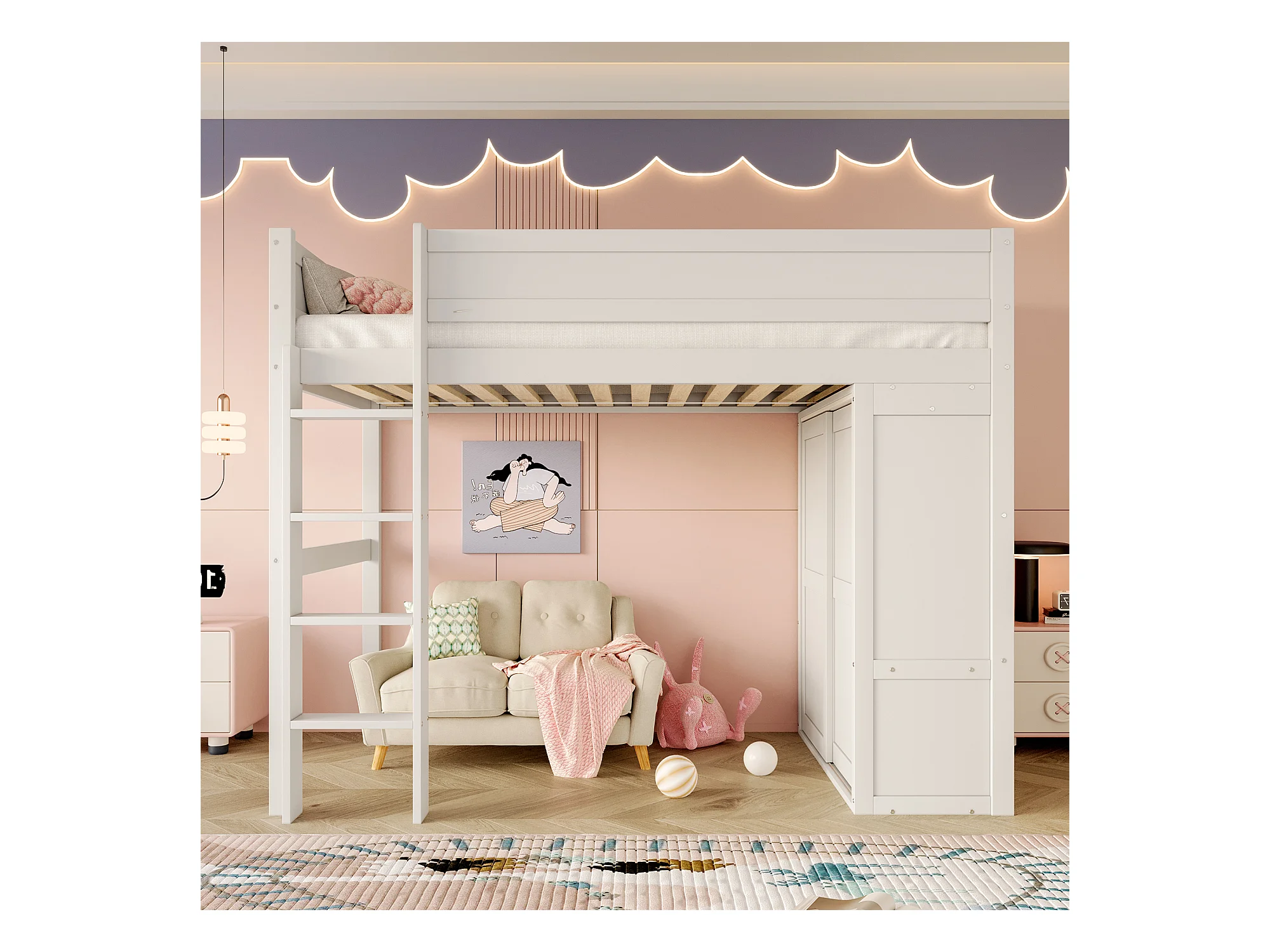 Lit mezzanine 90x200cm - avec penderie + rangements - espace ouvert sous le lit - blanc (sans matelas)