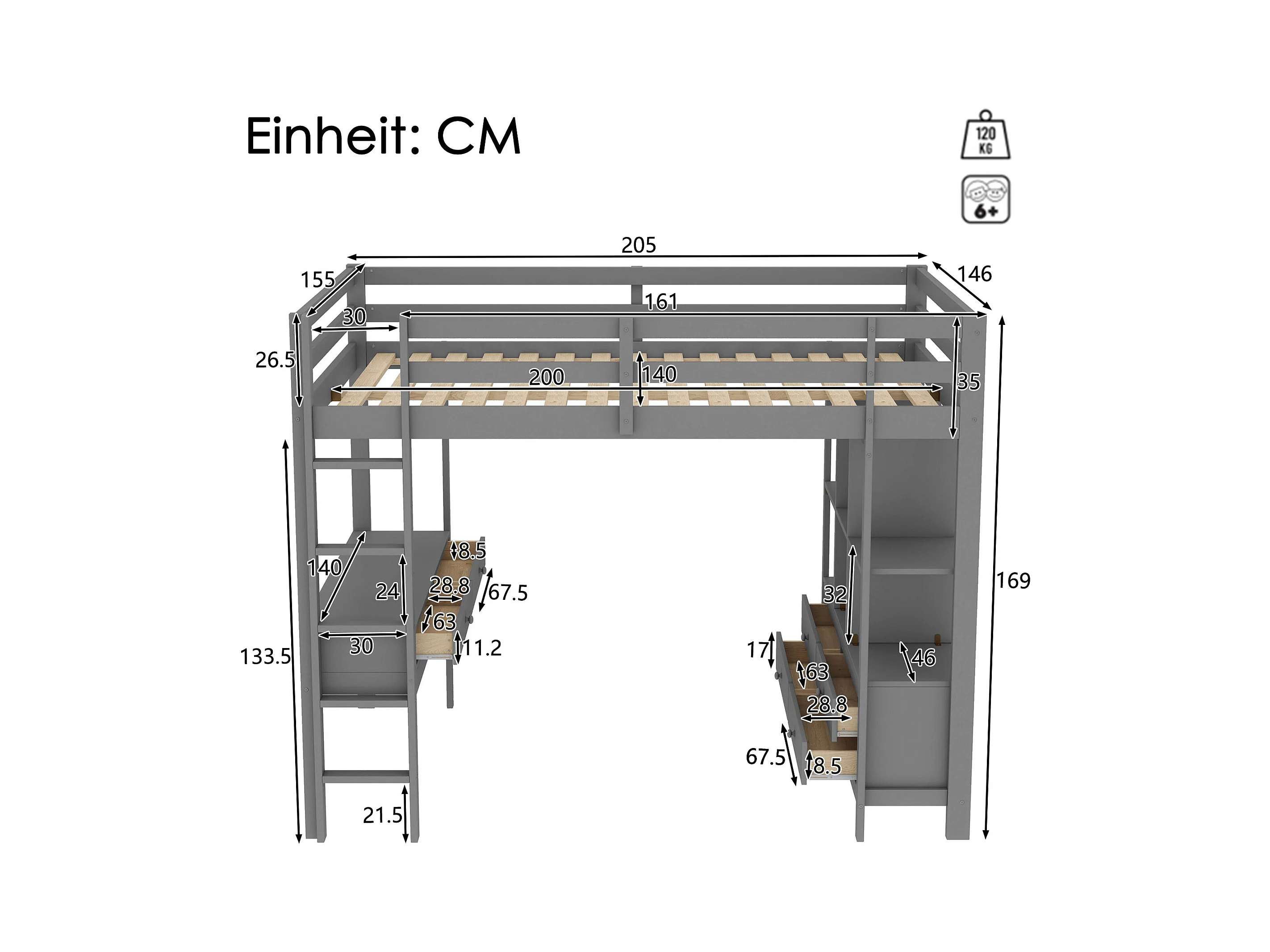Lit mezzanine 140x200 cm avec sommier - protection anti-chute bureau et 6 tiroirs - bois - gris (sans matelas)