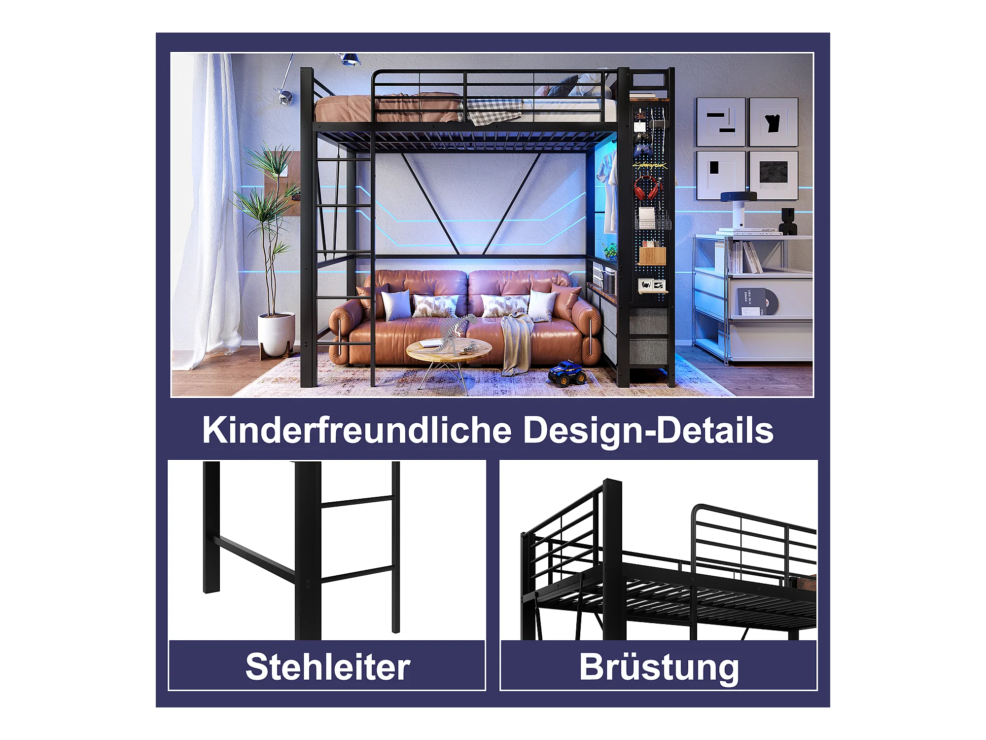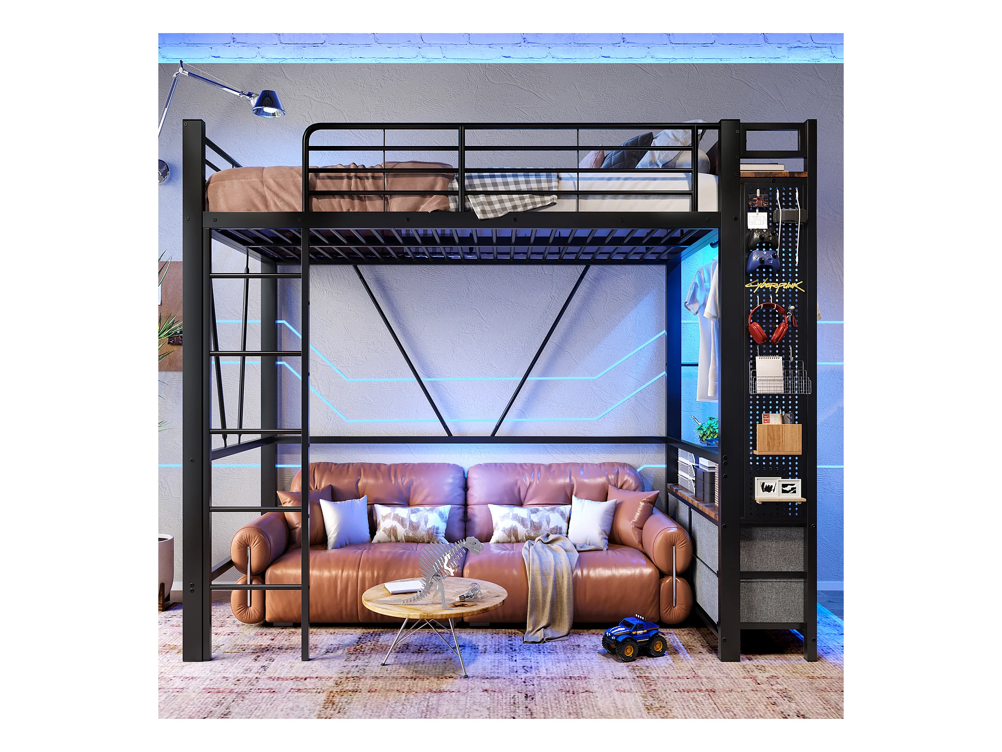 Lit mezzanine avec rangement, cadre en métal, noir, avec 4 tiroirs, USB+TYPE-C, LED (90x200x180cm)