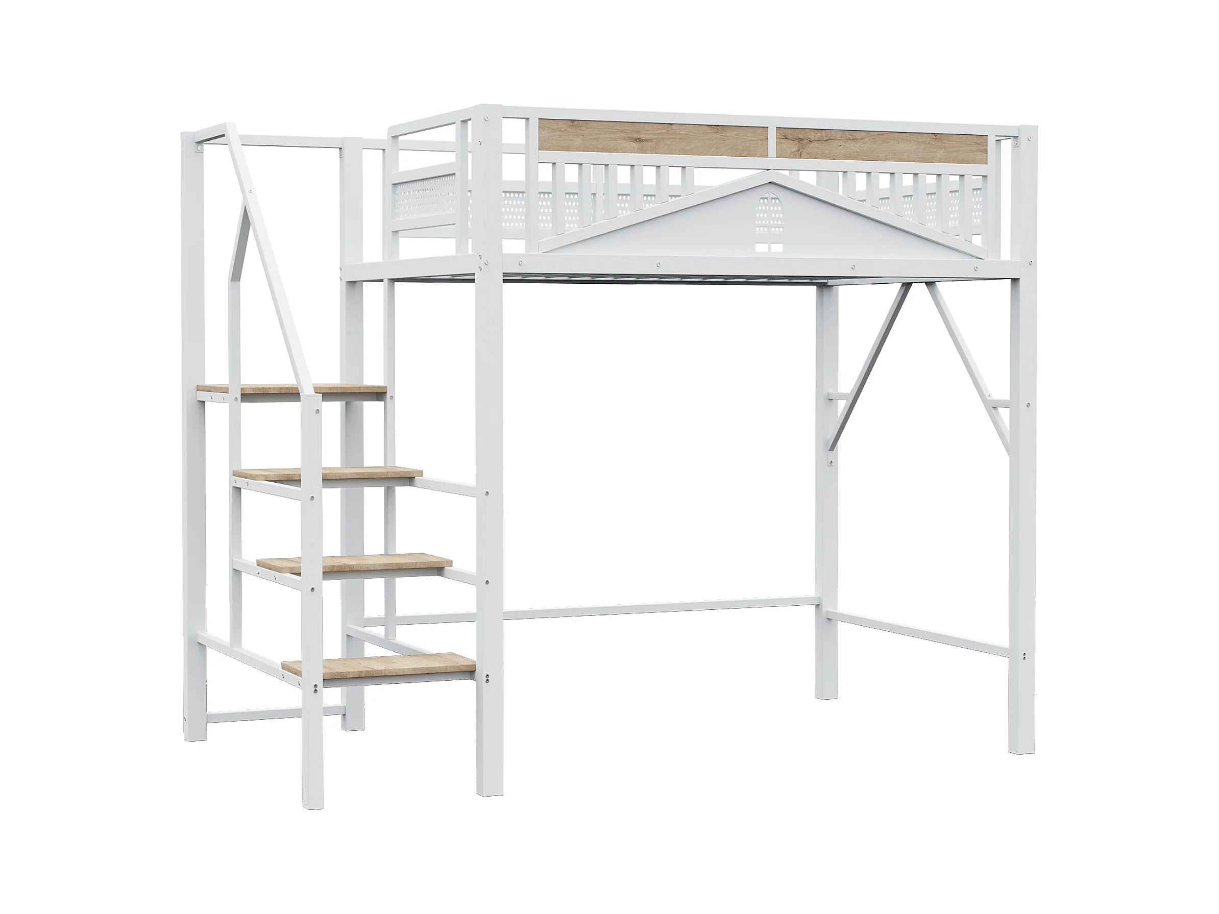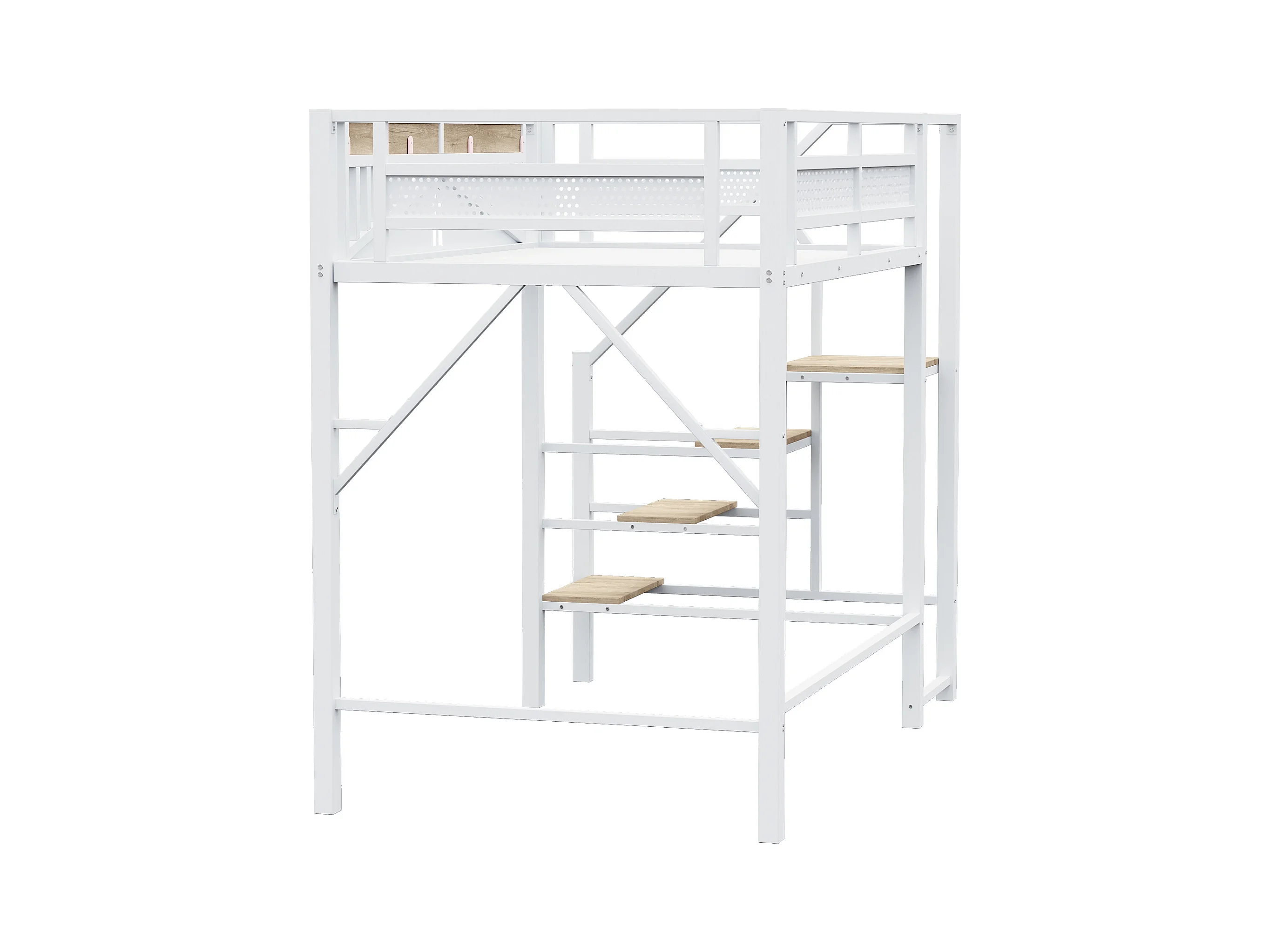 Lit mezzanine blanc et bois 140x200cm avec barrières de sécurité et escalier, métal + MDF (sans matelas)