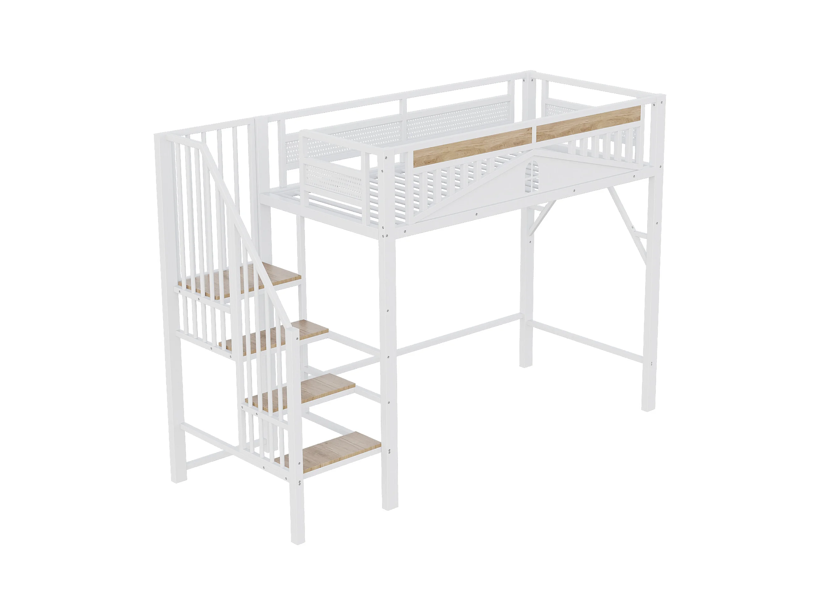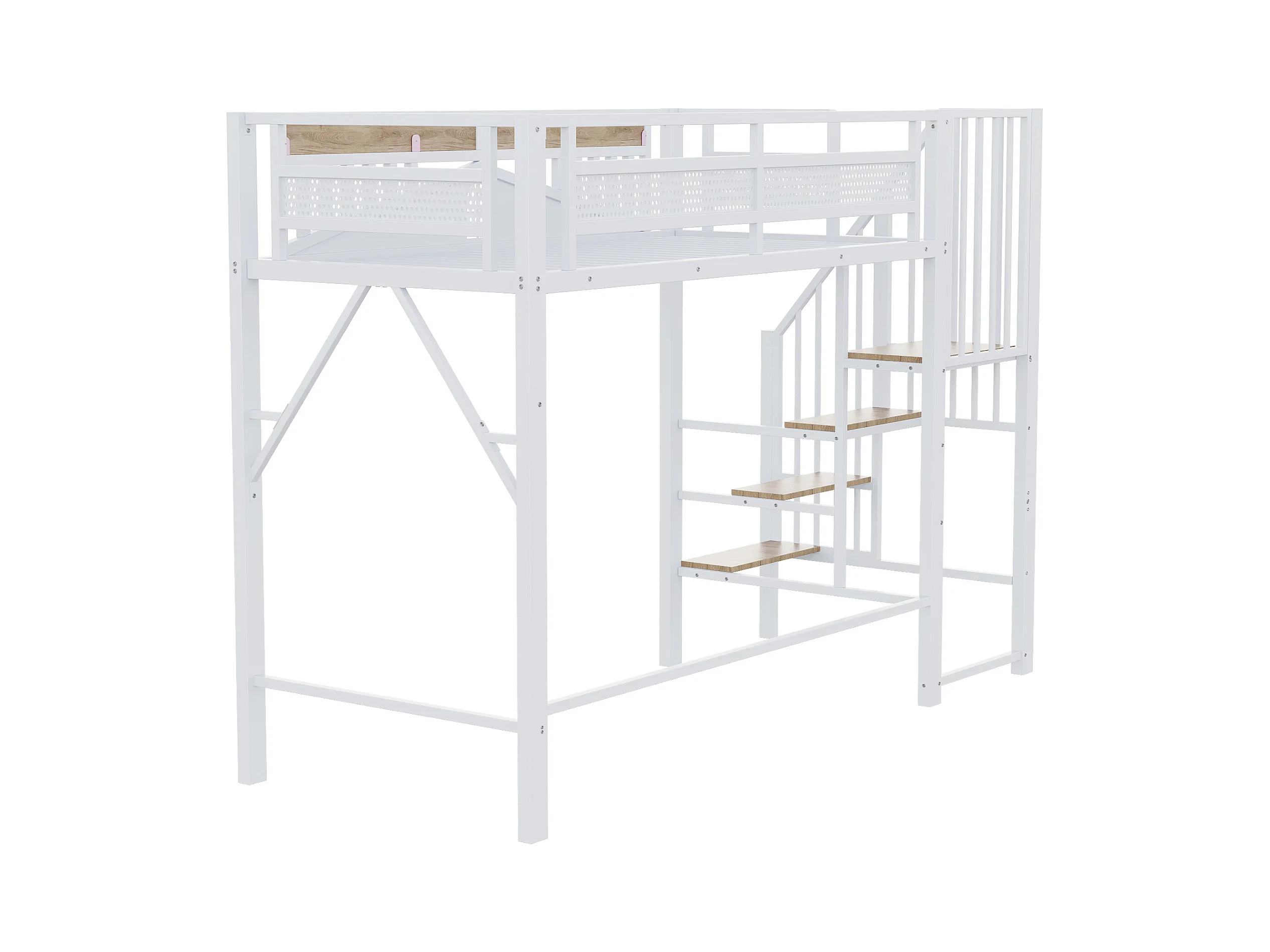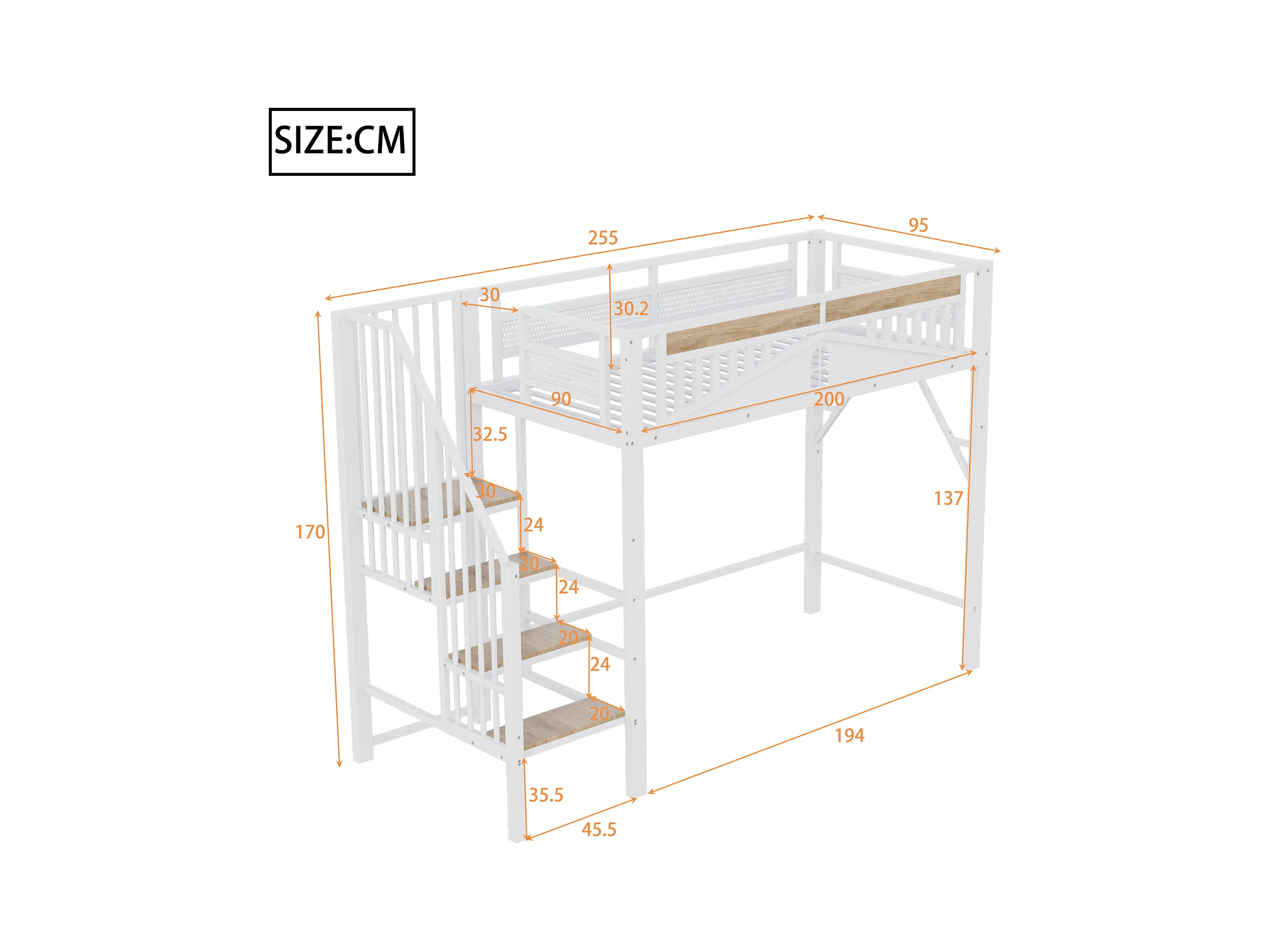 Lit mezzanine blanc et bois 90x200cm avec barrières de sécurité et escalier, métal + MDF (sans matelas)