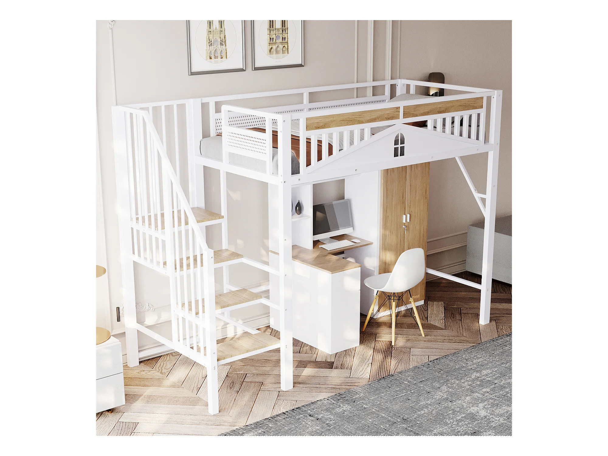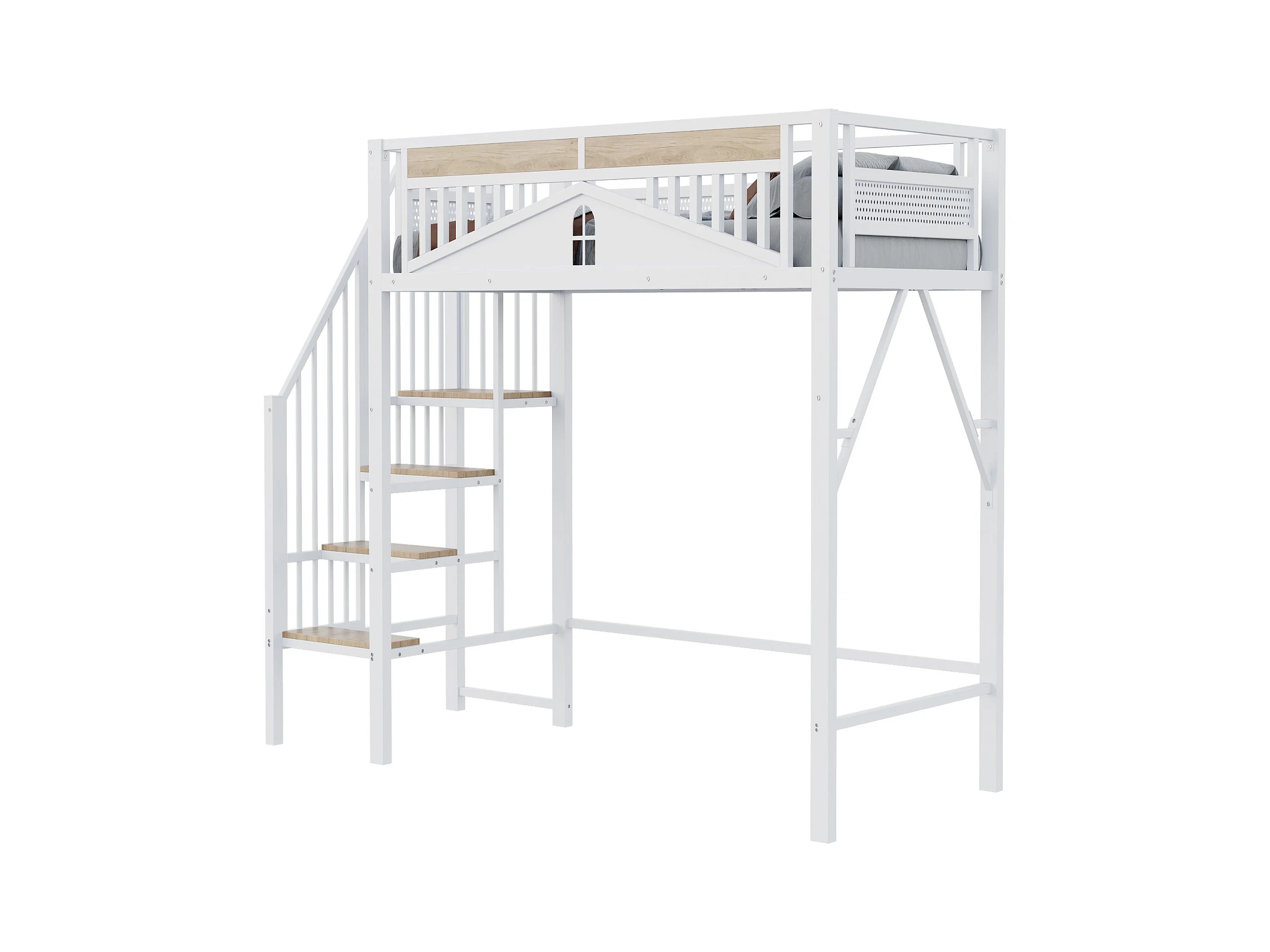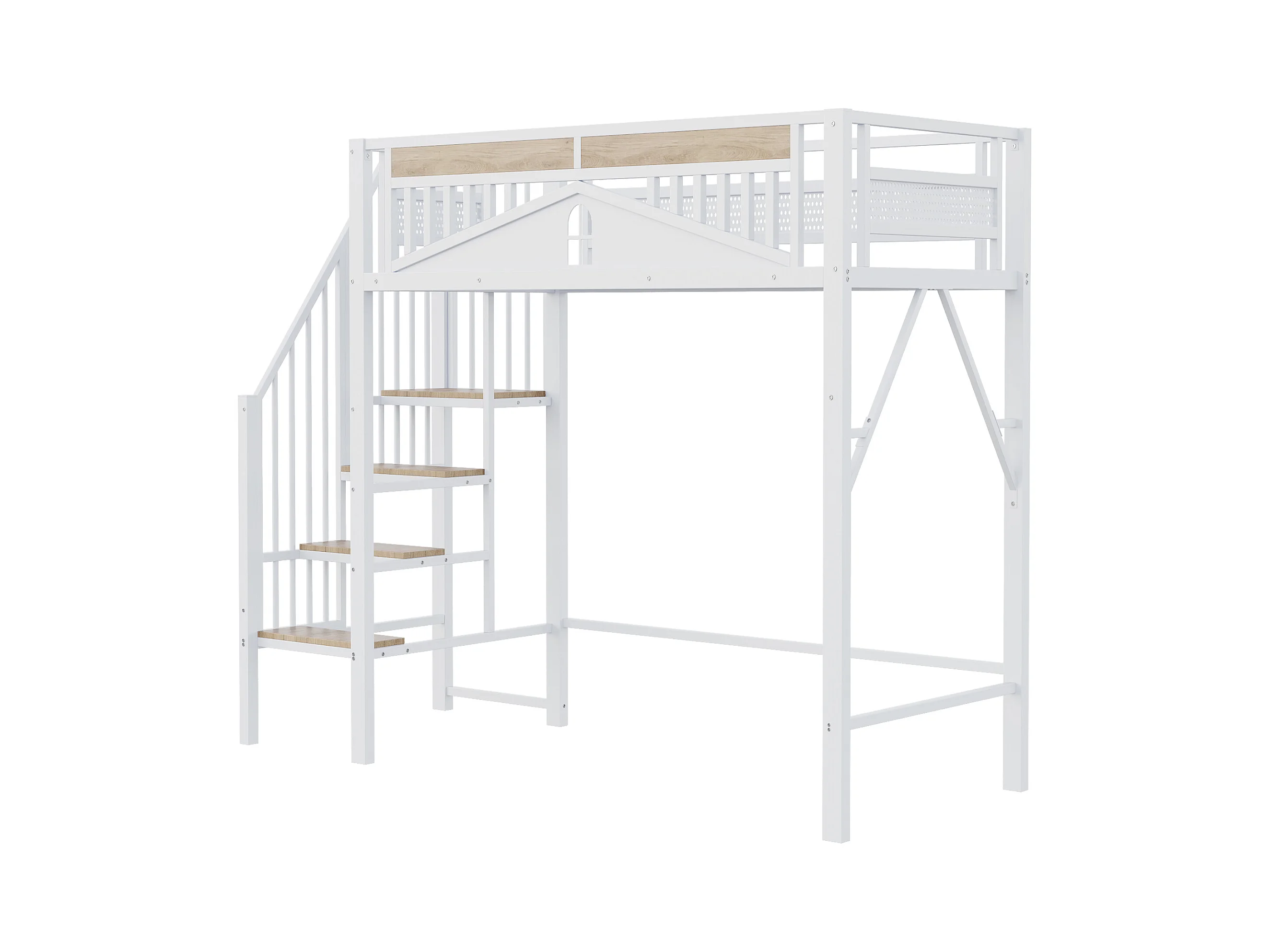 Lit mezzanine blanc et bois 90x200cm avec barrières de sécurité et escalier, métal + MDF (sans matelas)