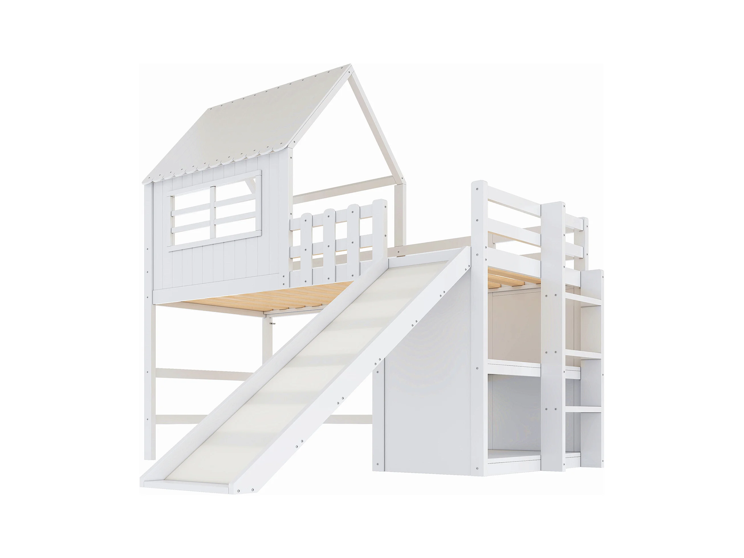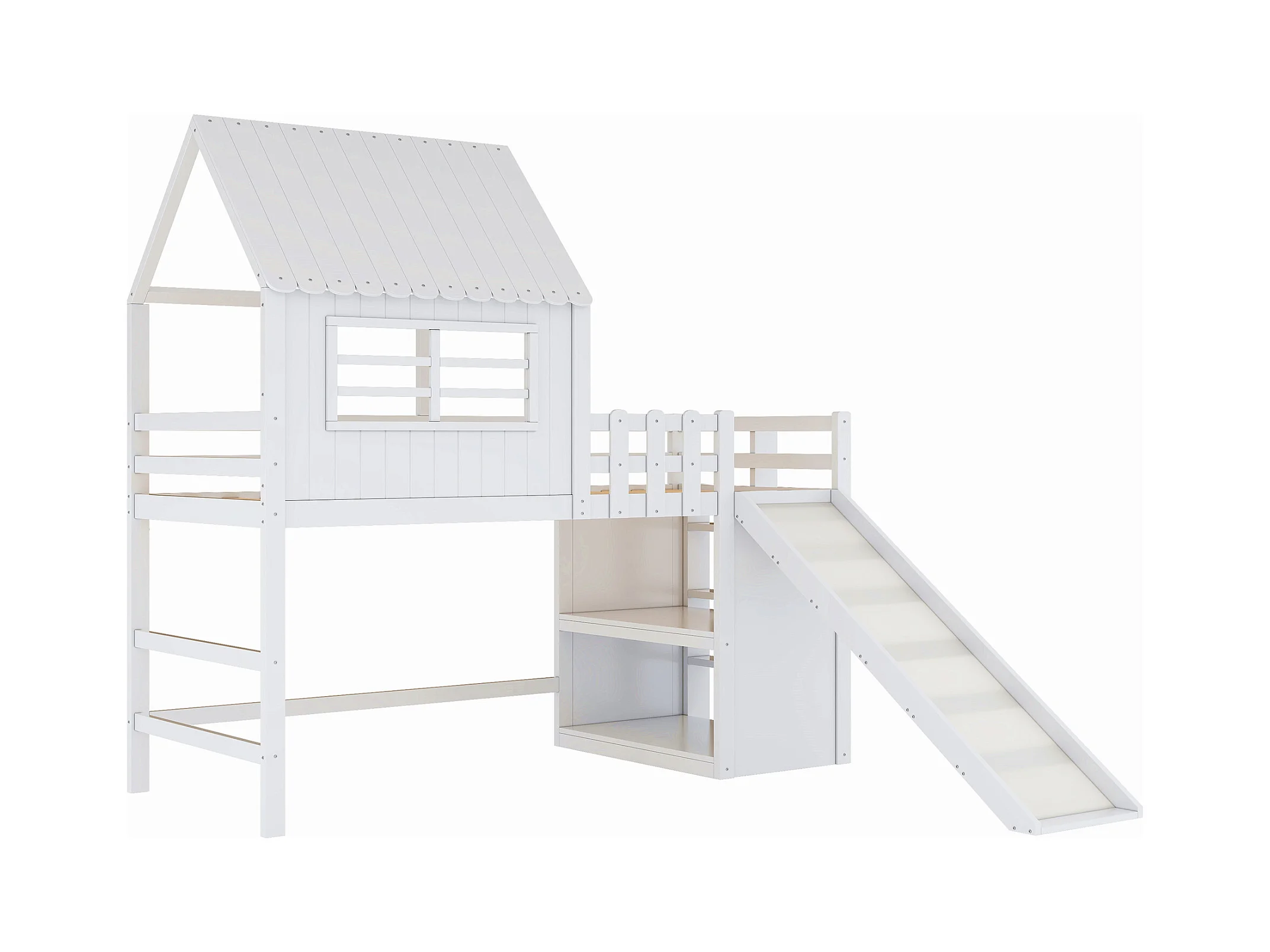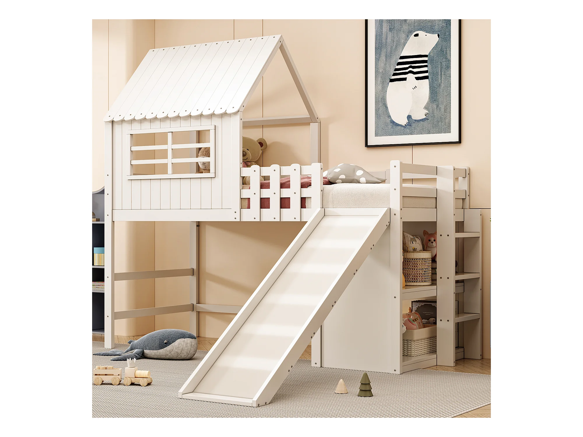 Lit mezzanine cabane enfant 90x200cm blanc avec toboggan, échelle et rangement, barrière de sécurité, sans matelas