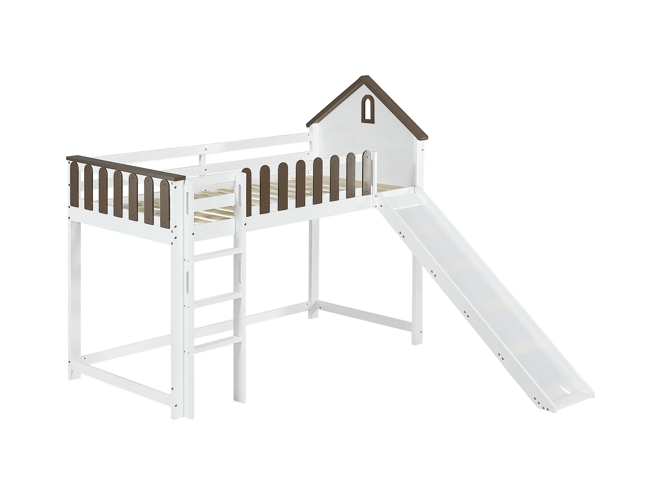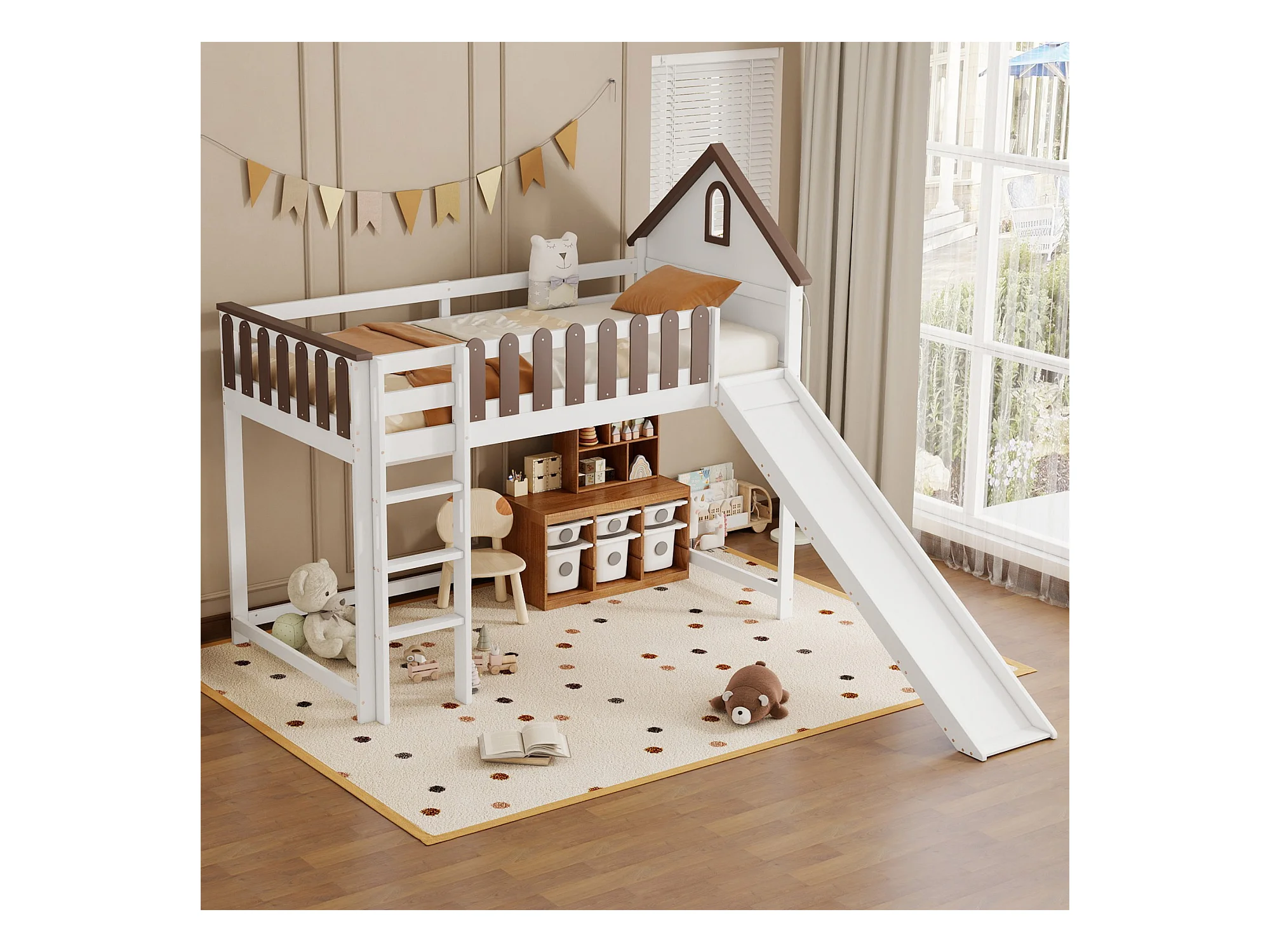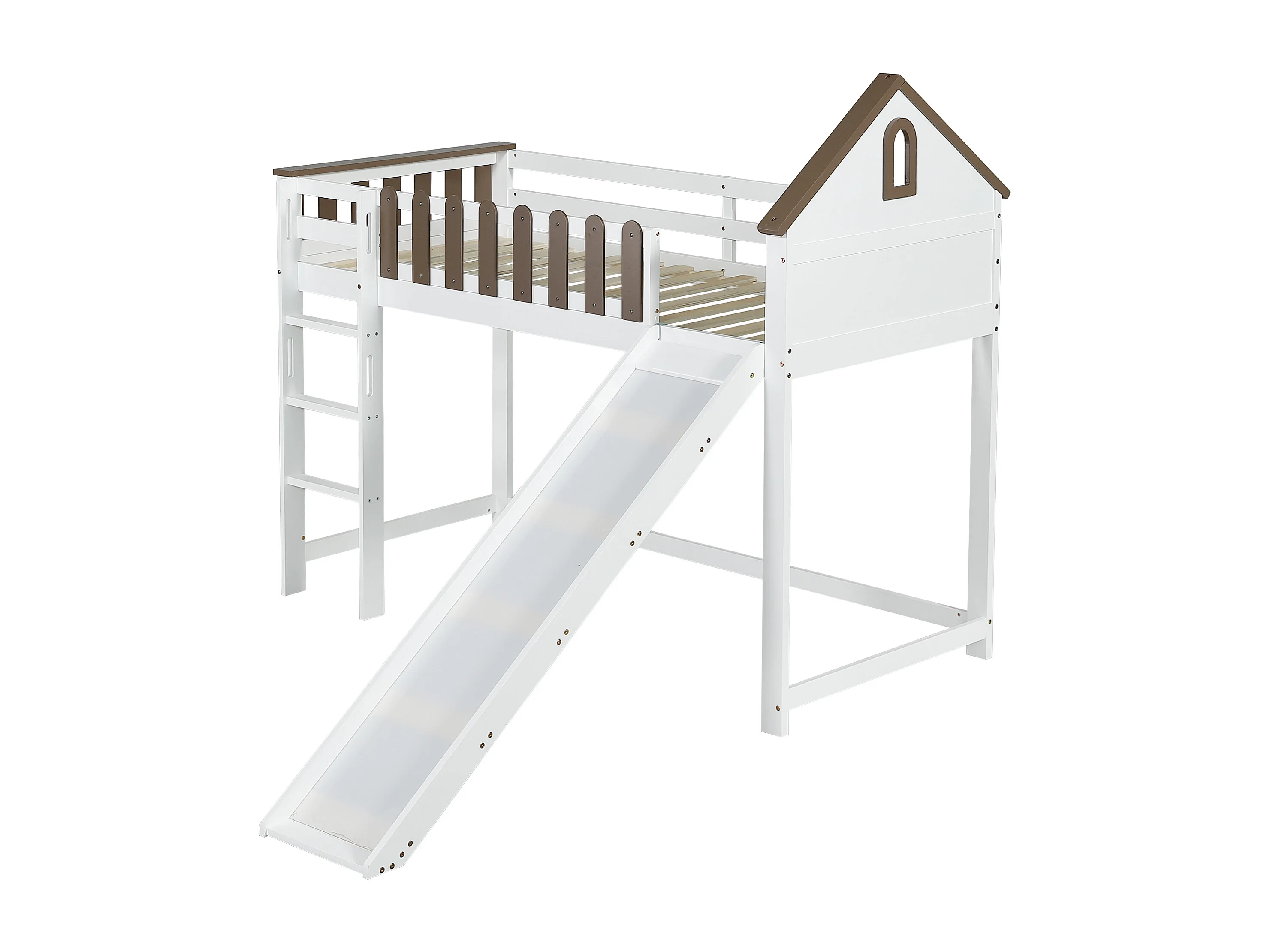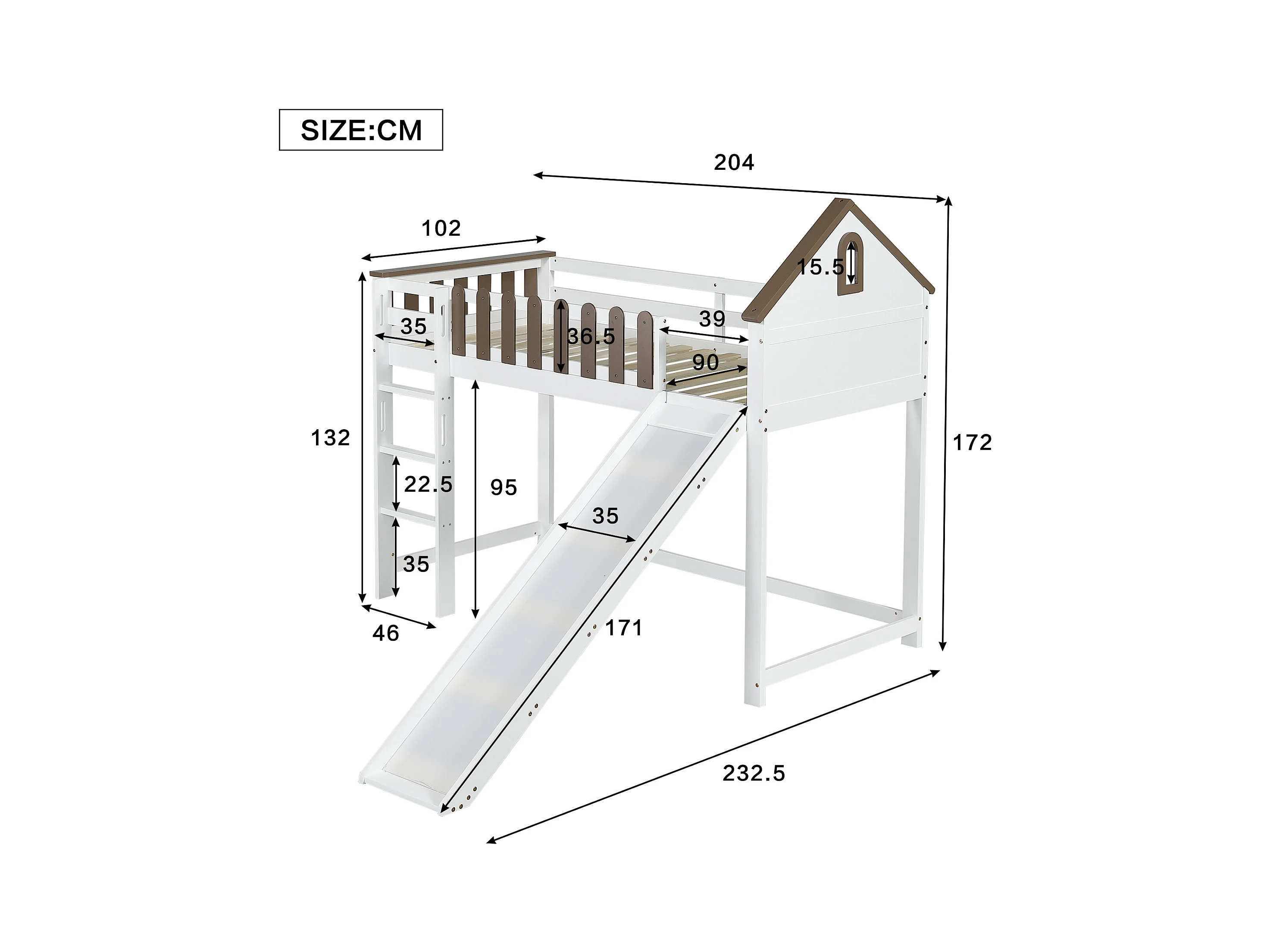 Lit mezzanine cabane enfant blanc et noyer 90x200cm avec échelle et toboggan, sans matelas