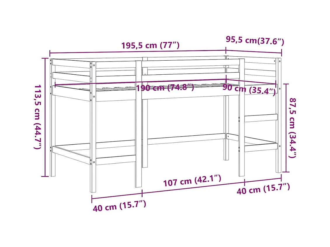Lit mezzanine d'enfants sans matelas avec échelle 90x190 cm