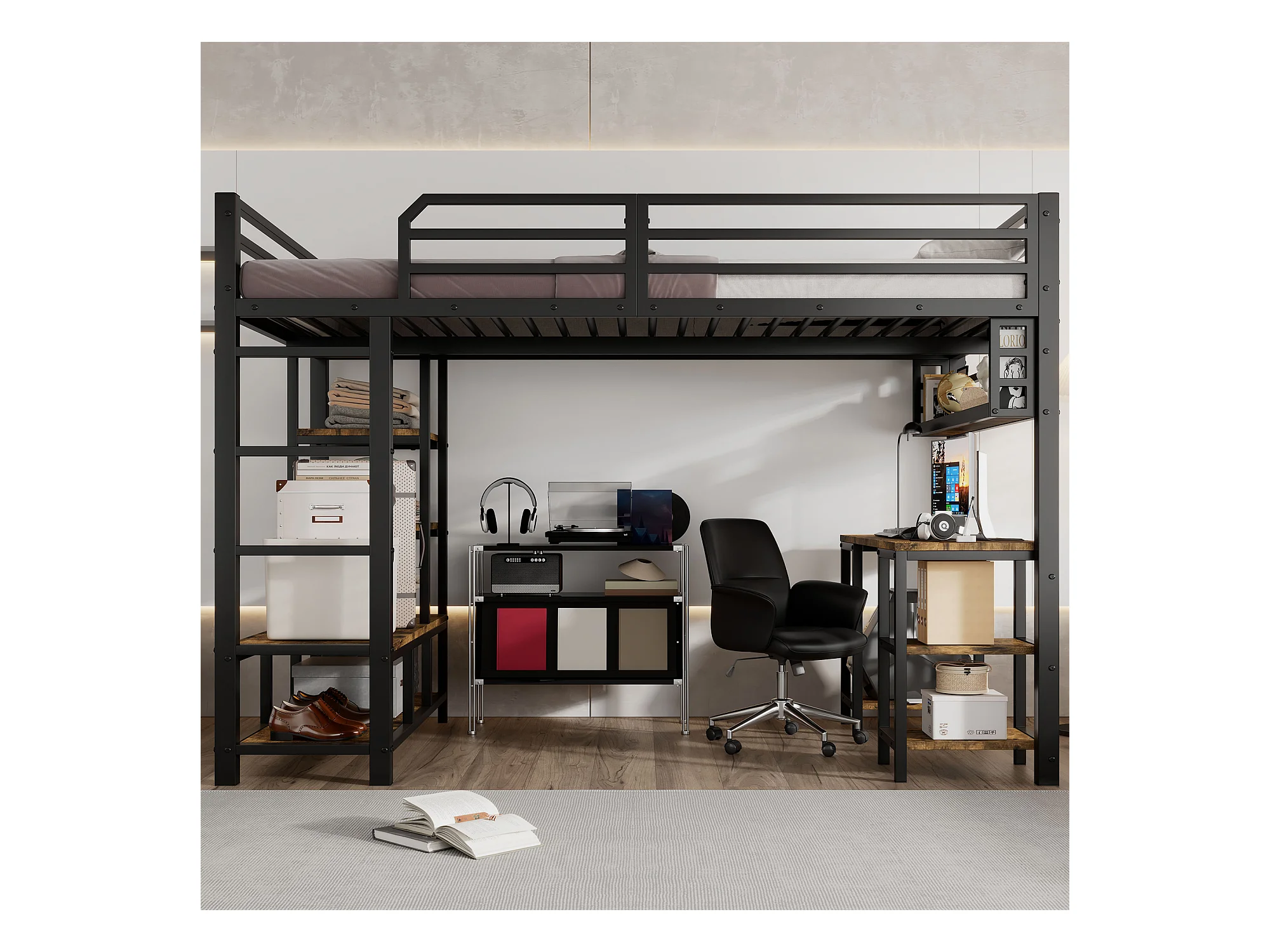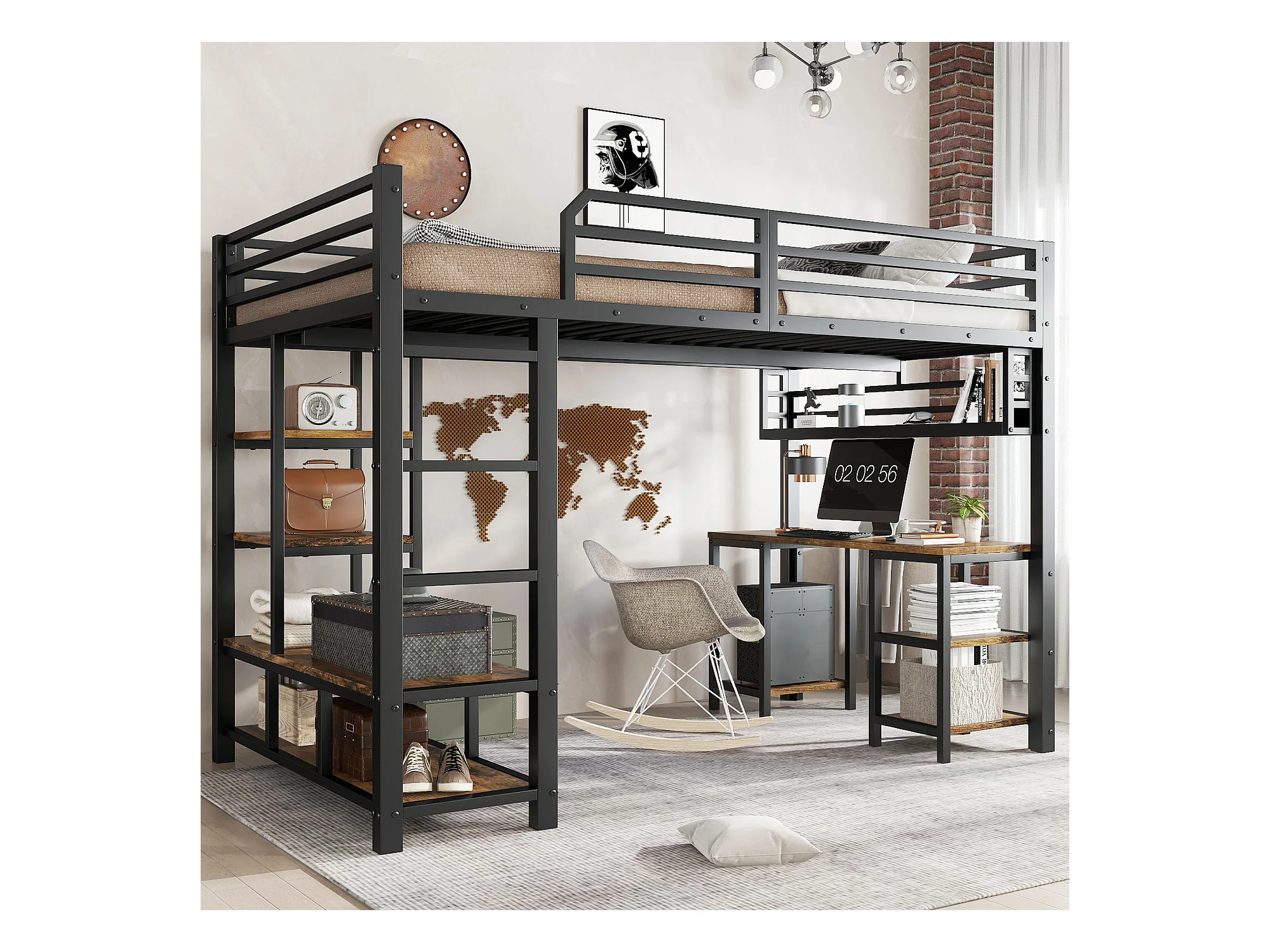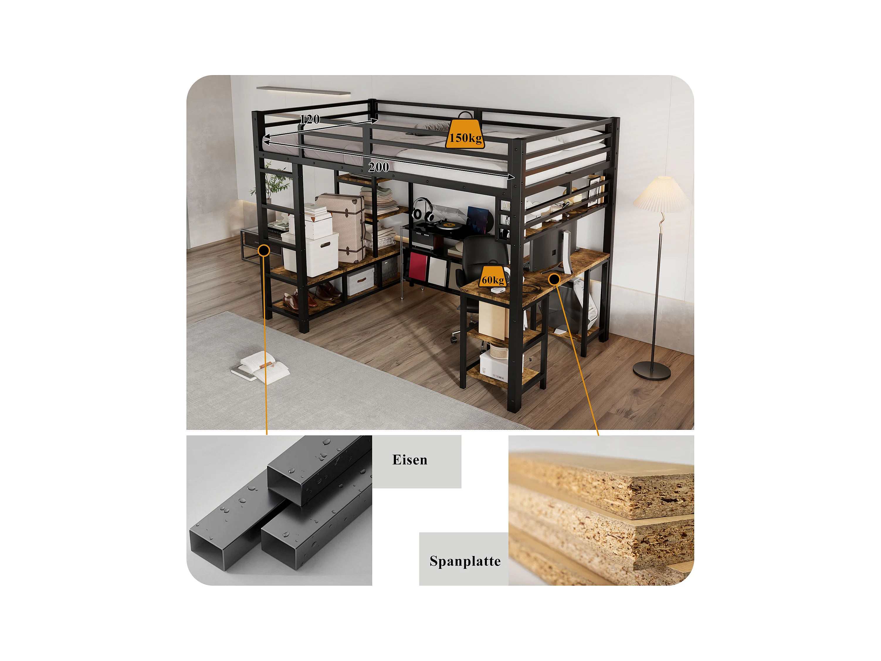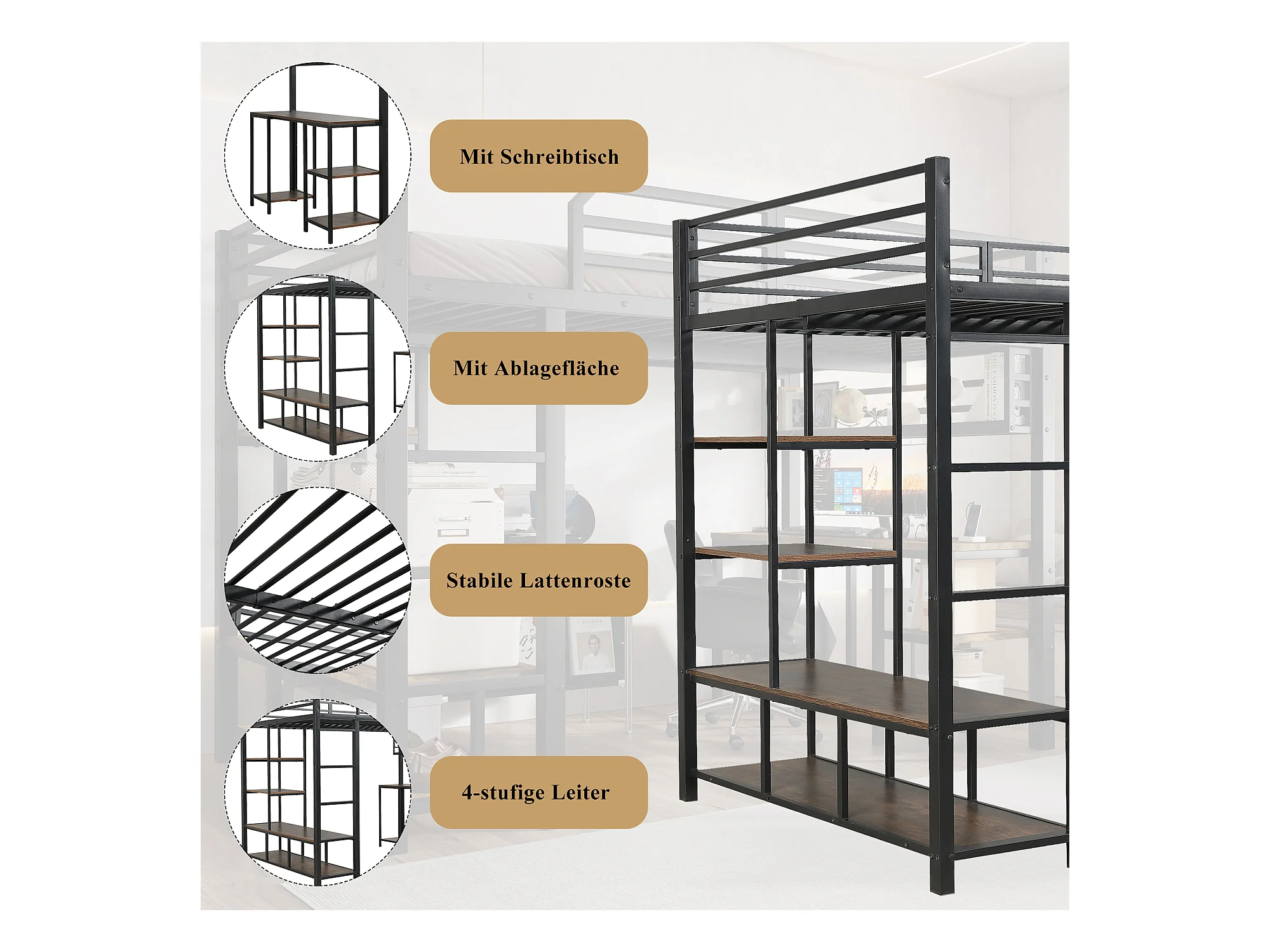 Lit mezzanine en fer - 120 x 200 cm - avec bureau + rangement - sommier à lattes - fer + aggloméré - noir