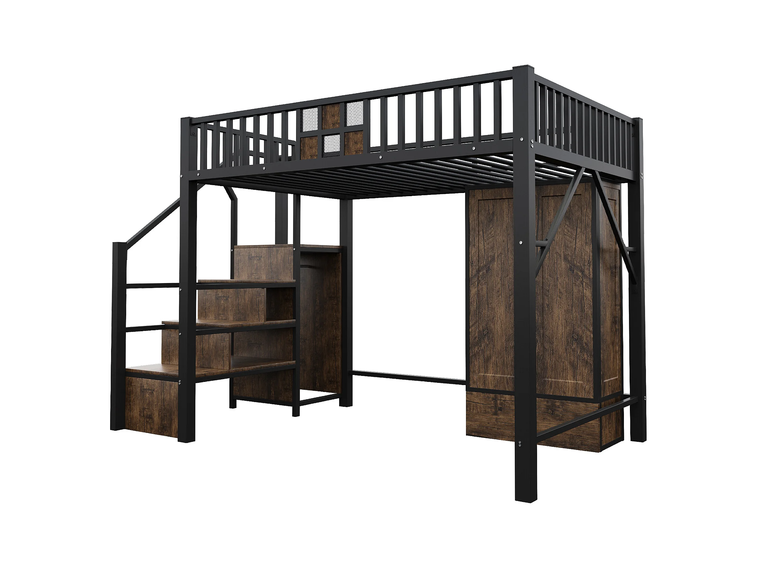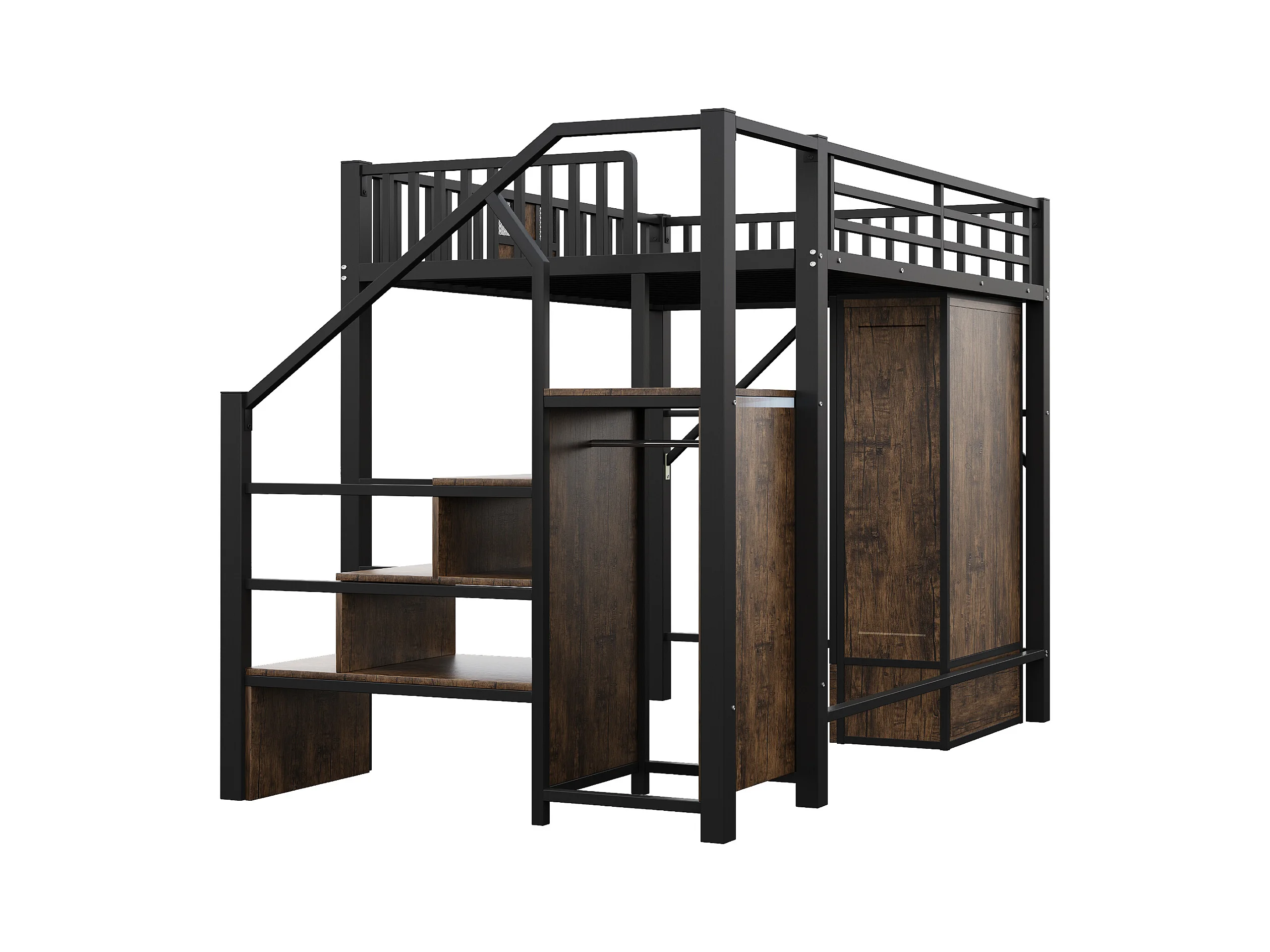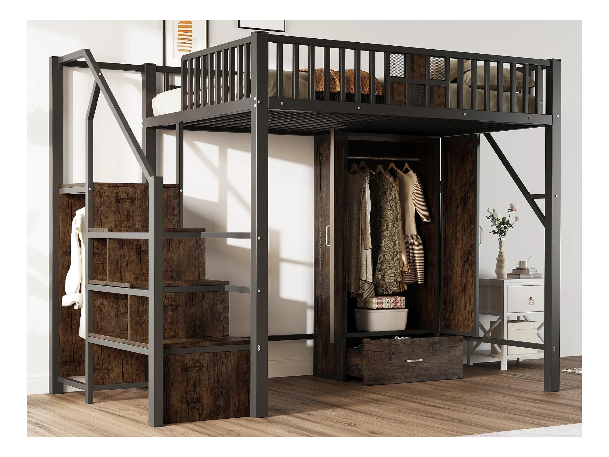 Lit mezzanine en métal 140x200 cm - avec penderie - 1 tiroir - avec échelle de rangement - noir (matelas non inclus)