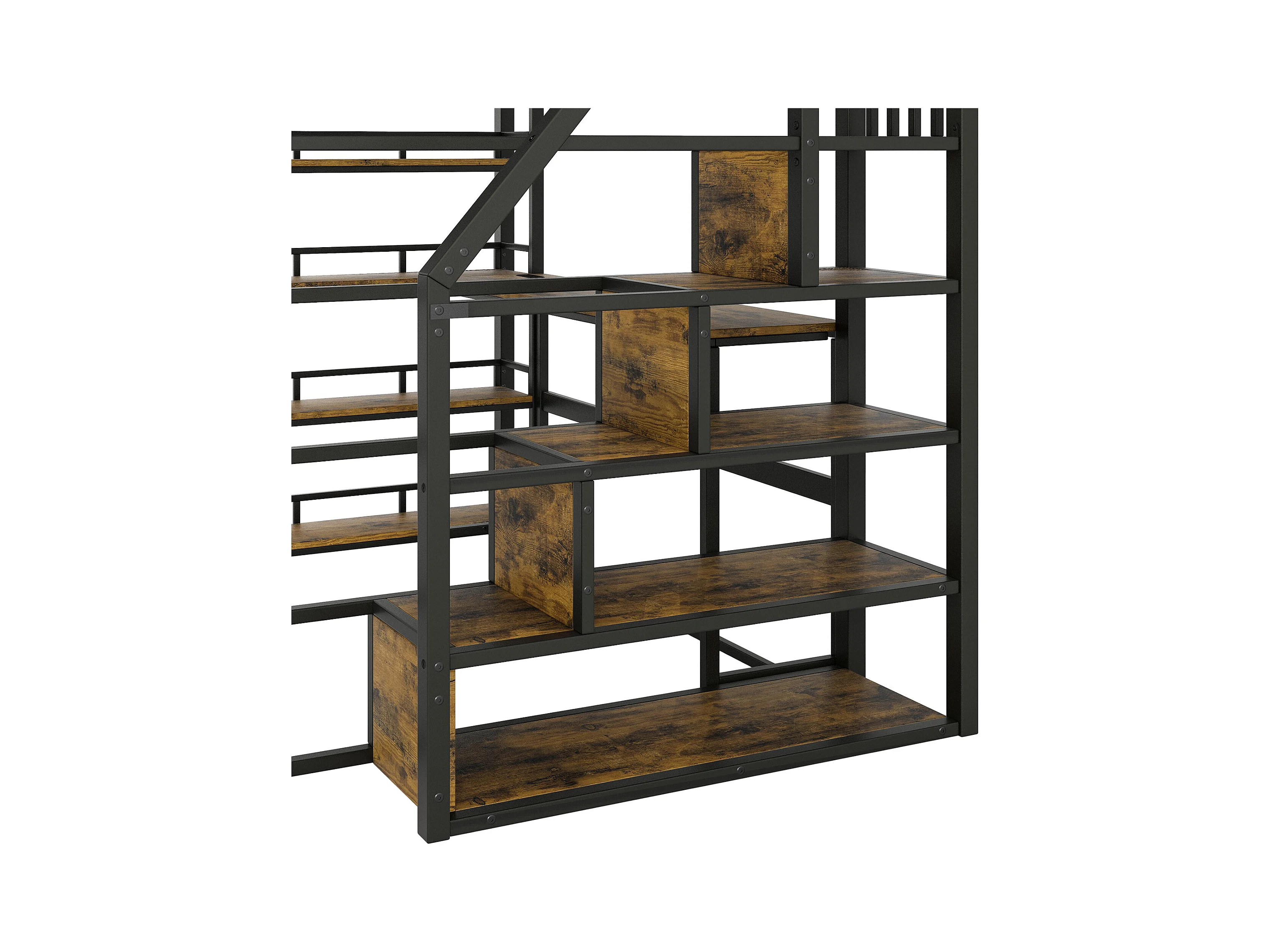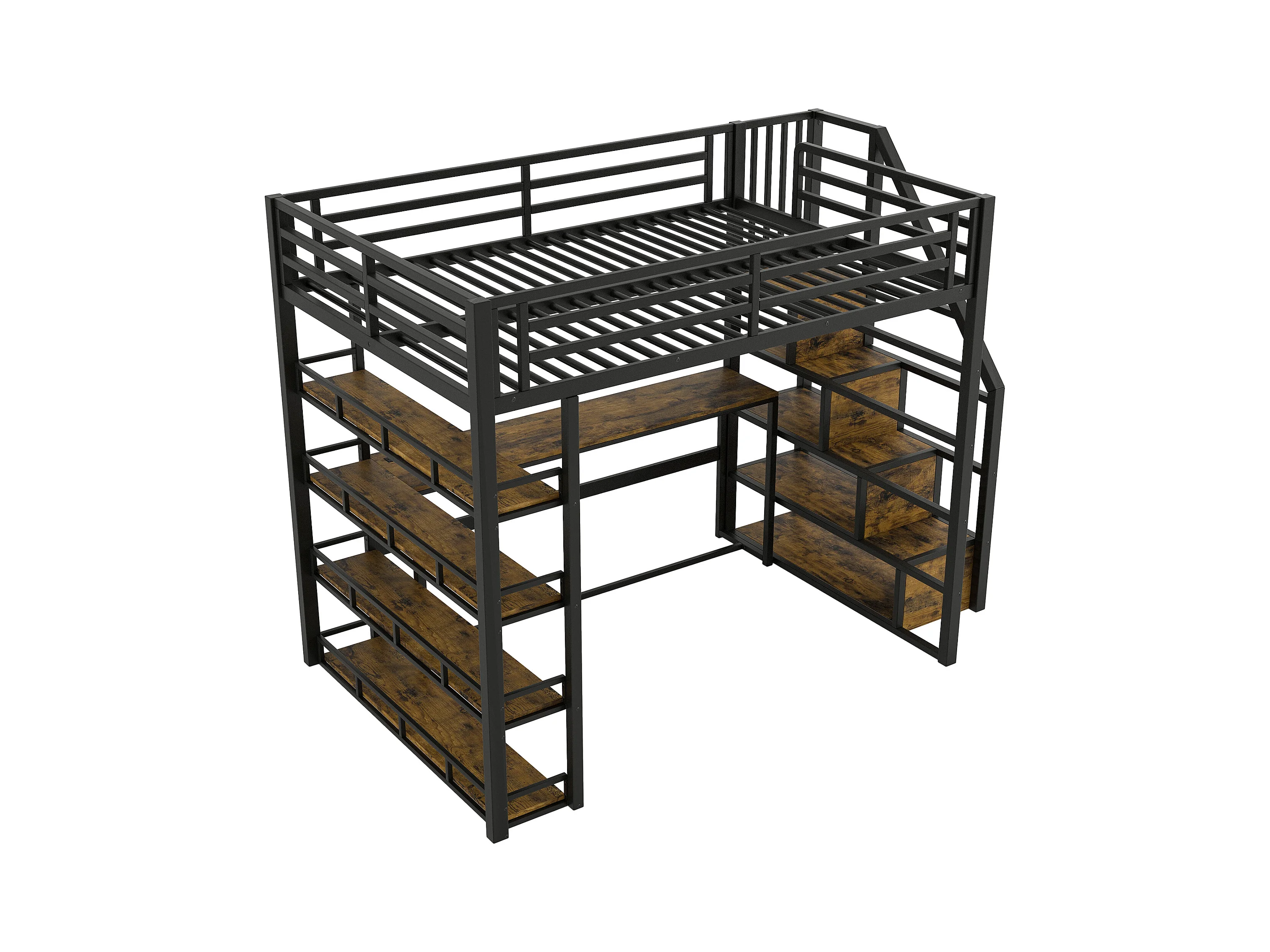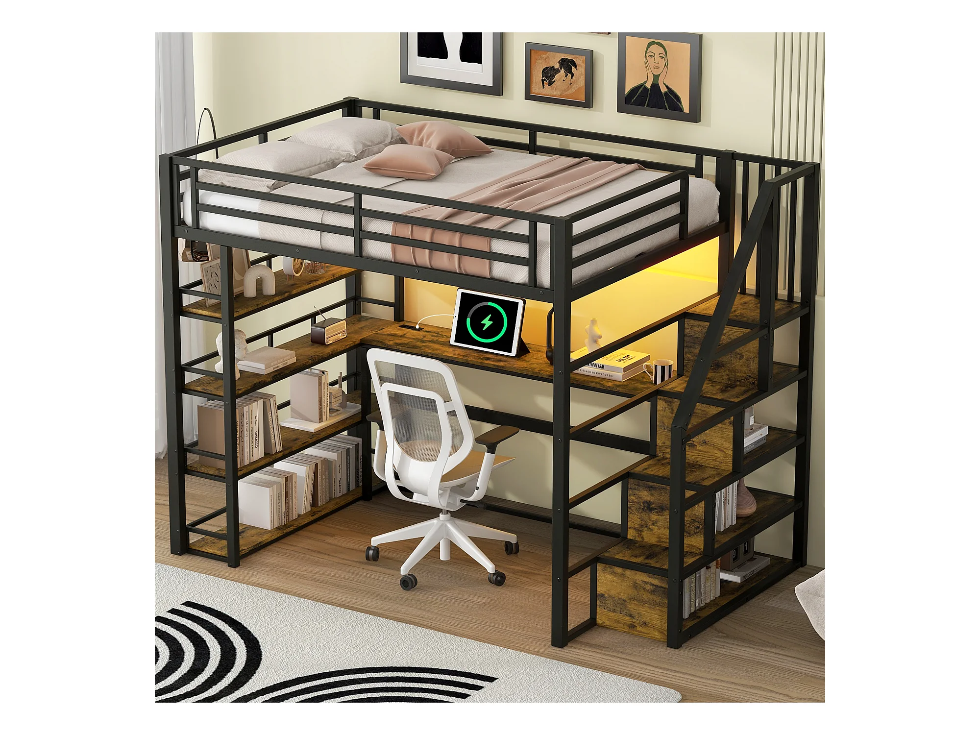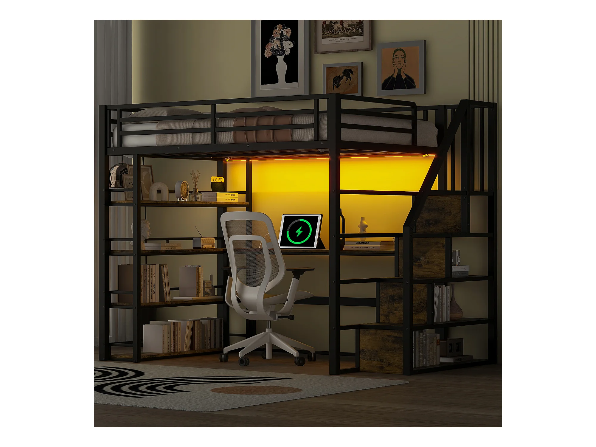 Lit mezzanine en métal 140x200cm - avec éclairage LED - avec escalier - avec bureau - chargement USB - noir