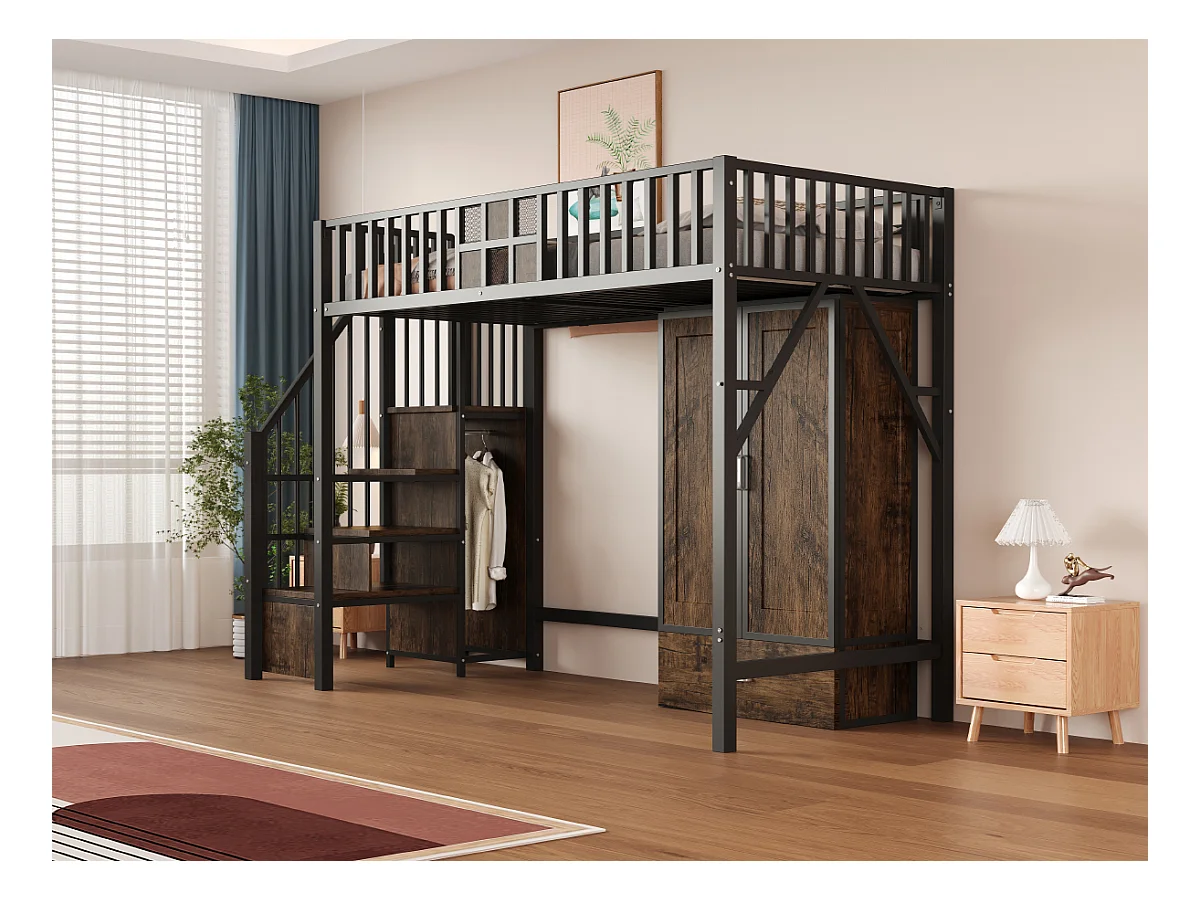 Lit mezzanine en métal - 90 x 200 cm - avec armoire + tiroir + échelle de rangement - métal + bois - noir