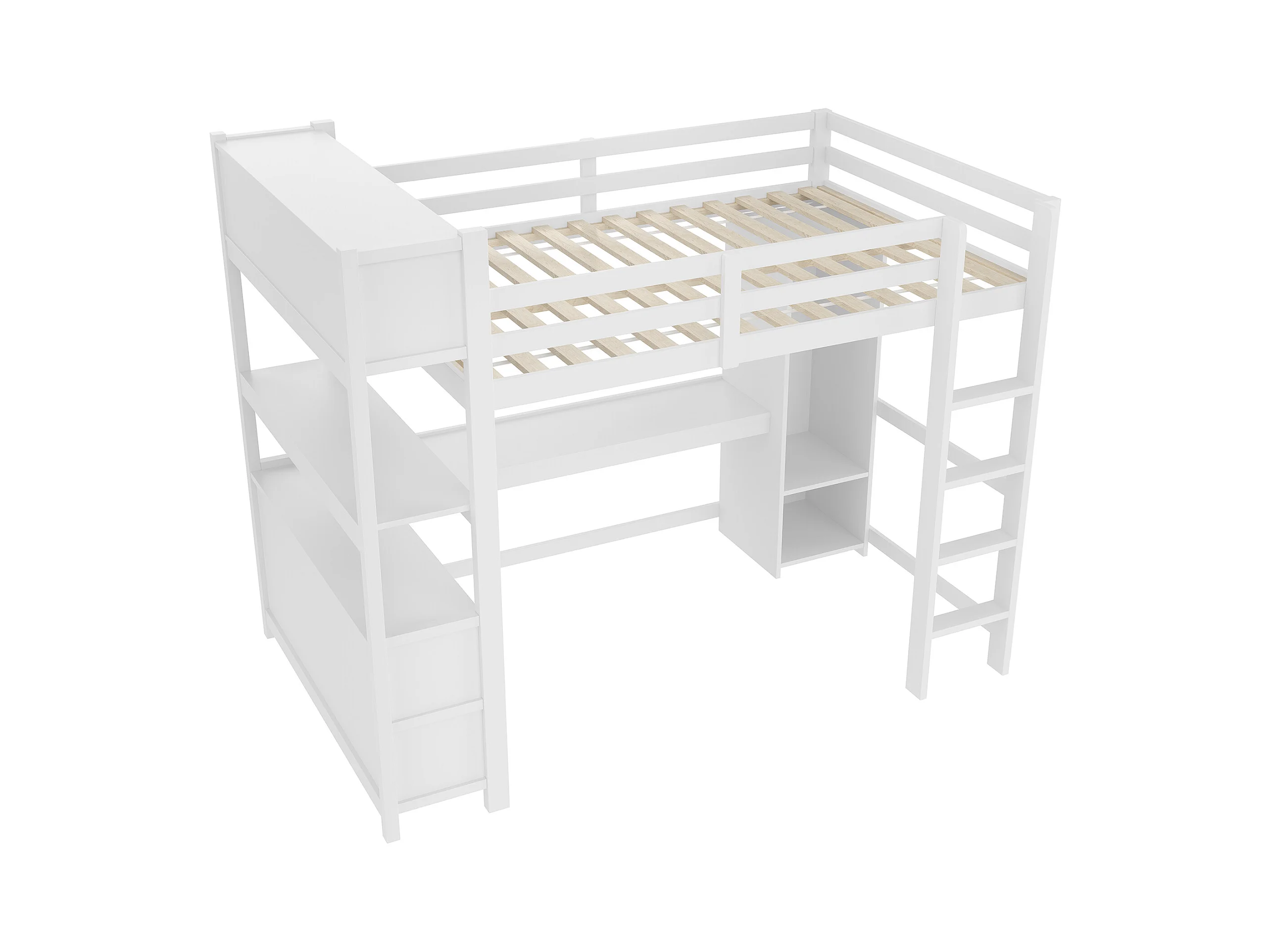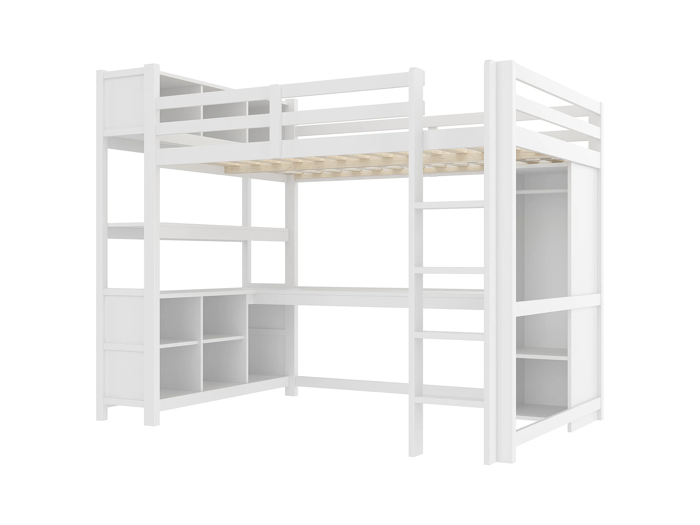 Lit mezzanine enfant - 140 x 200 cm - avec étagères de rangement + bureau + penderie - bois - blanc