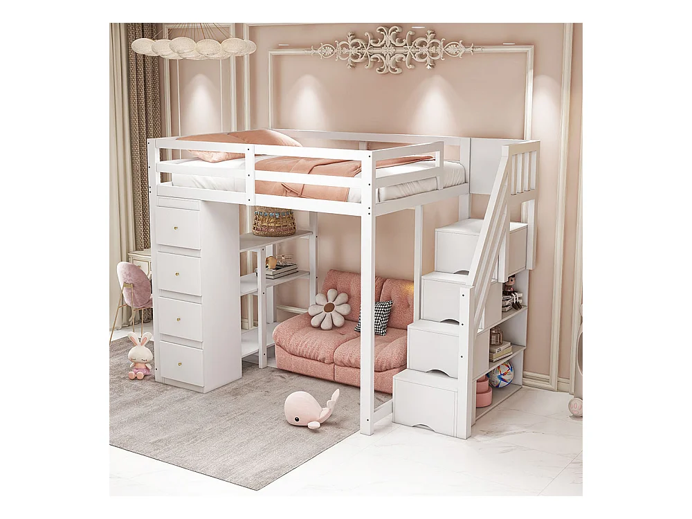 Lit mezzanine enfant 140x200 avec tiroir de rangement Commode avec étagères  échelle à grimper de sécurité Blanc