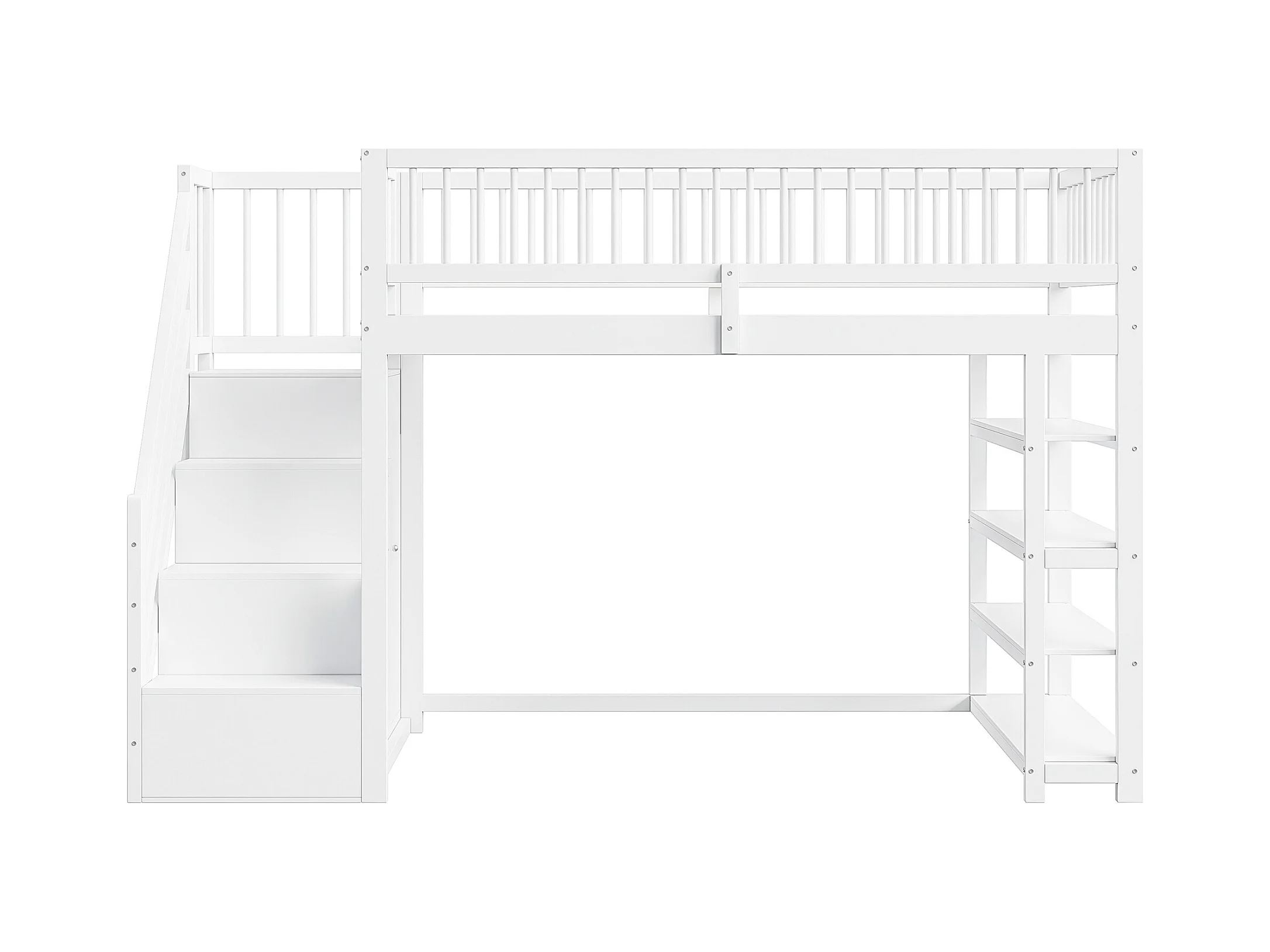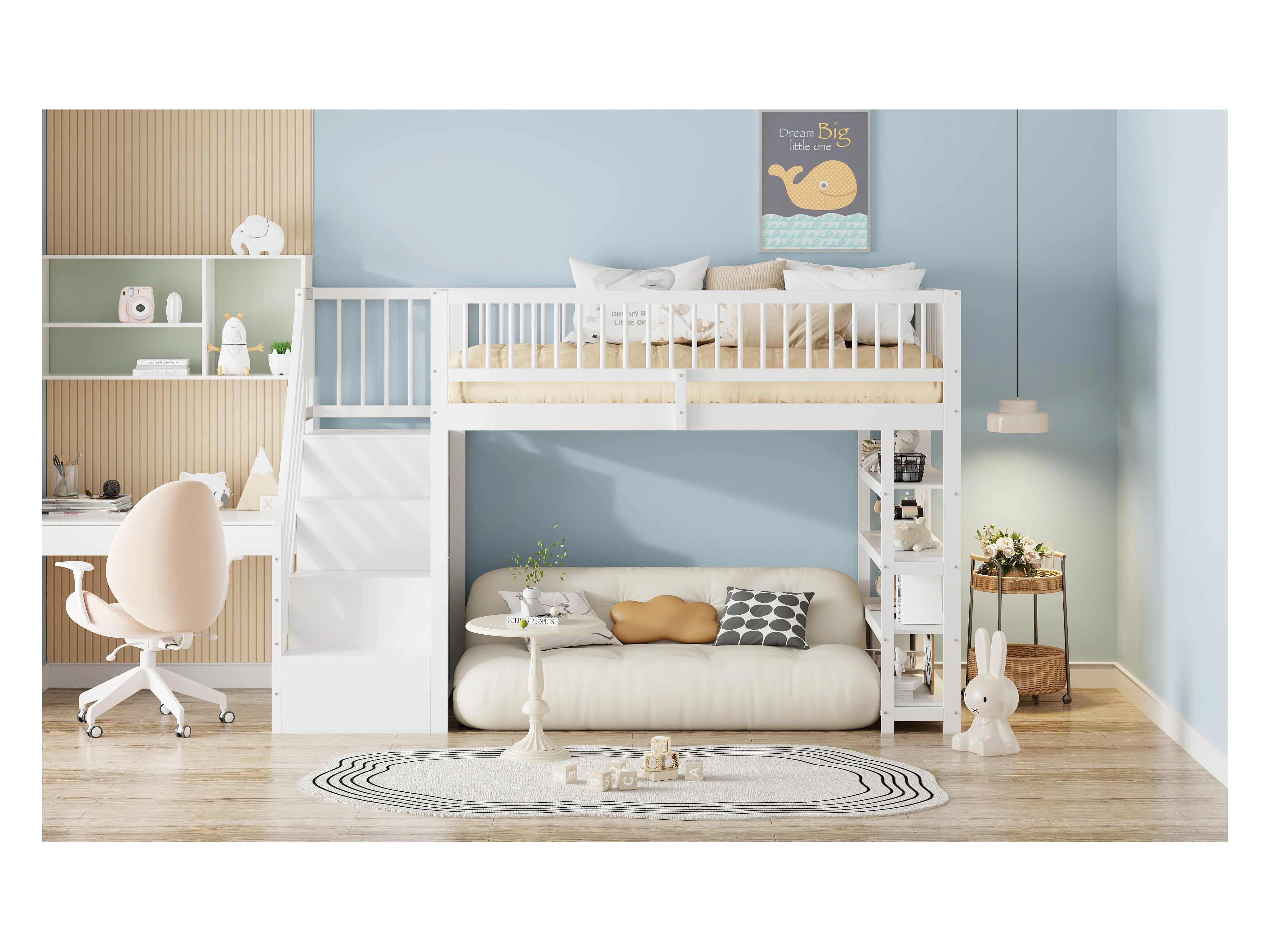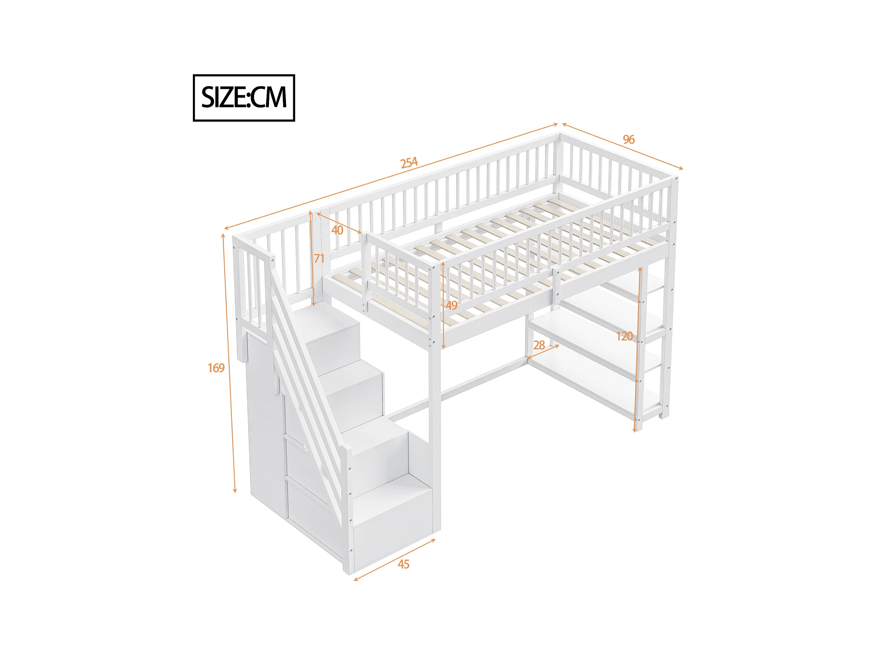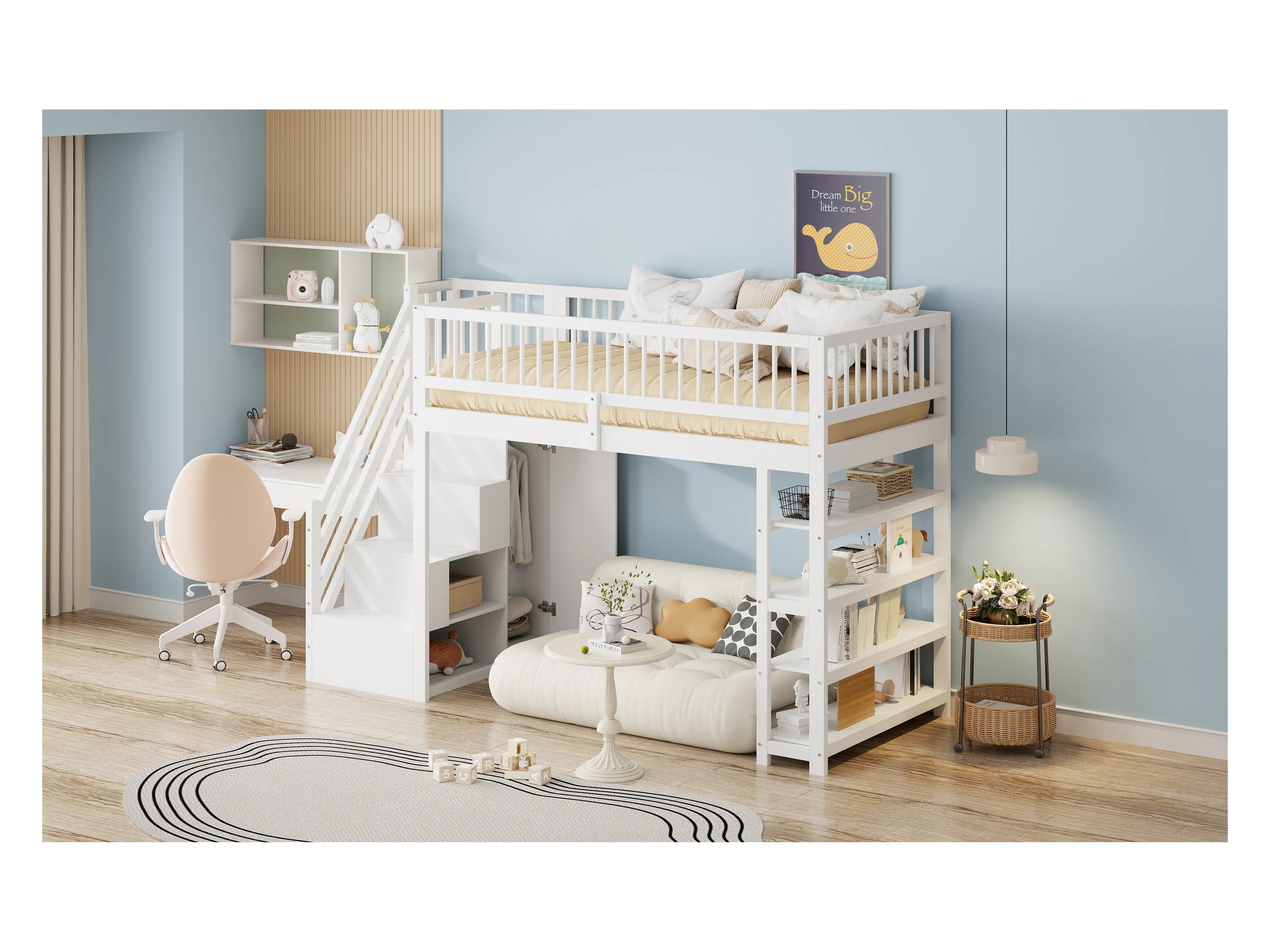 Lit mezzanine enfant - 90 x 200 - avec clôture + armoire + étagères de rangement - bois - blanc