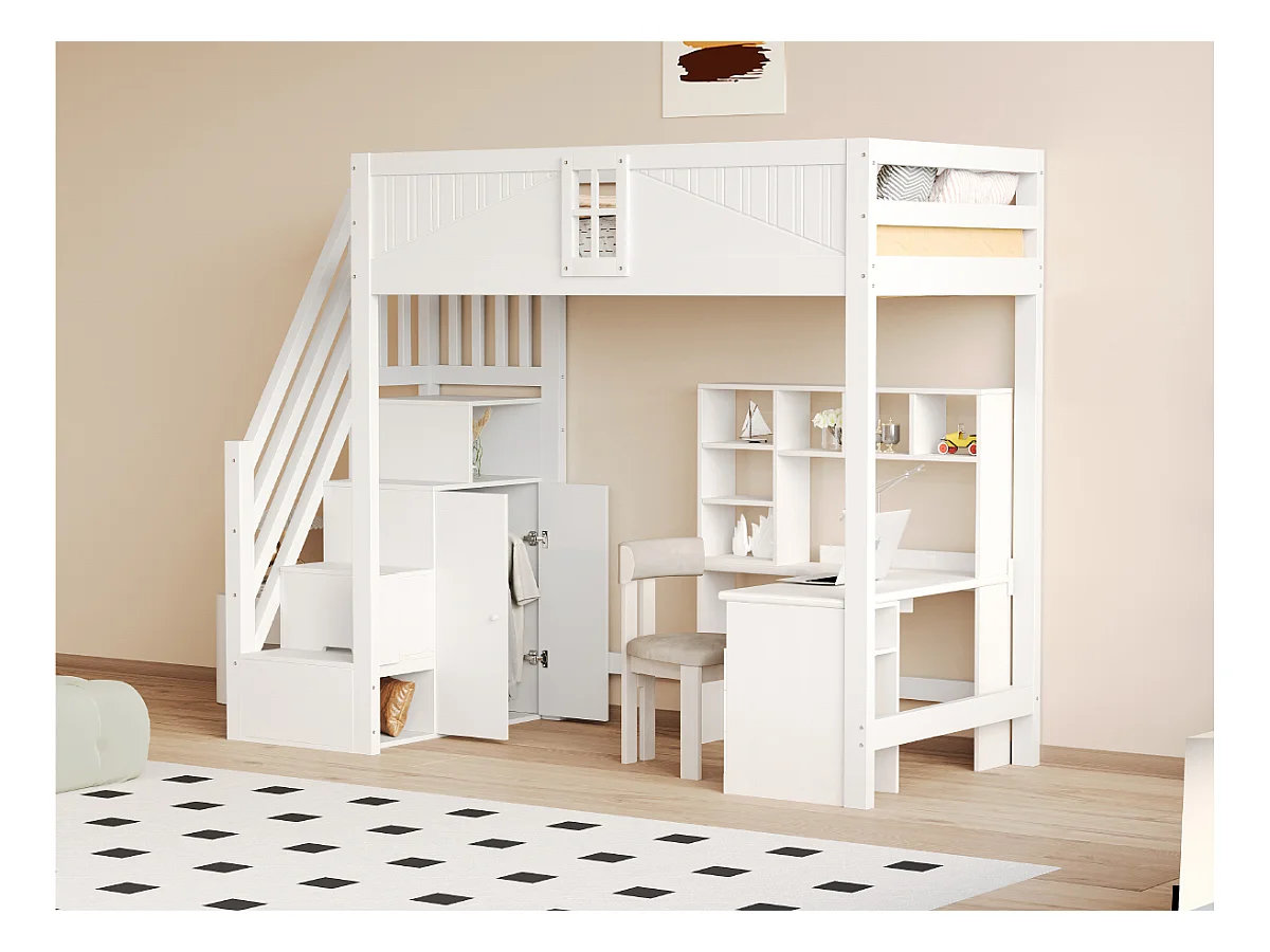 Lit mezzanine enfant - 90 x 200 cm - avec escalier rangement + fenêtre + armoire - bois + MDF - blanc