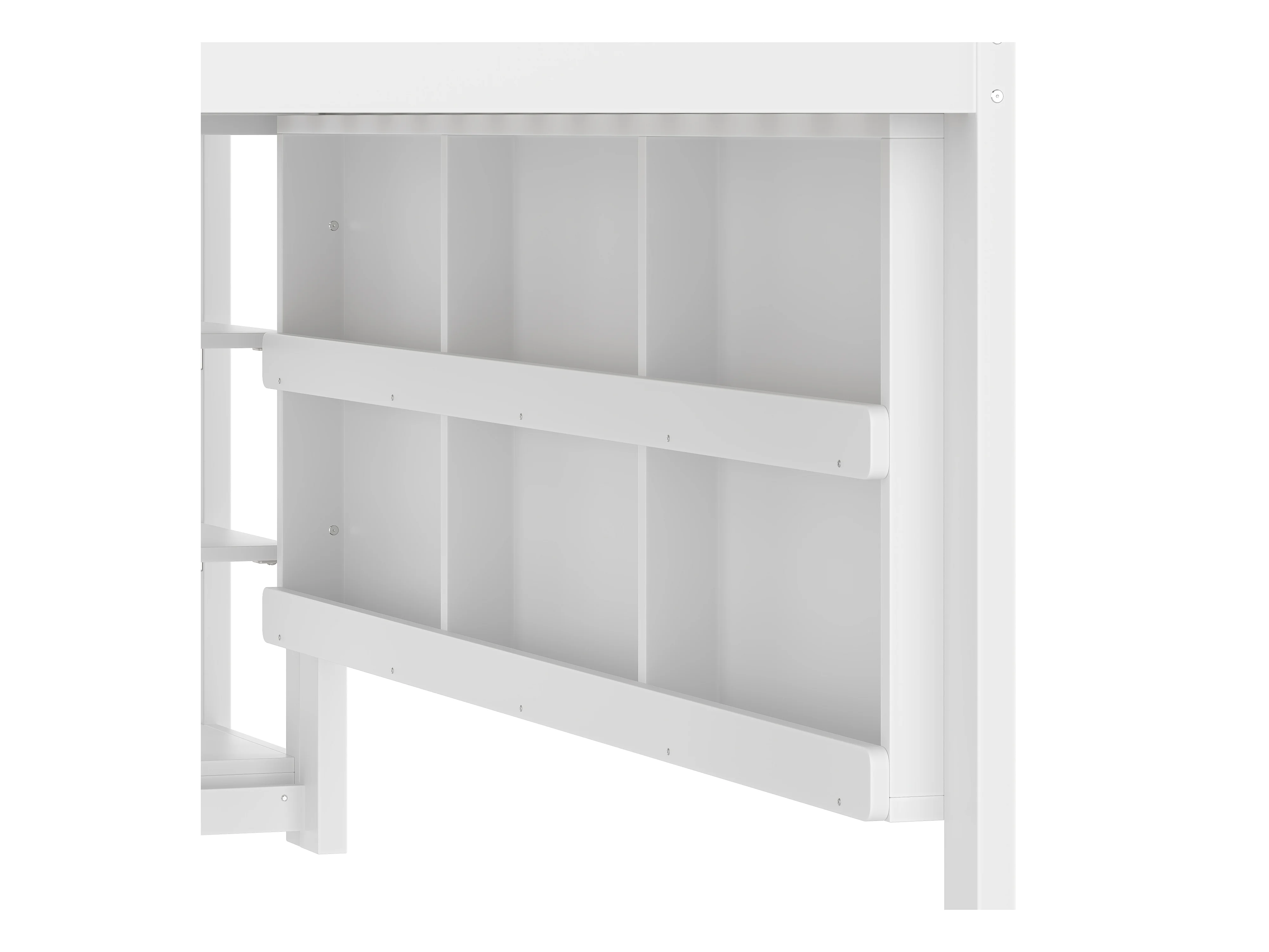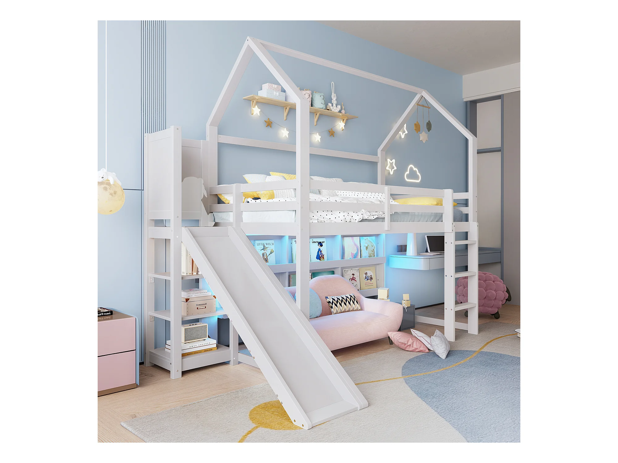 Lit mezzanine enfant - 90 x 200 cm - avec Leds + étagères + clôture - forme maison - pin - blanc