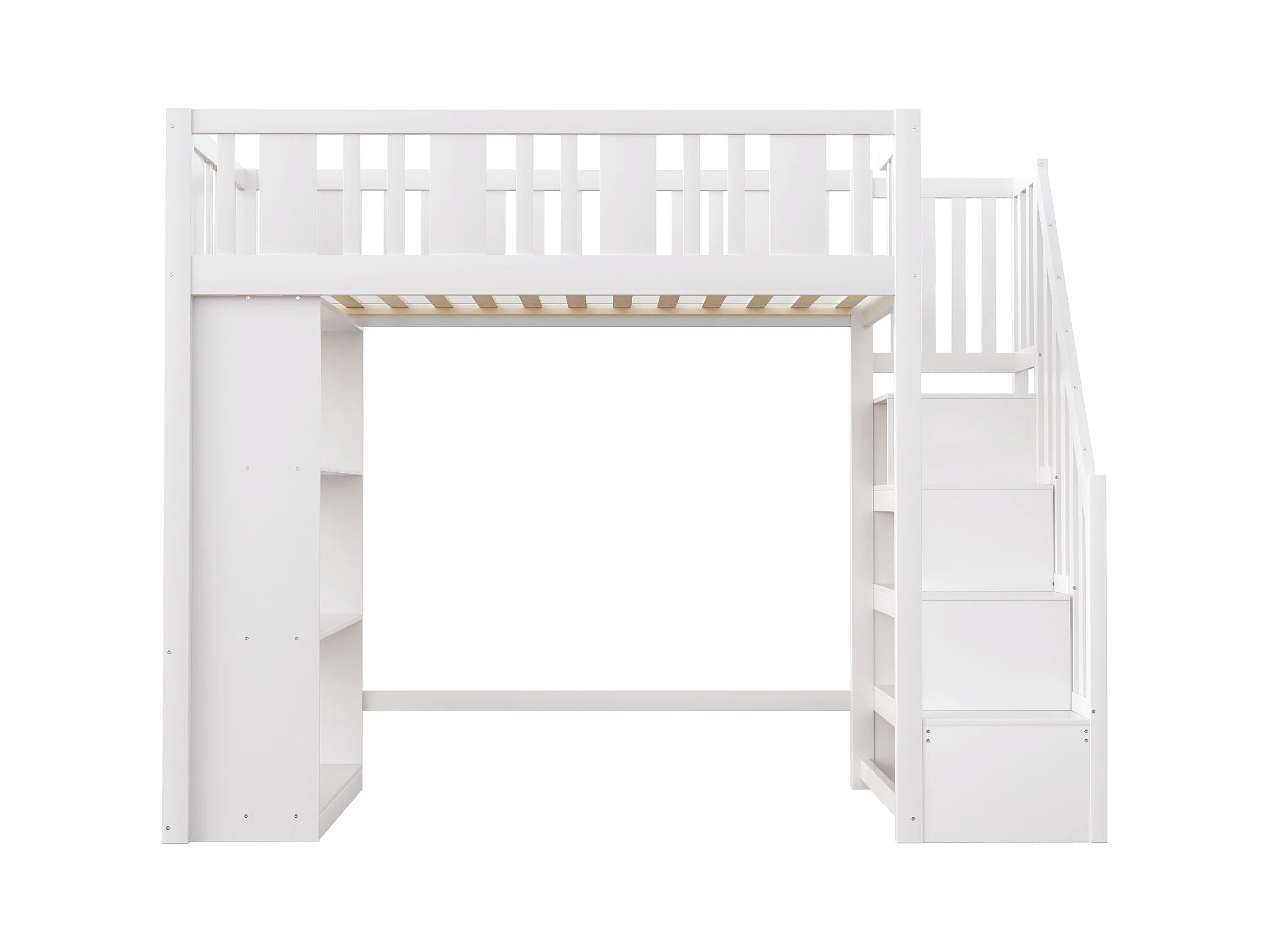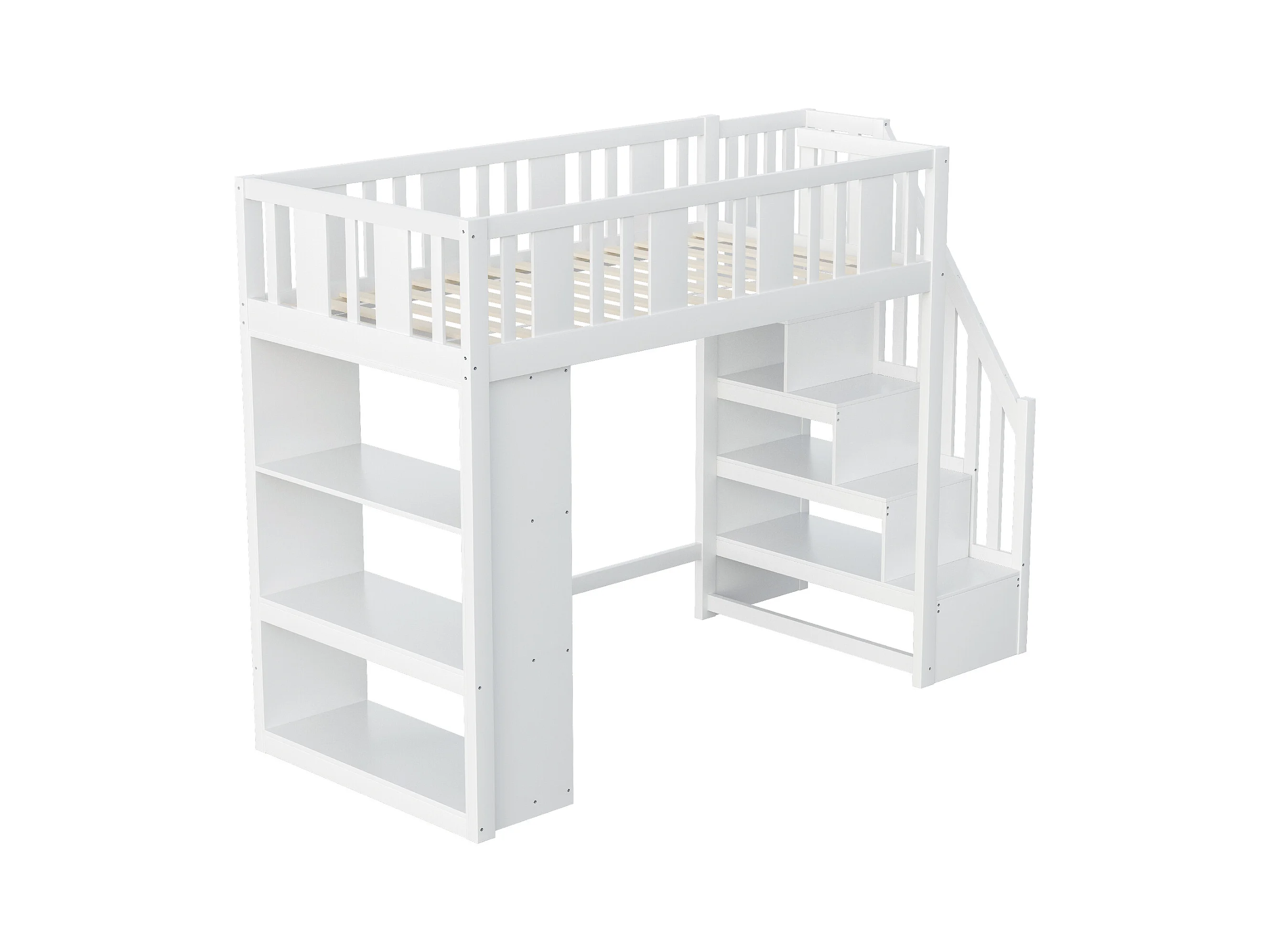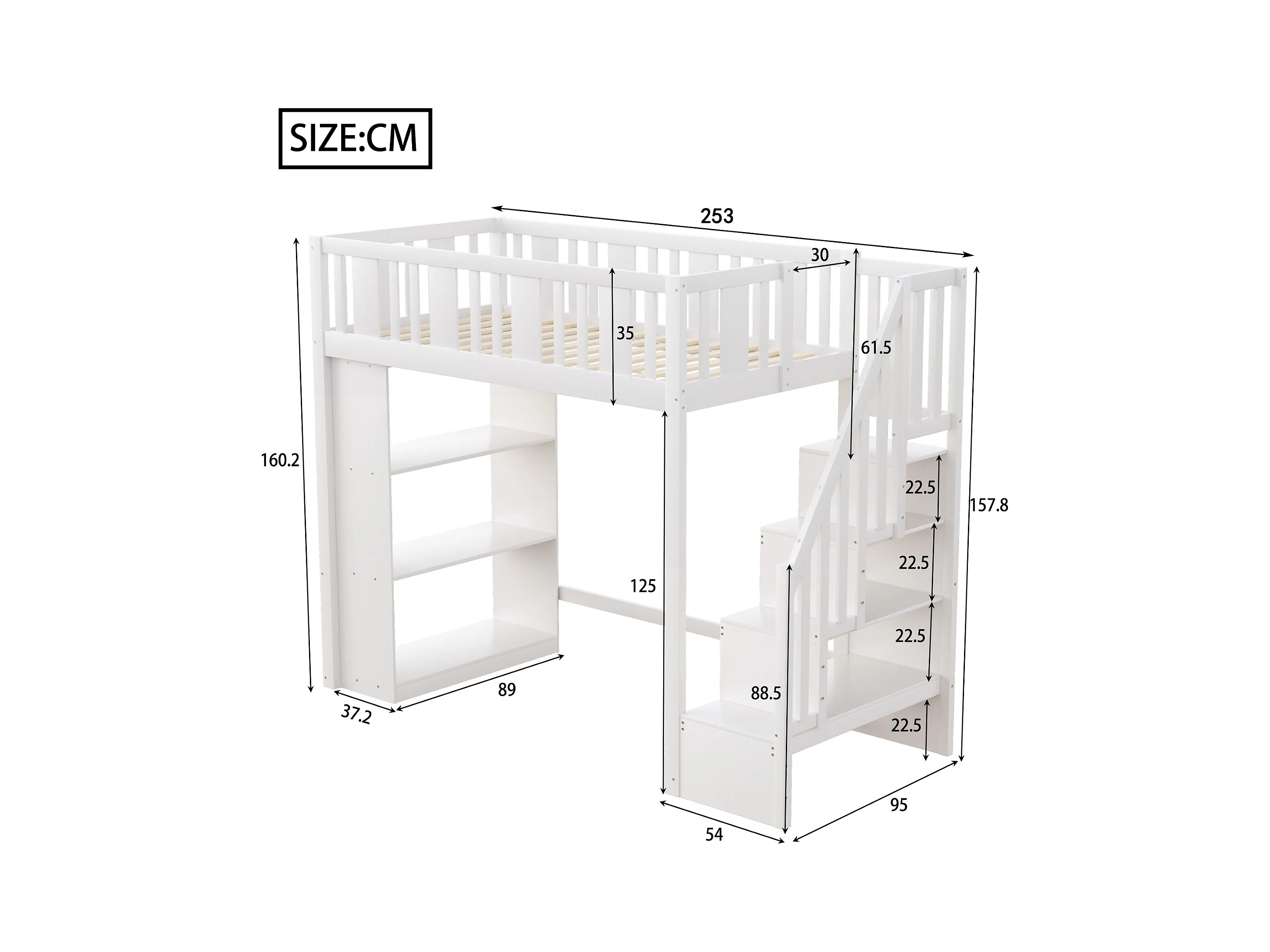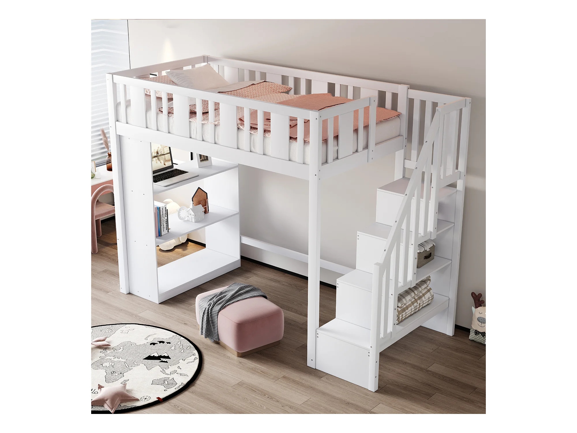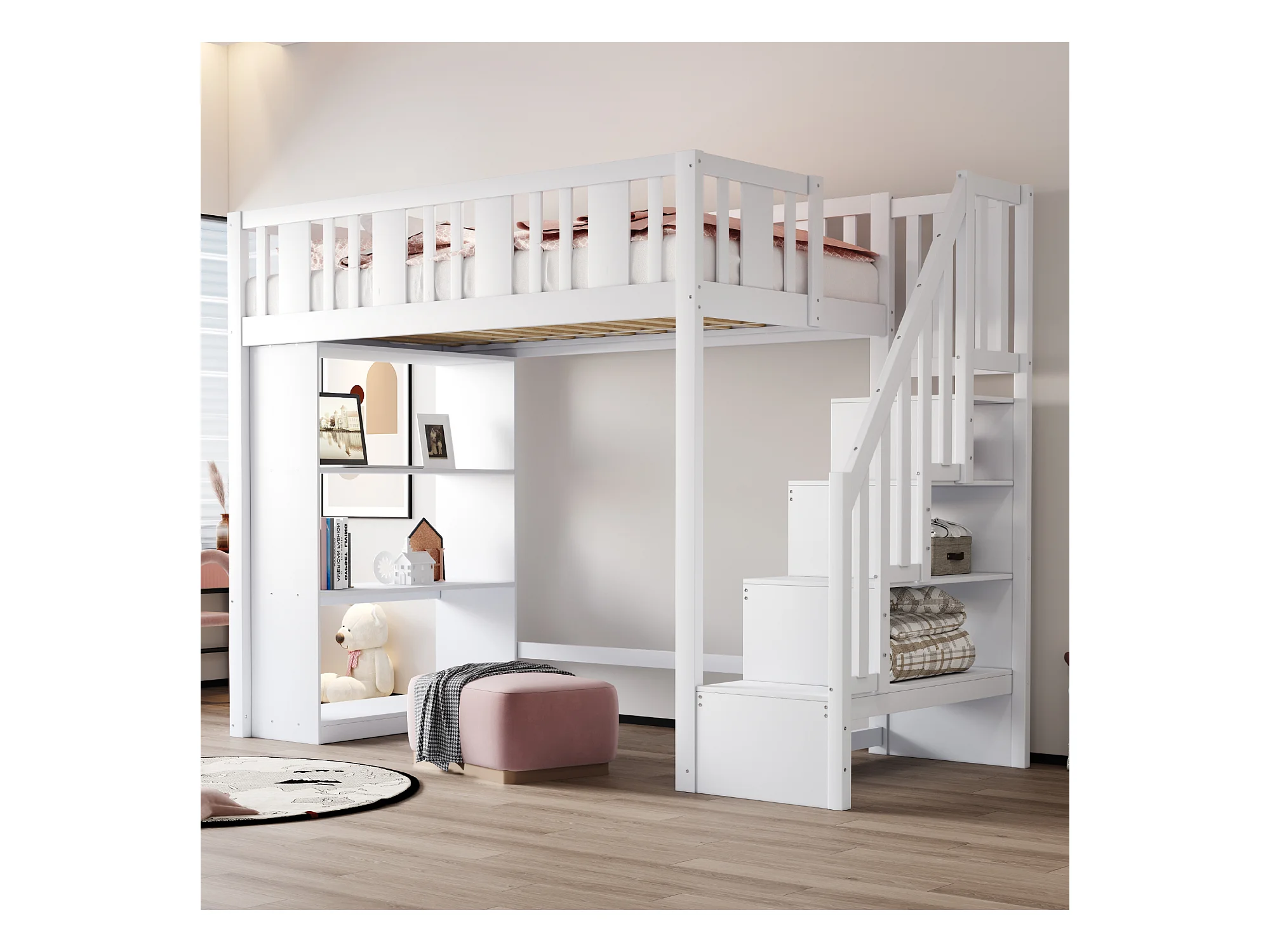 Lit mezzanine enfant - 90 x 200 cm - avec rangements dans l'escalier et étagère de rangement - bois + MDF - blanc