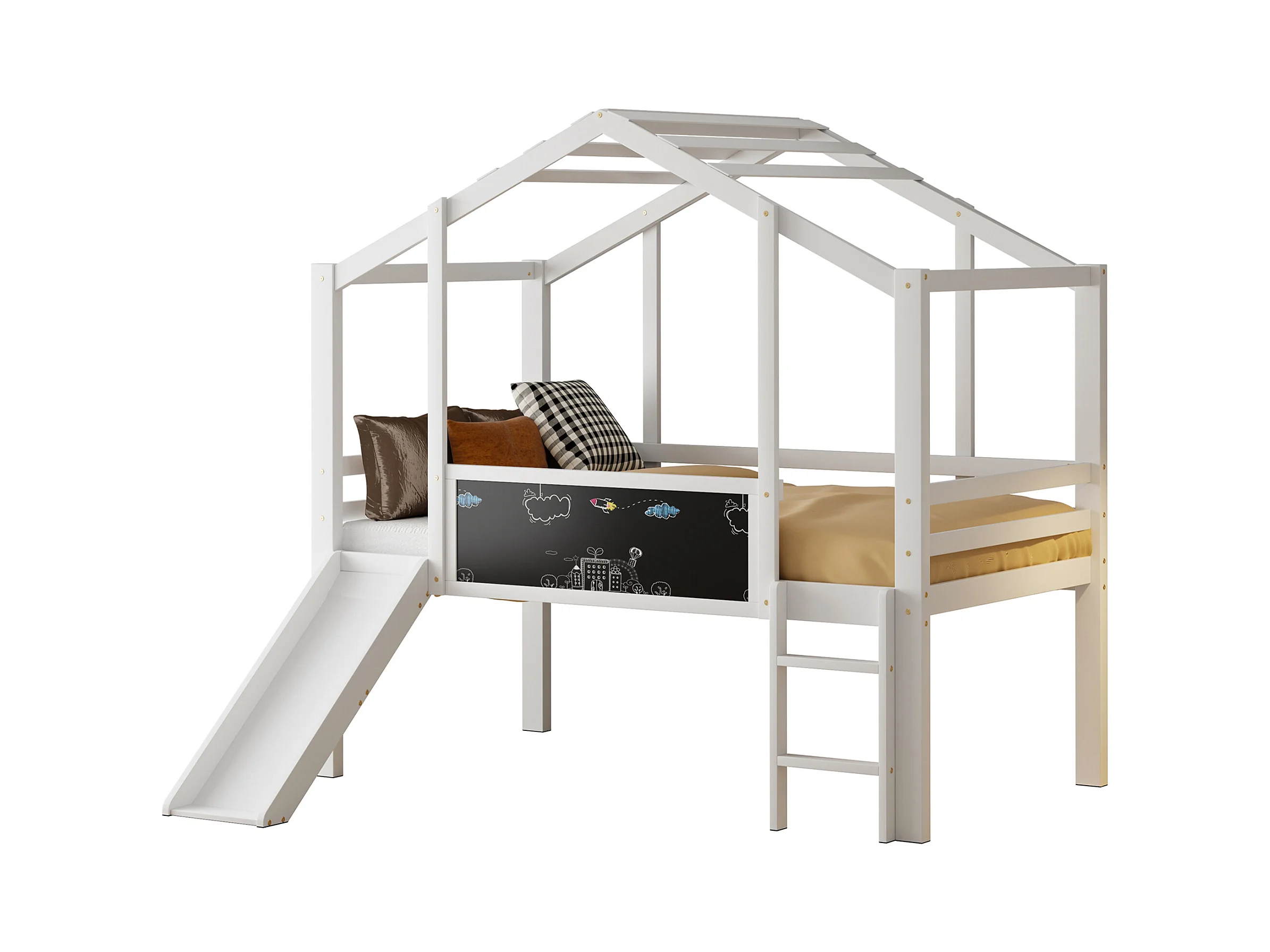 Lit mezzanine enfant 90x200 cm - avec échelle de sécurité - avec toboggan - avec tableau à dessin - Blanc (matelas non inclus)