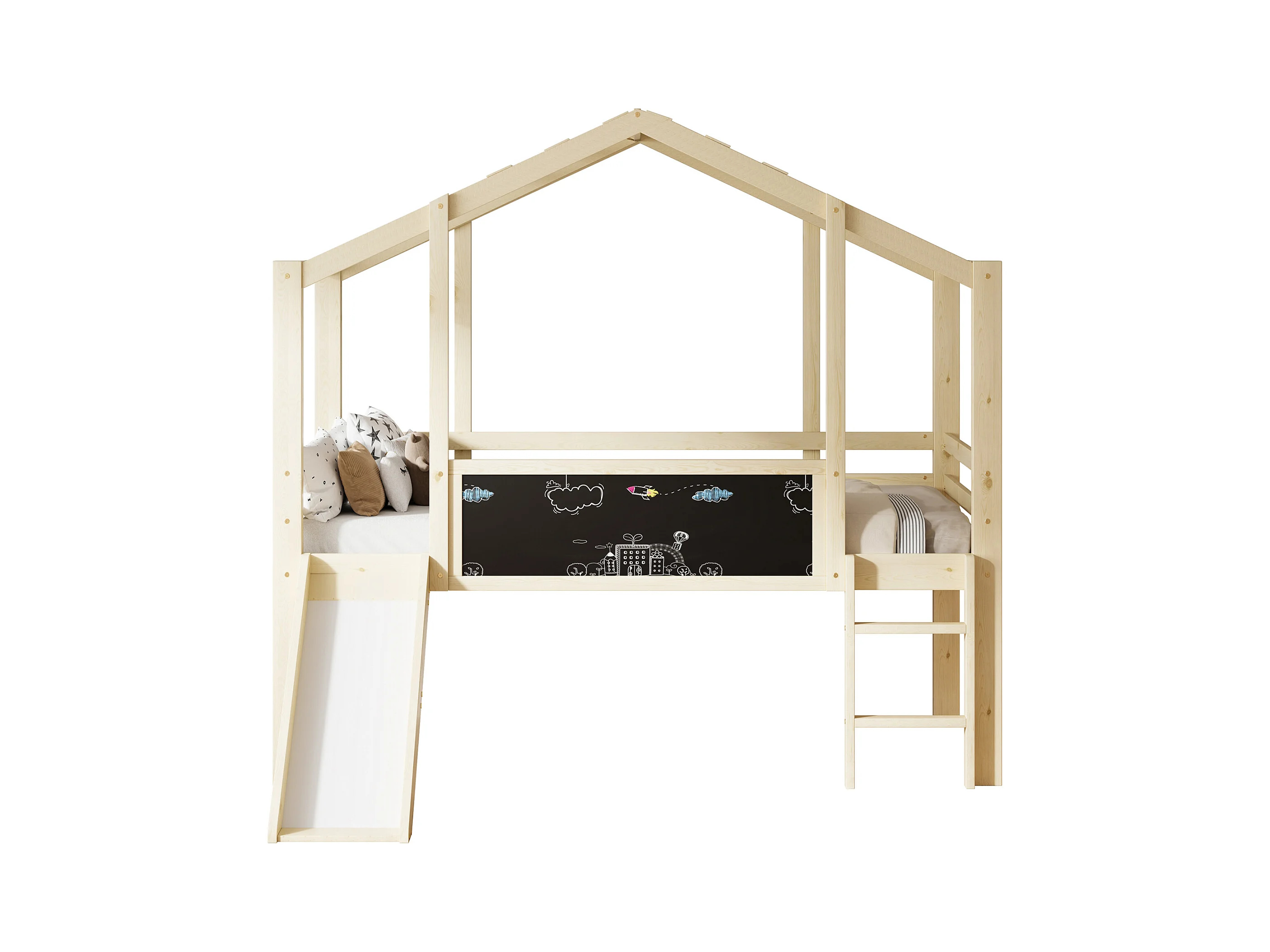 Lit mezzanine enfant 90x200 cm - avec échelle de sécurité - avec toboggan - avec tableau à dessin - Naturel (matelas non inclus)