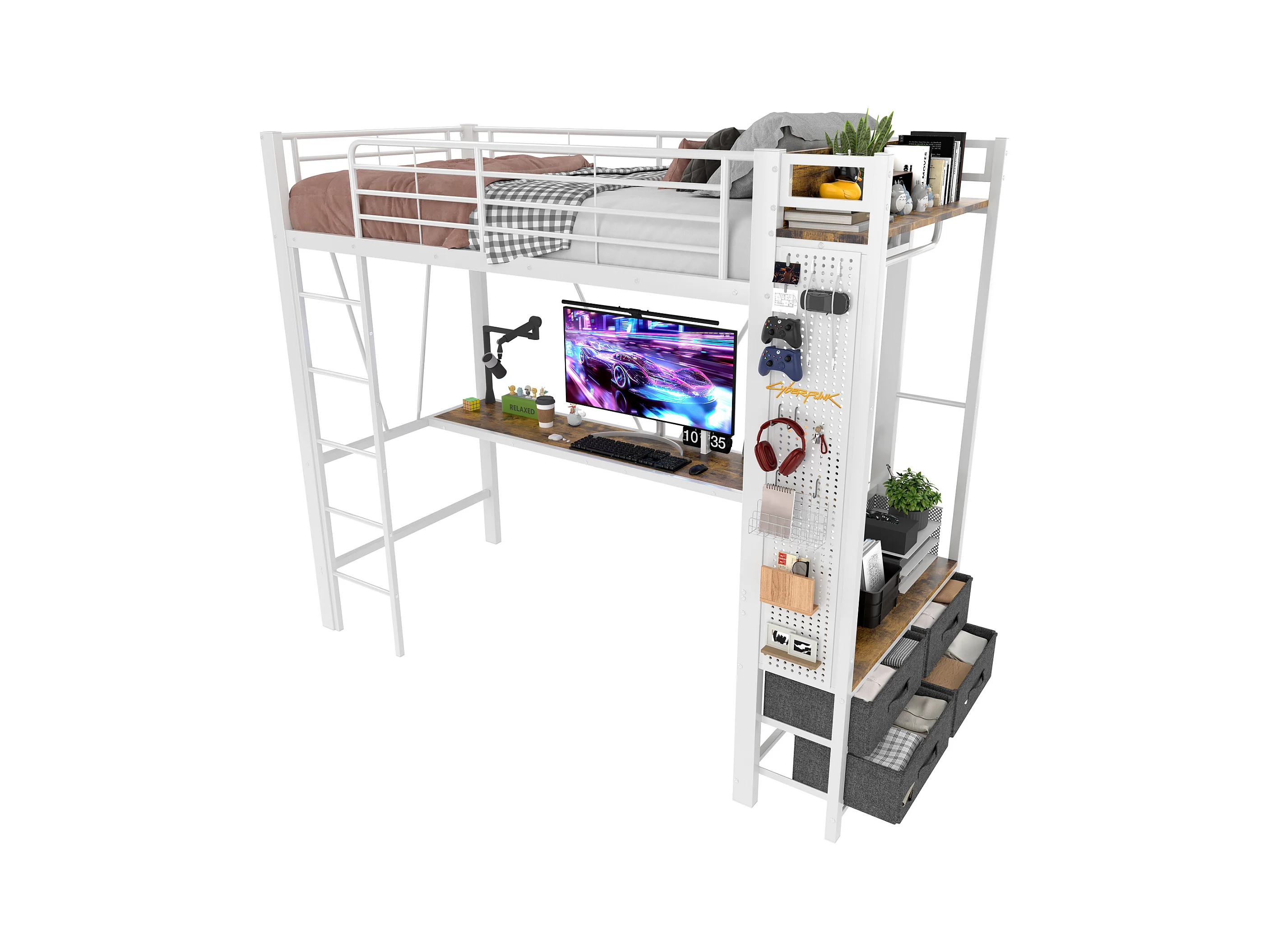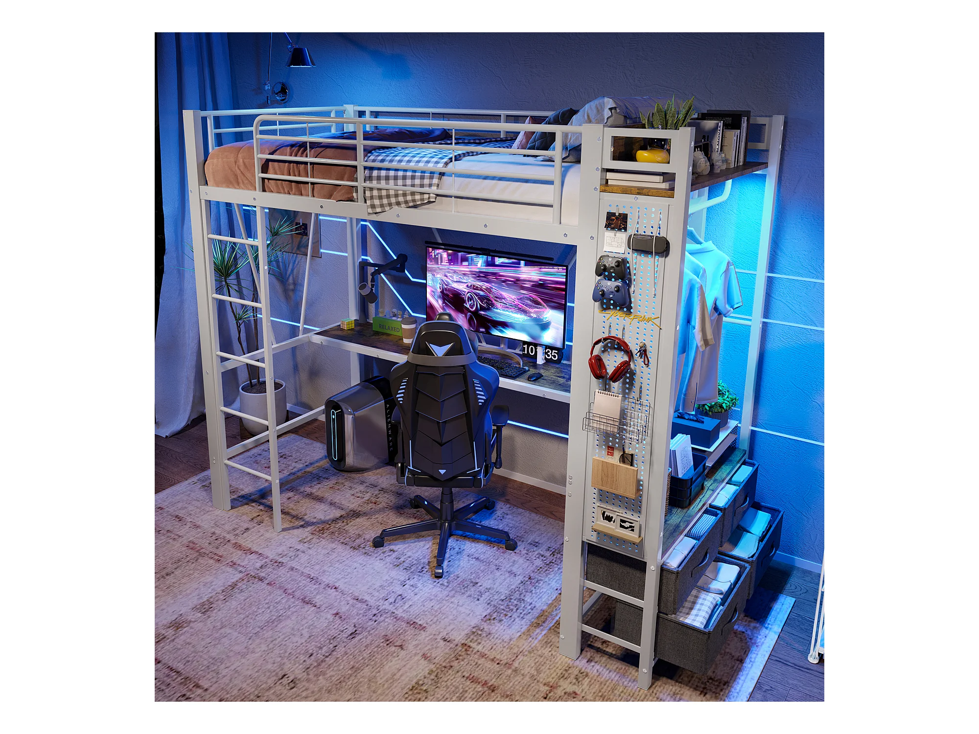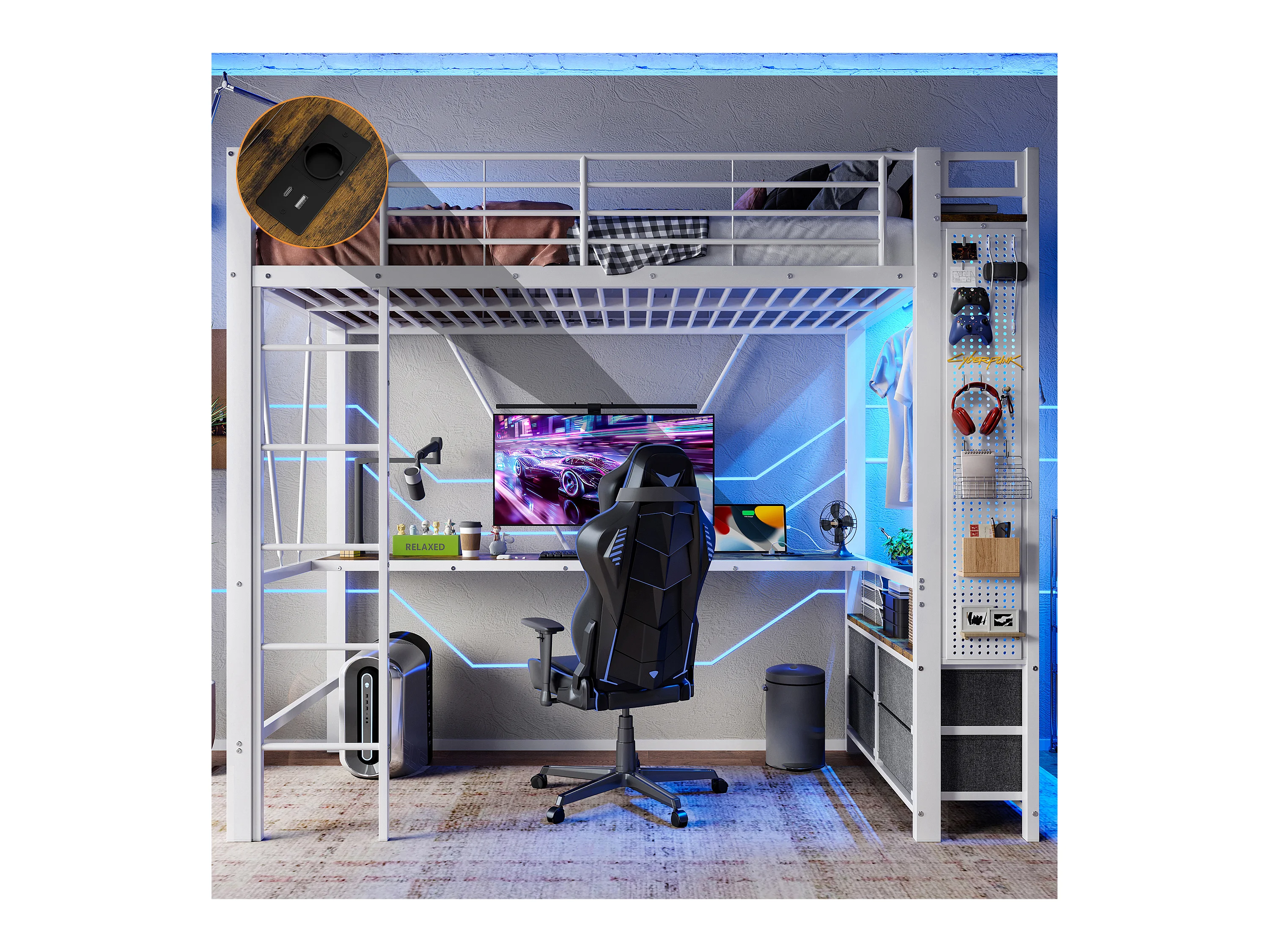 Lit mezzanine enfant blanc 90x200cm avec bureau, 4 tiroirs, LED, étendoir à linge et USB + TYPE-C (sans matelas)