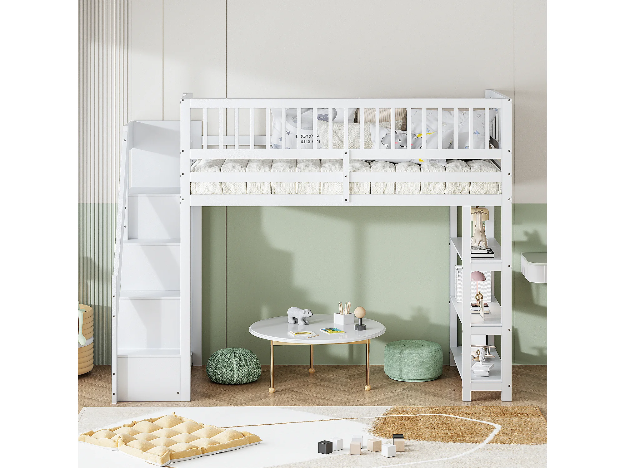 Lit mezzanine multifonction 90x200cm avec armoire, étagères, rangement, escalier sécurisé, bois massif blanc (245.5x101x159.5 cm)