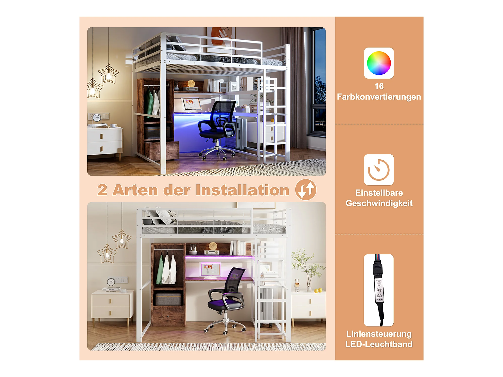 Lit mezzanine pour enfant - 140 x 200 cm - avec armoire + Leds + bureau + 1 tiroir - MDF + métal - blanc