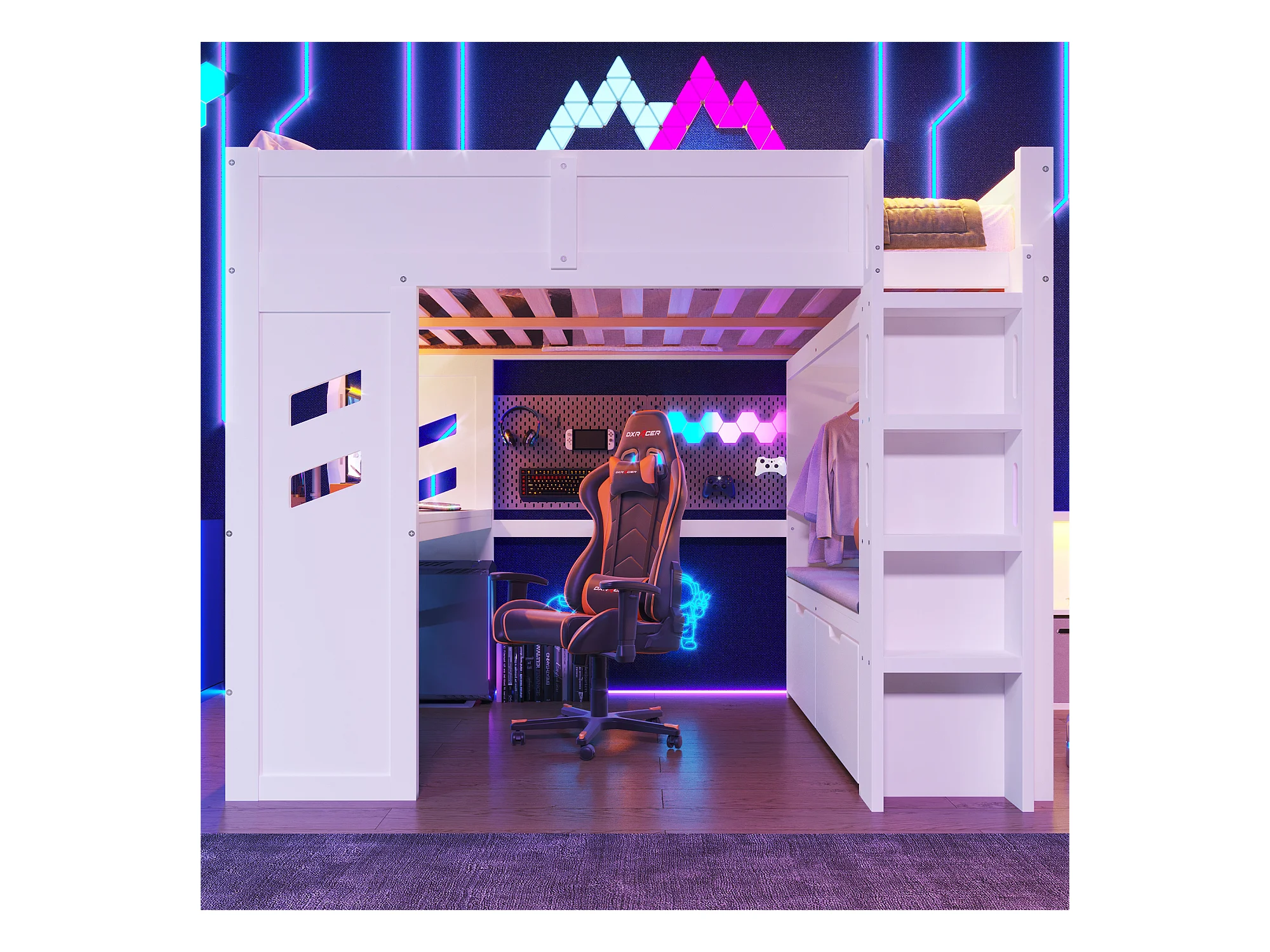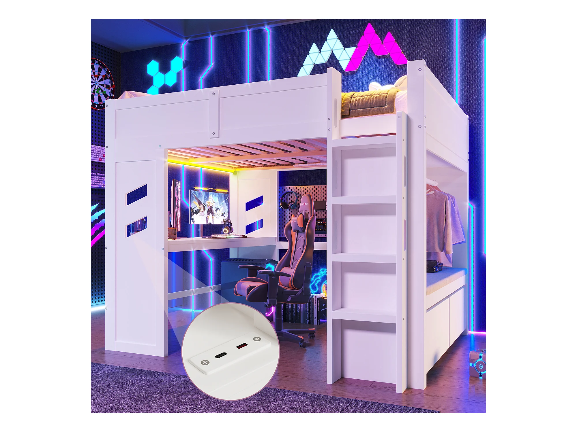 Lit mezzanine pour enfant - 140 x 200 cm - avec bureau + Leds + port USB + 2 tiroirs - bois - blanc