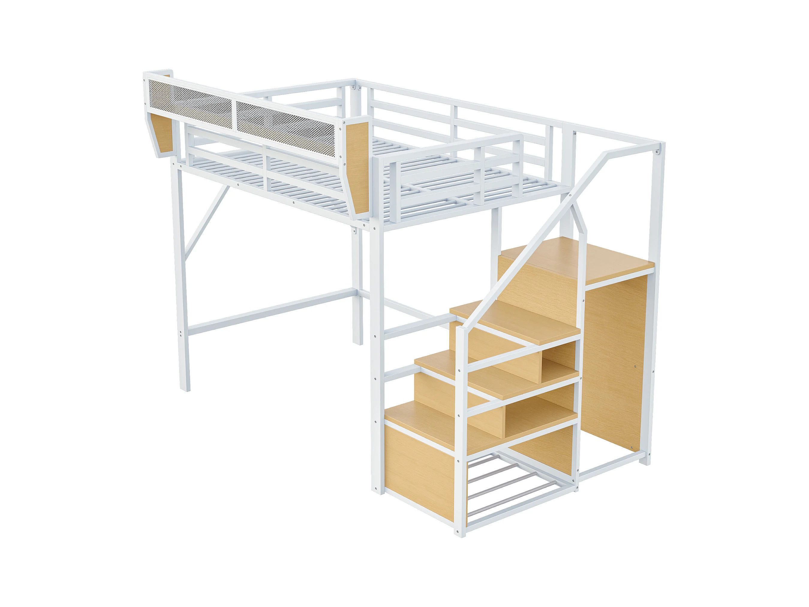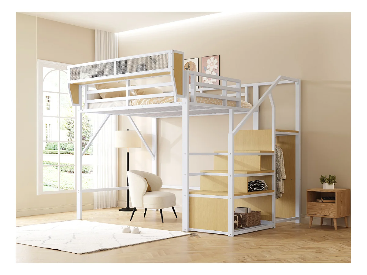 Lit mezzanine pour enfant - 140 x 200 cm - avec escalier de rangement + armoire - MDF + Métal - blanc