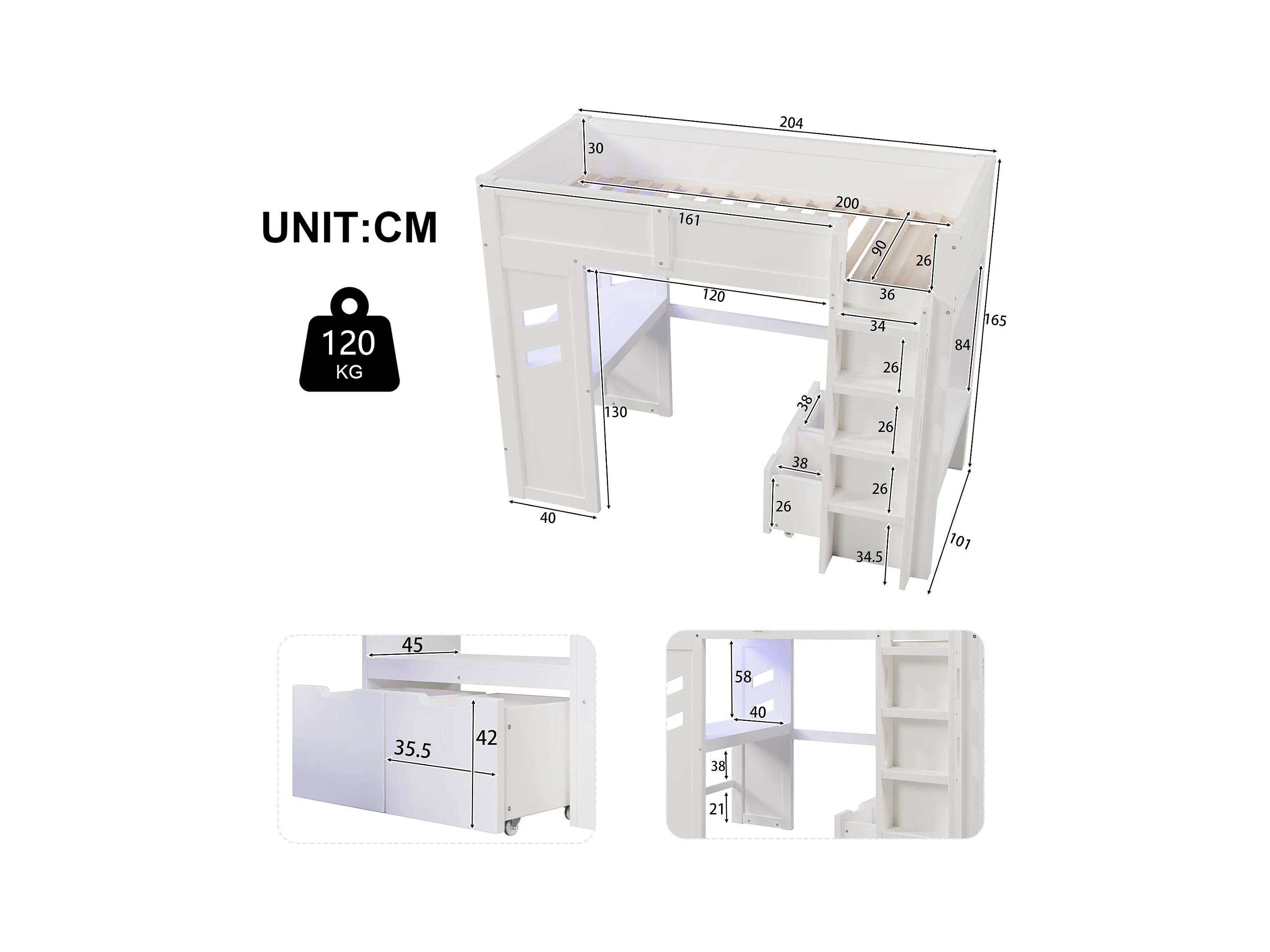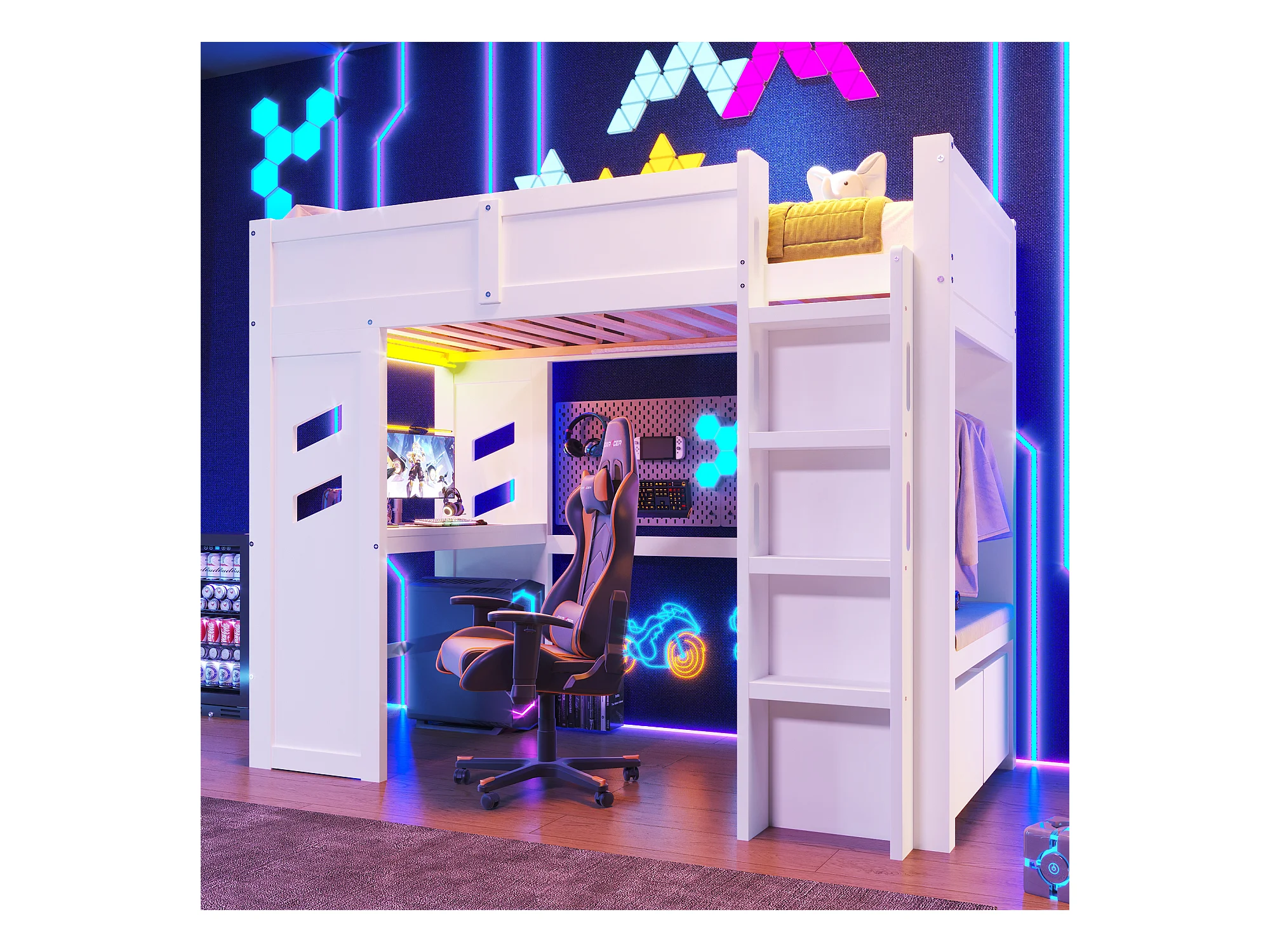 Lit mezzanine pour enfant - 90 x 200 cm - avec bureau + Leds + port USB + 2 tiroirs - bois - blanc