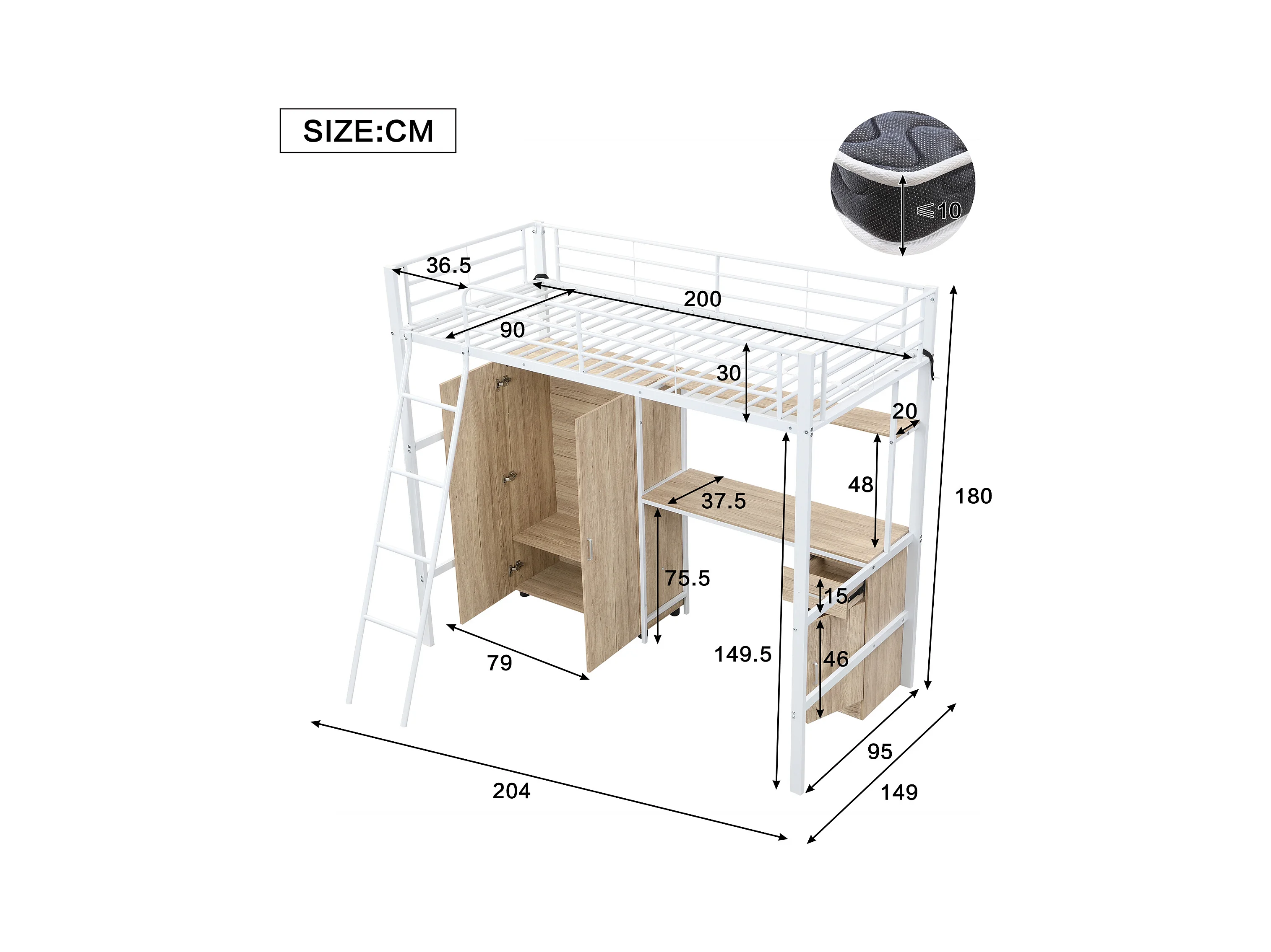 Lit mezzanine pour enfant - 90 x 200 cm - avec table et armoire - rangement - fer + aggloméré - blanc