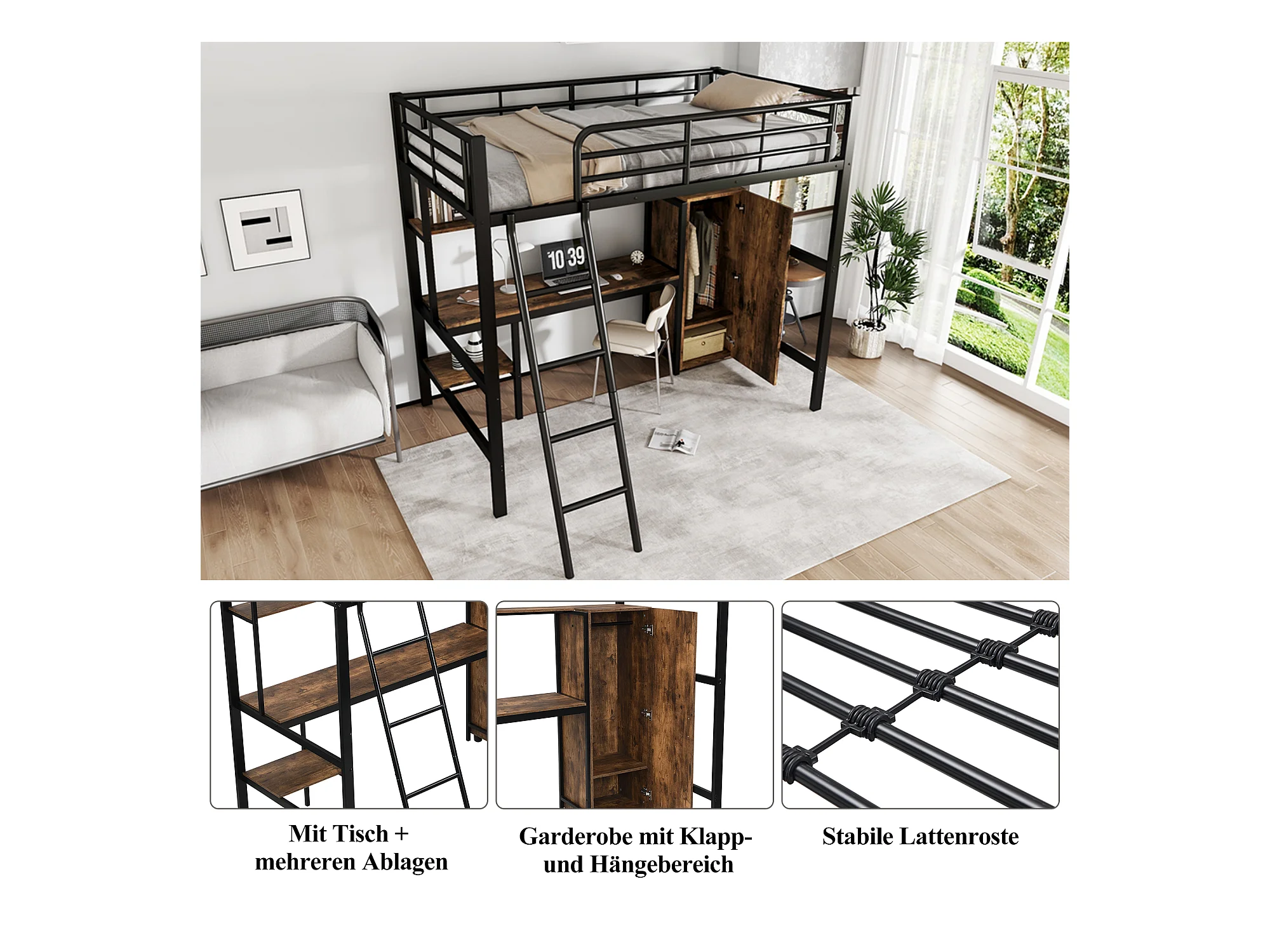 Lit mezzanine pour enfant - 90 x 200 cm - avec table et armoire - rangement - fer + aggloméré - noir