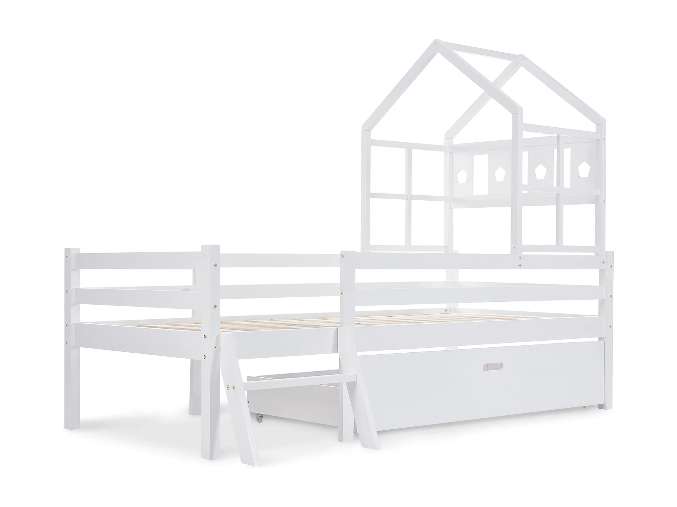 Lit mezzanine pour enfants avec échelle et tiroirs, lit en bois massif avec protection contre les chutes, 90x200 cm, blanc (dimensions : 207x97x159 cm)
